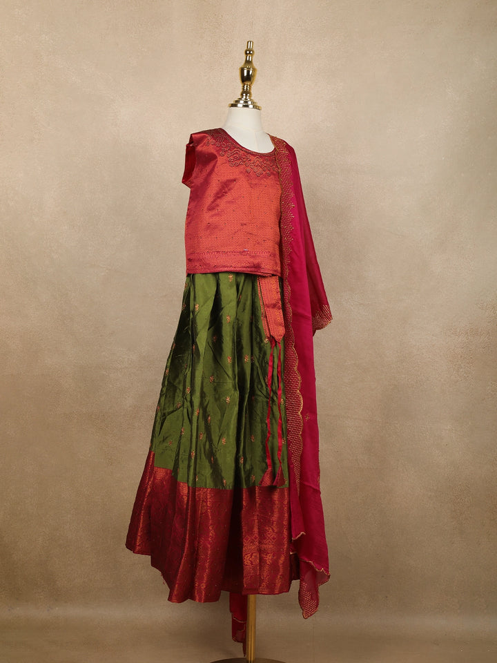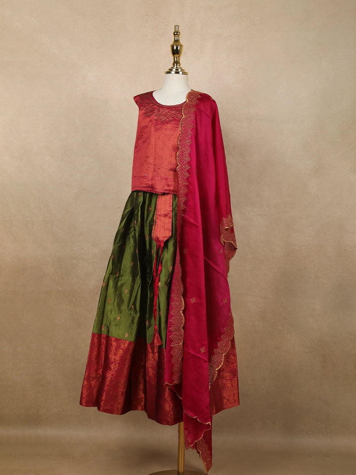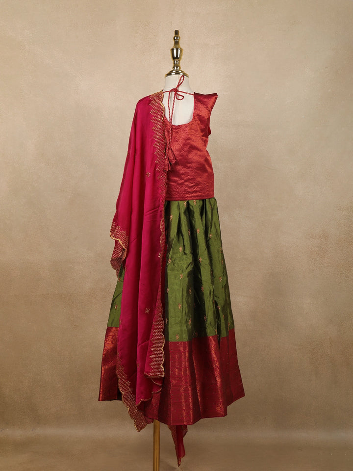 Maroon And Green Floral Zari Woven Raw Silk Pattu Pavadai with Dupatta