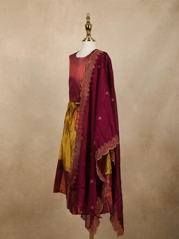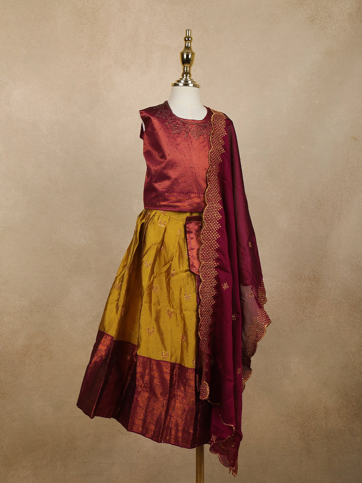 Maroon And Mustard Yellow Zari Woven Raw Silk Pattu Pavadai With Dupatta