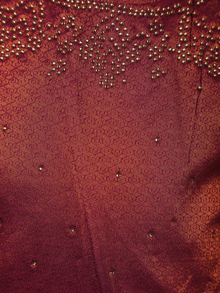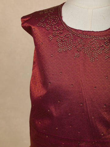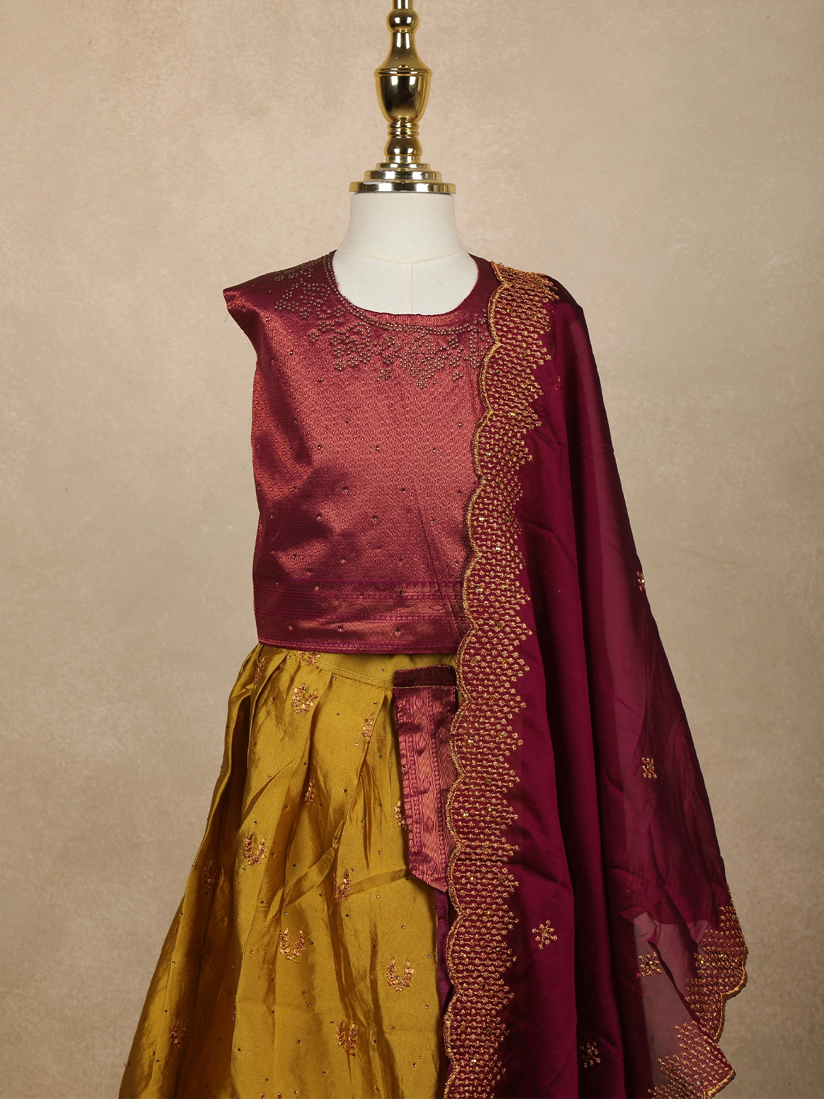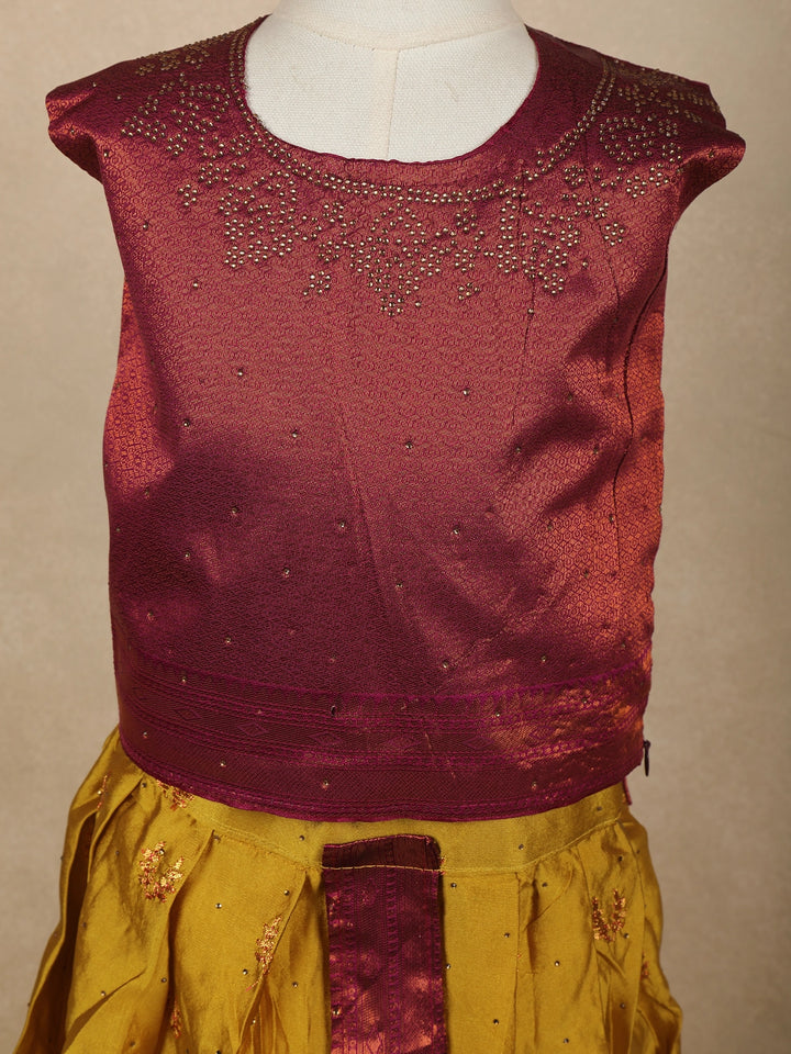 Let your little one shine in ethnic splendor with this Maroon and Mustard Yellow Raw Silk Pattu Pavadai Set. The maroon blouse features intricate bead embroidery around the neckline, adding a subtle shimmer to its lustrous silk fabric. It comes with a charming back tie-up that enhances both comfort and elegance.