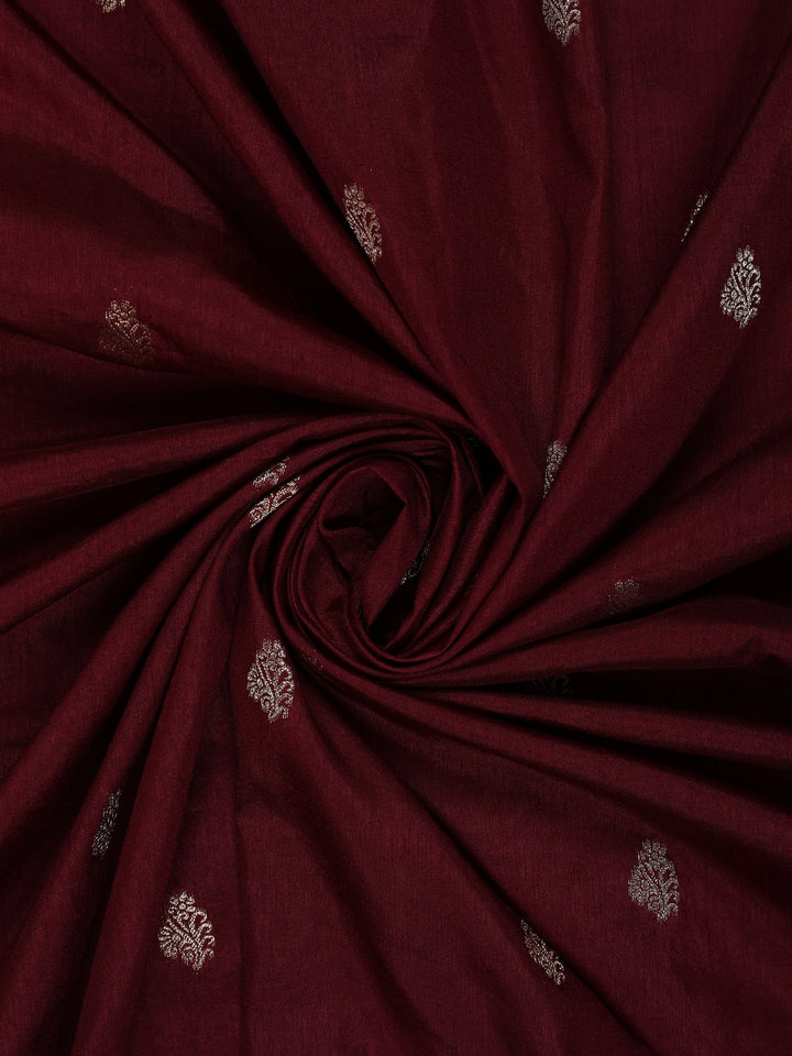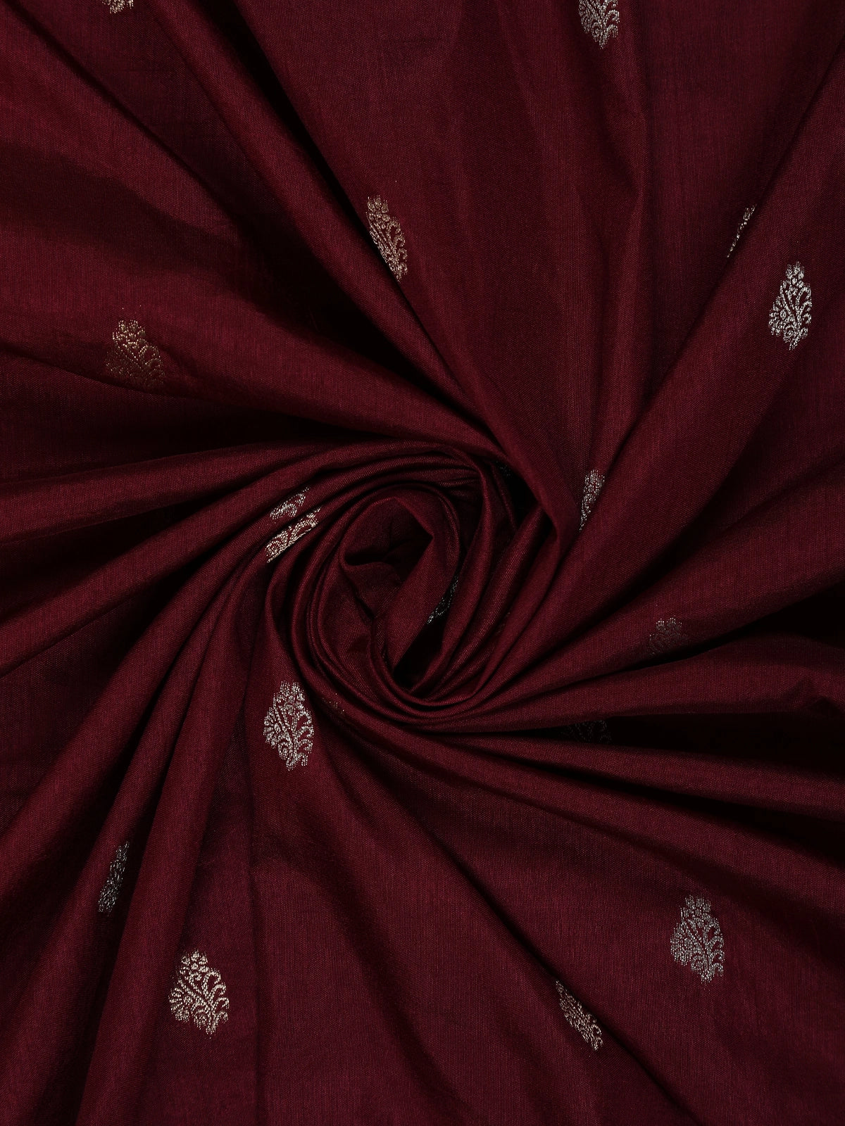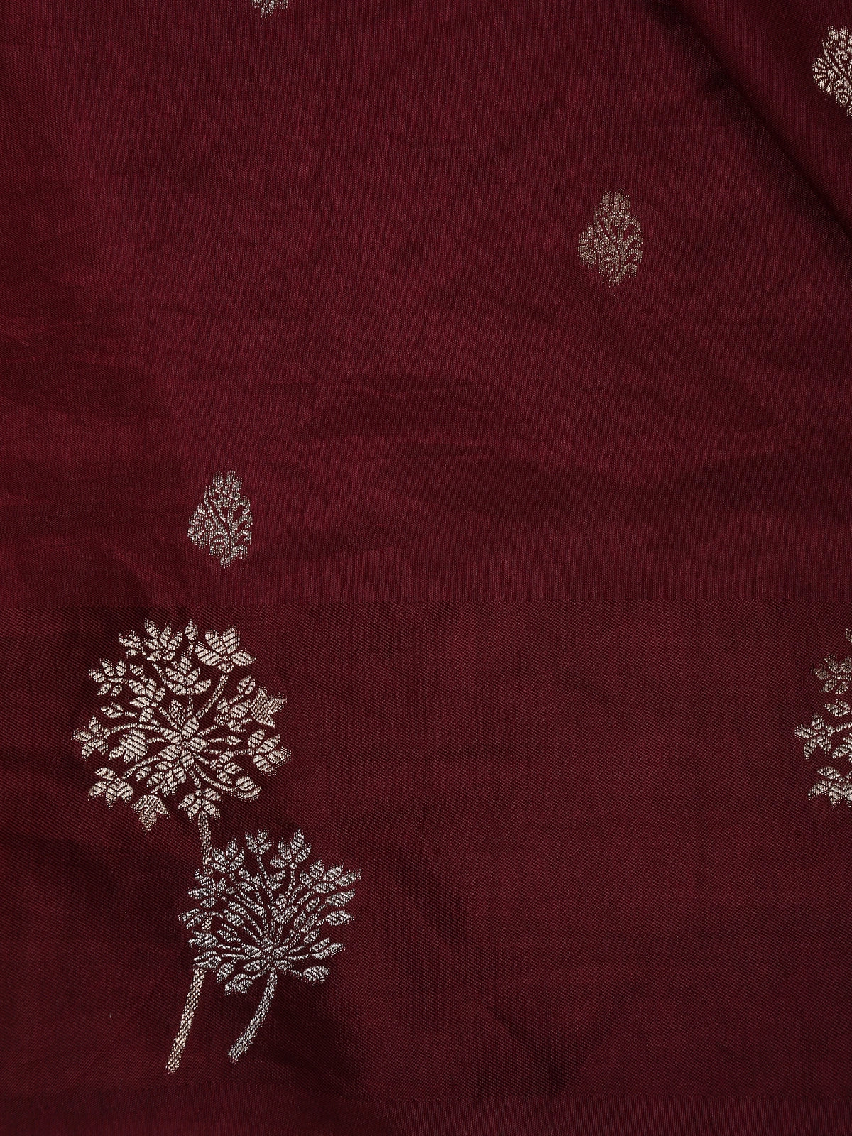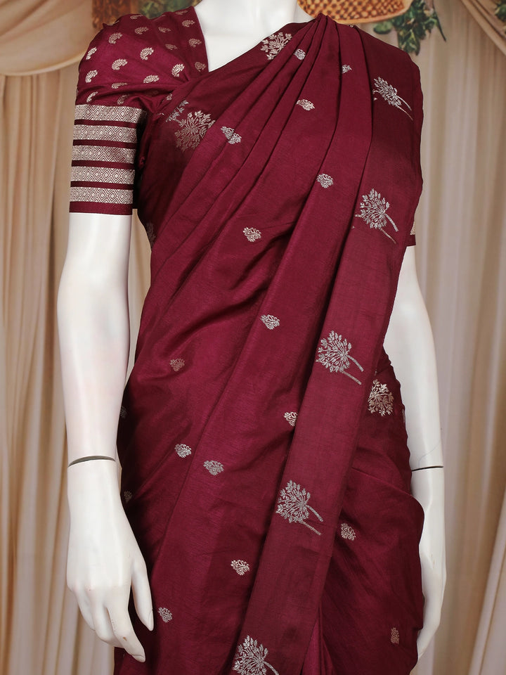 Exude timeless elegance in this Maroon Semi Banarasi Silk Saree, a beautiful expression of heritage craftsmanship and festive charm. The saree features intricate zari-woven butta motifs, creating a subtle shimmer that enhances the richness of the deep maroon hue.