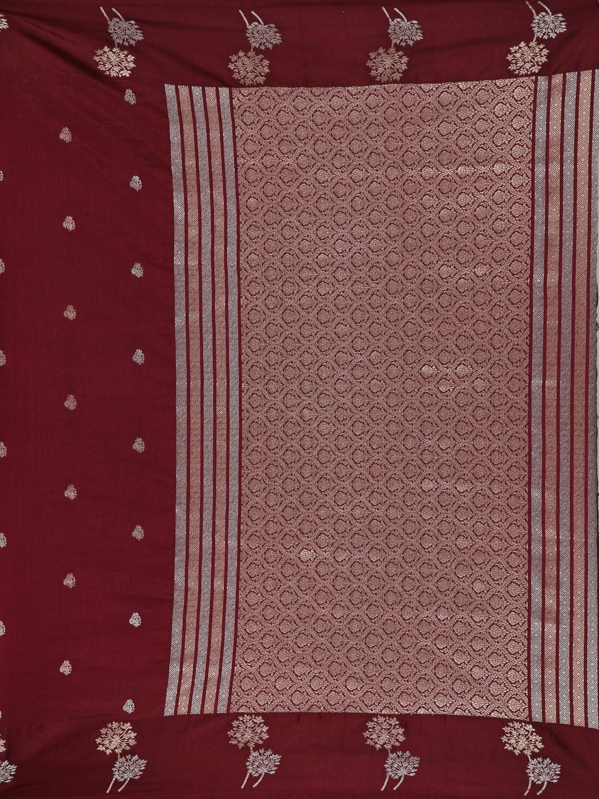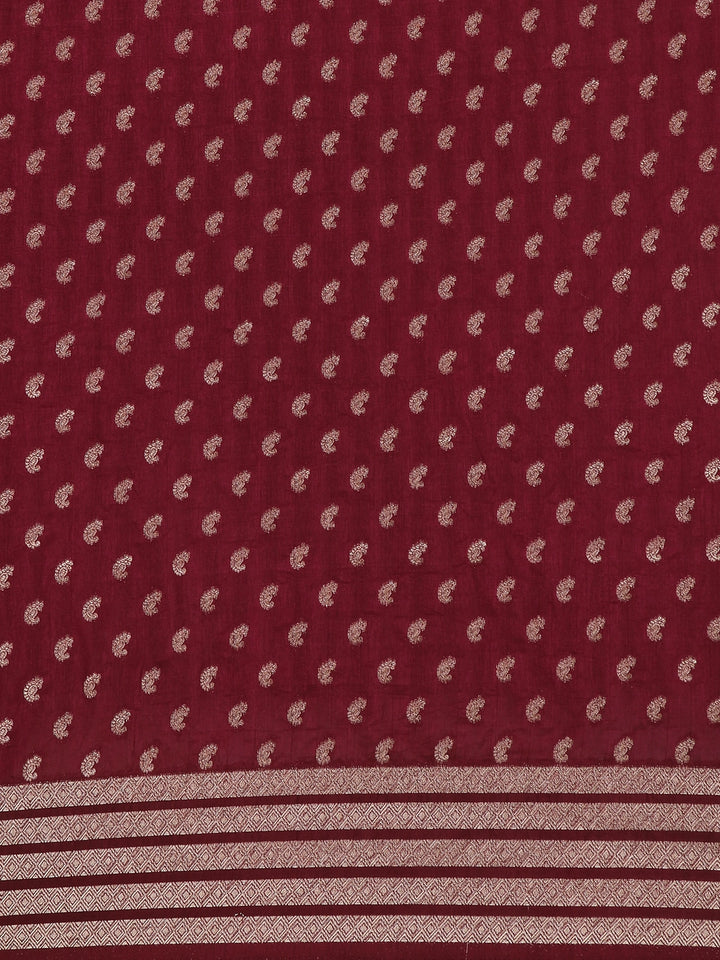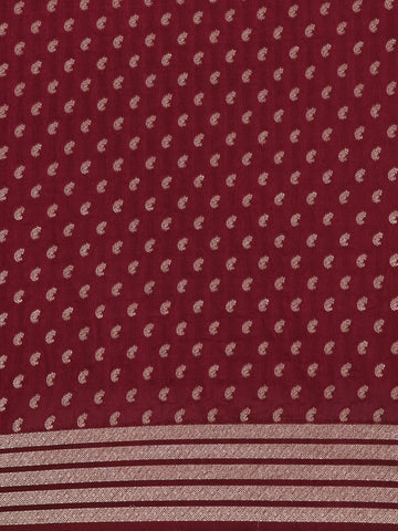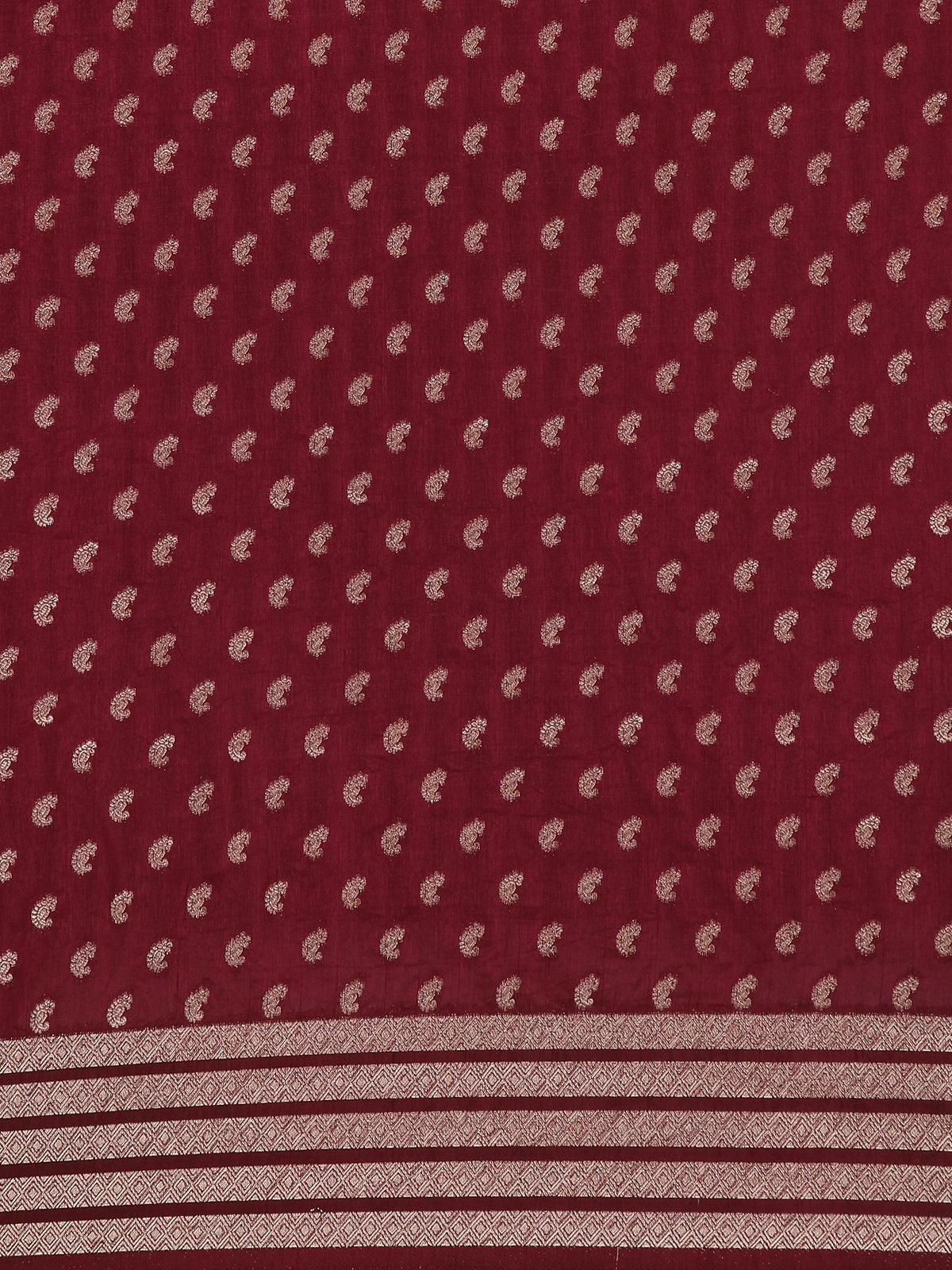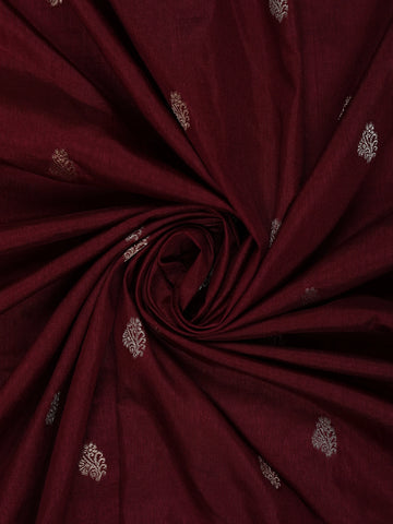 Exude timeless elegance in this Maroon Semi Banarasi Silk Saree, a beautiful expression of heritage craftsmanship and festive charm. The saree features intricate zari-woven butta motifs, creating a subtle shimmer that enhances the richness of the deep maroon hue.