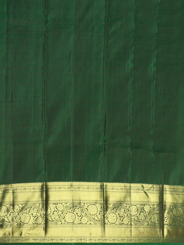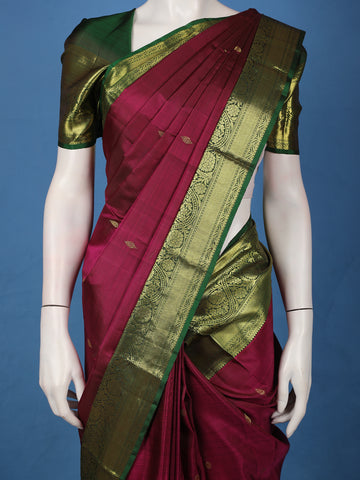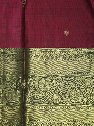 Step into regal elegance with this Maroon Pure Kanchipuram Silk Saree, a timeless piece that reflects the grandeur of South Indian weaving tradition. The saree features a rich maroon body with a solid woven design, giving it a refined and classic appeal. The highlight lies in its contrast green zari border and pallu, intricately woven with golden detailing that adds a luxurious touch to the drape.