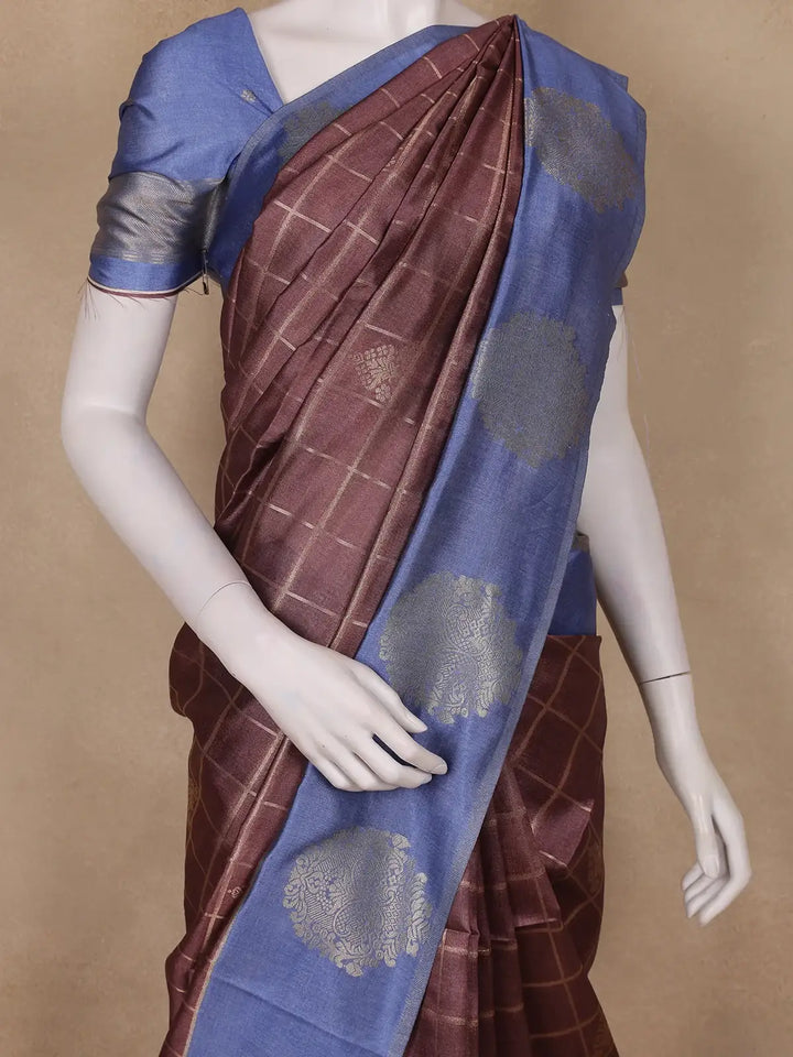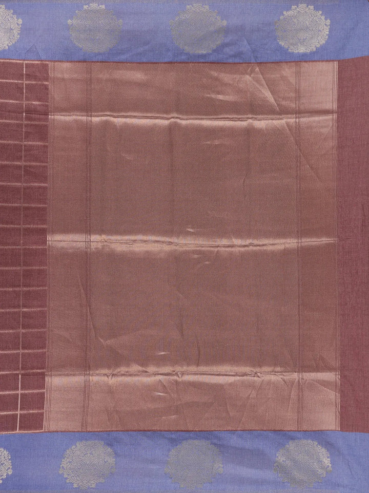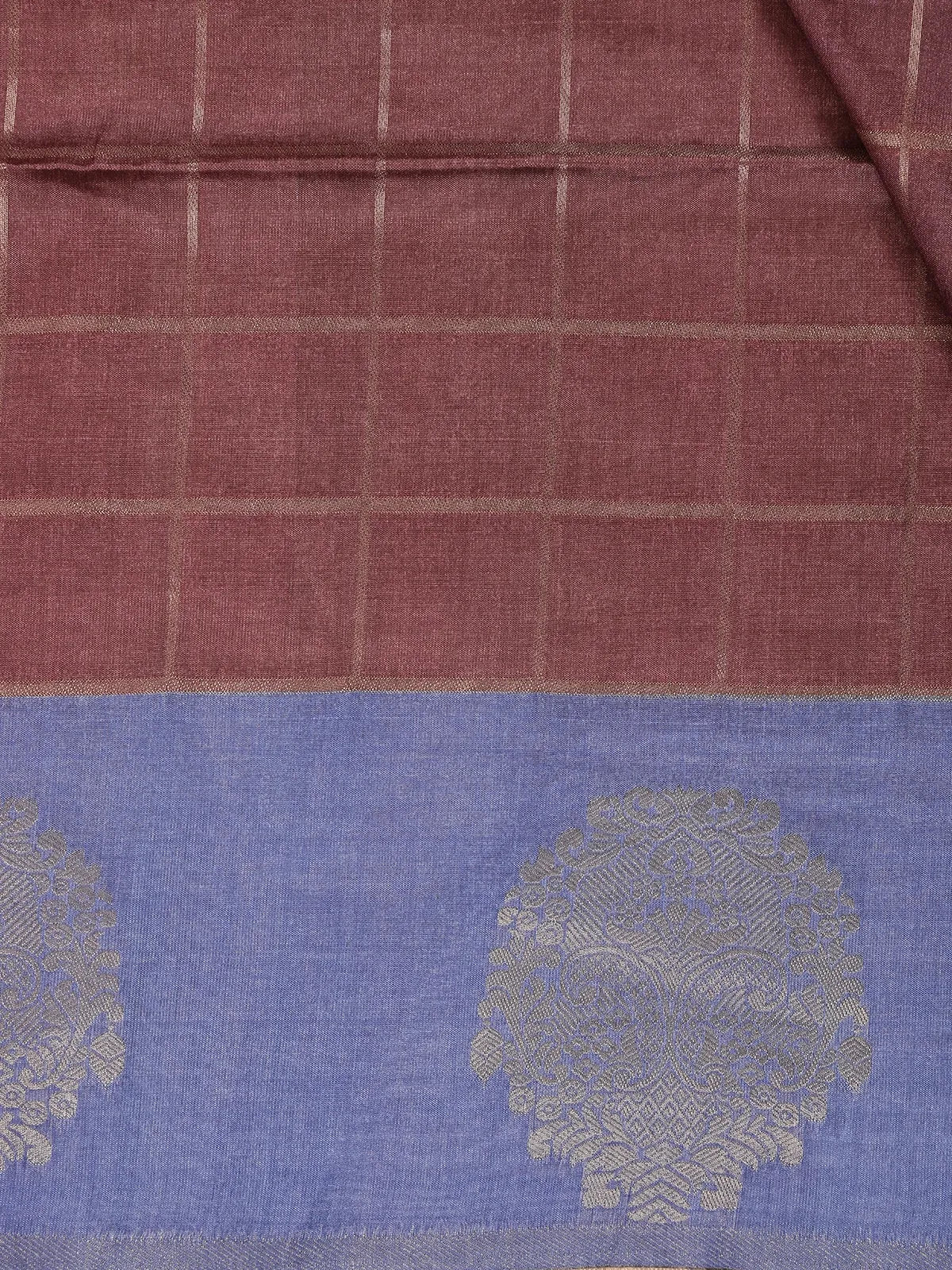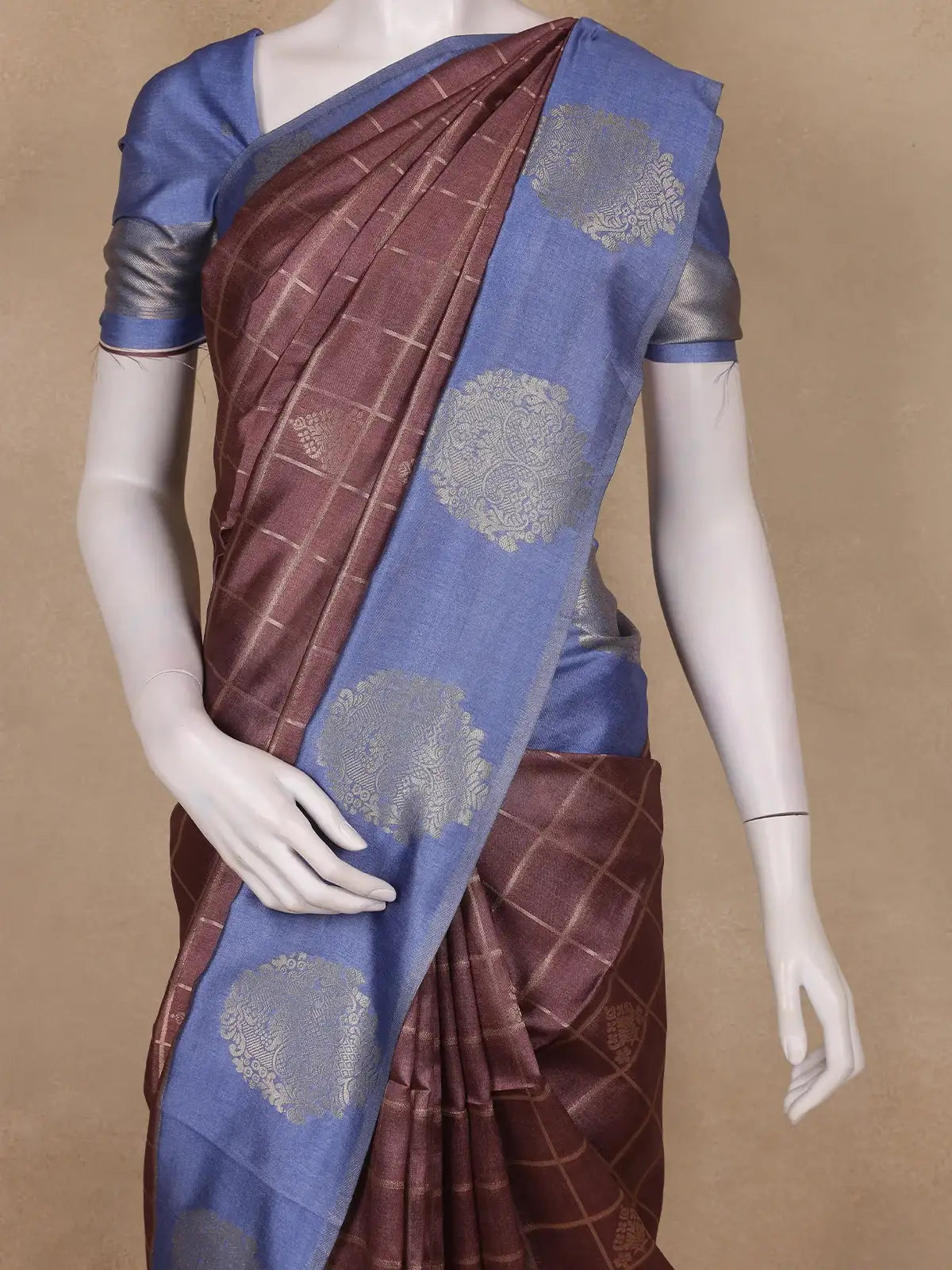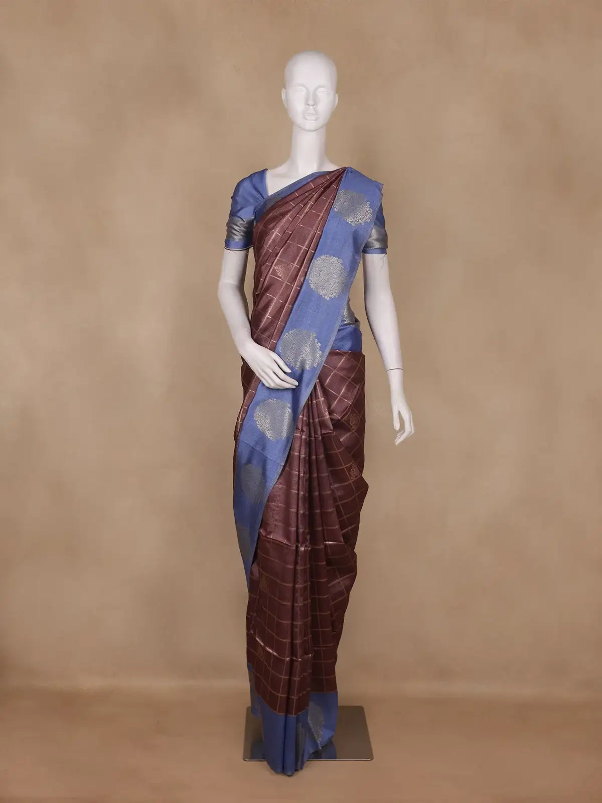 The body features a classic checked woven design, giving it a structured yet stylish appeal. The richness of maroon is beautifully complemented by a contrasting blue pallu and blouse, both adorned with delicate woven zari detailing that enhances the saree’s festive charm.