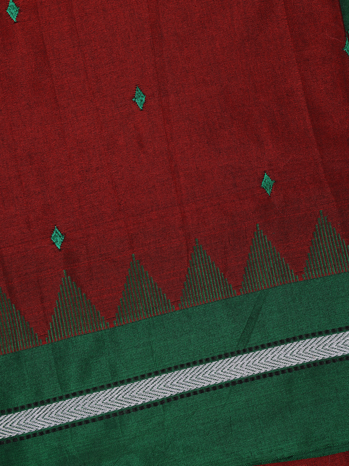 Maroon Diamond Motif Design Cotton Saree with Contrast Green Temple Border