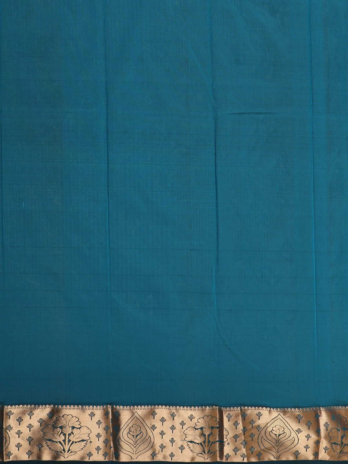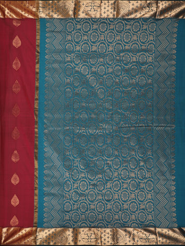 The saree is highlighted with a richly detailed gold zari border, featuring intricate traditional patterns that lend depth and regal charm to the overall look. The harmonious blend of the lustrous maroon base and shimmering zari work enhances the saree’s luxurious appeal while maintaining a refined, traditional aesthetic.