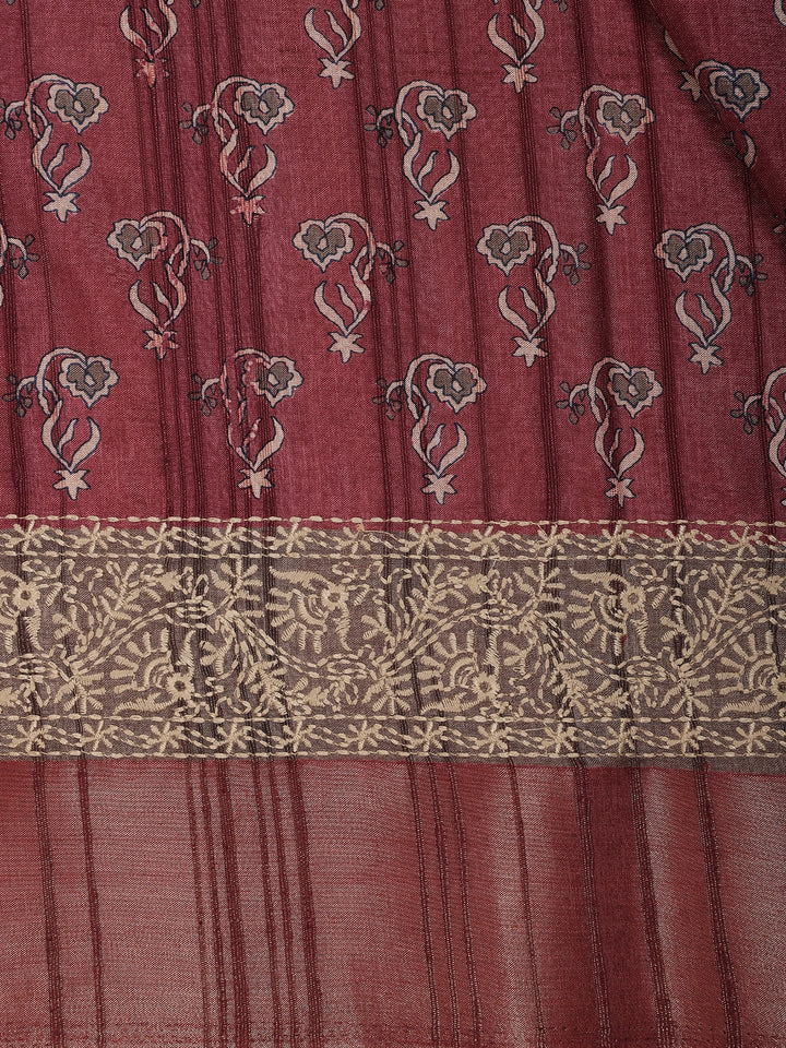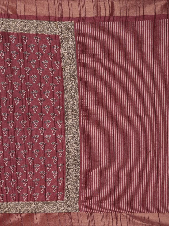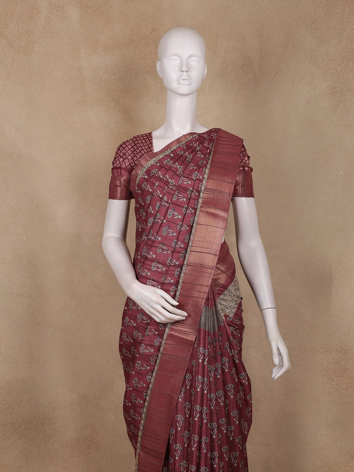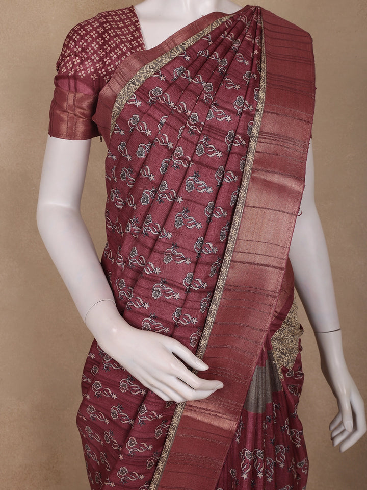 Drape yourself in refined elegance with this Maroon Floral Design Semi Tussar Saree, a perfect blend of traditional artistry and modern grace. Crafted from luxurious semi tussar fabric, this saree features delicate floral printed motifs that lend it an understated charm, ideal for festive gatherings and special occasions.