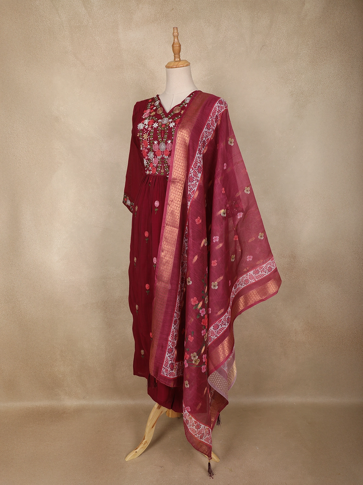 Paired with a matching bottom for a cohesive appearance, this set comes with a beautifully woven Banarasi-style dupatta embellished with floral motifs and gold zari borders. The dupatta adds depth, richness, and festive shine—making the ensemble suitable for both casual gatherings and special occasions.