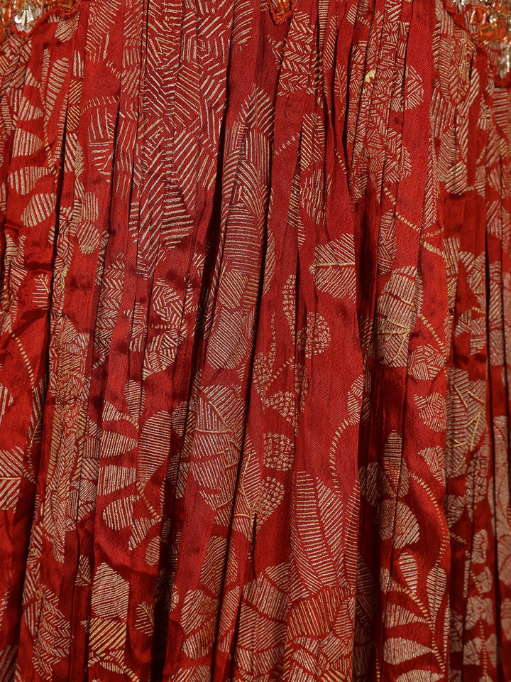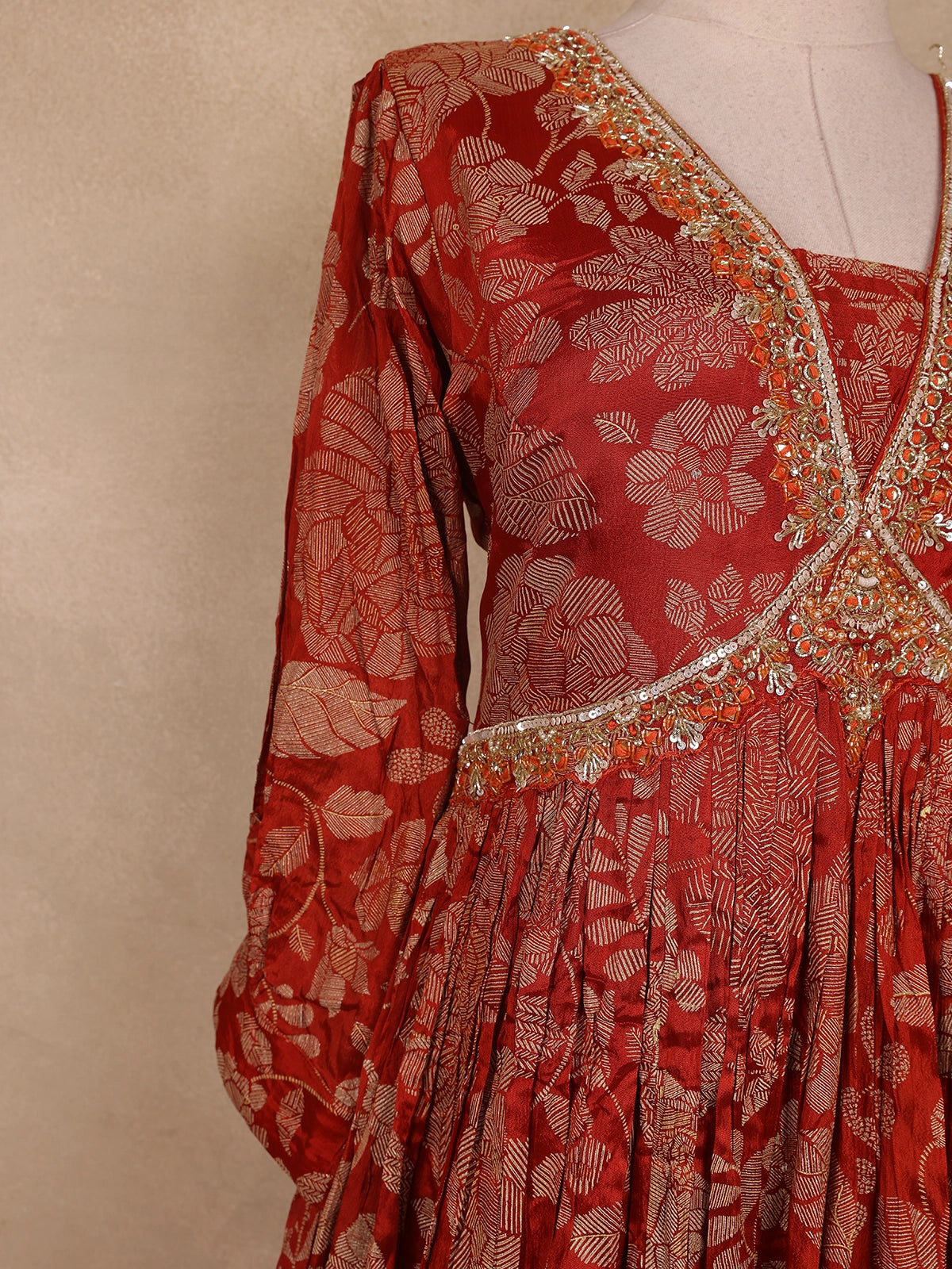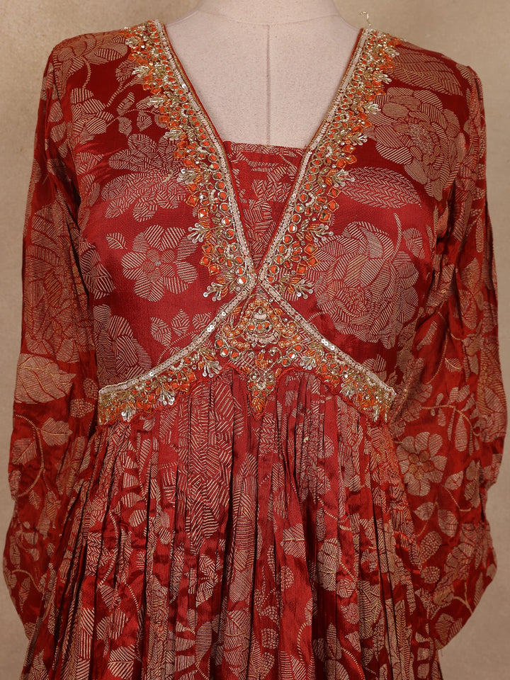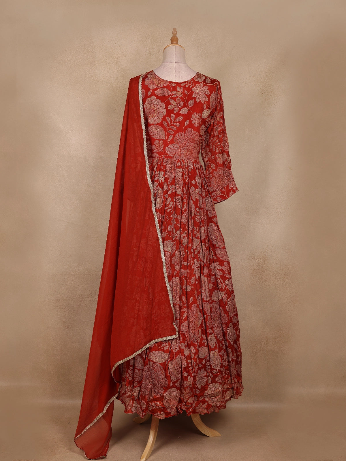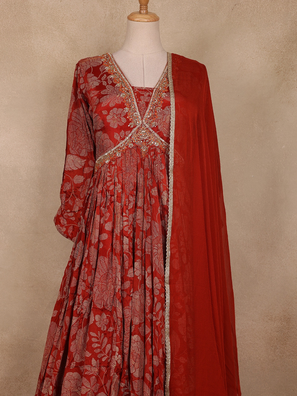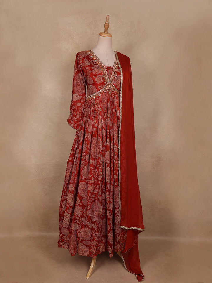 The gown features a V-neckline and 3/4 sleeves, accentuated with delicate embroidered detailing that enhances its festive appeal. The look is completed with a matching red dupatta bordered with subtle golden accents, adding an ethereal charm to your overall ensemble. Perfect for festivals, wedding functions, or evening celebrations, this outfit seamlessly blends traditional grace with modern elegance.