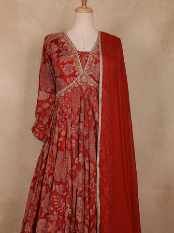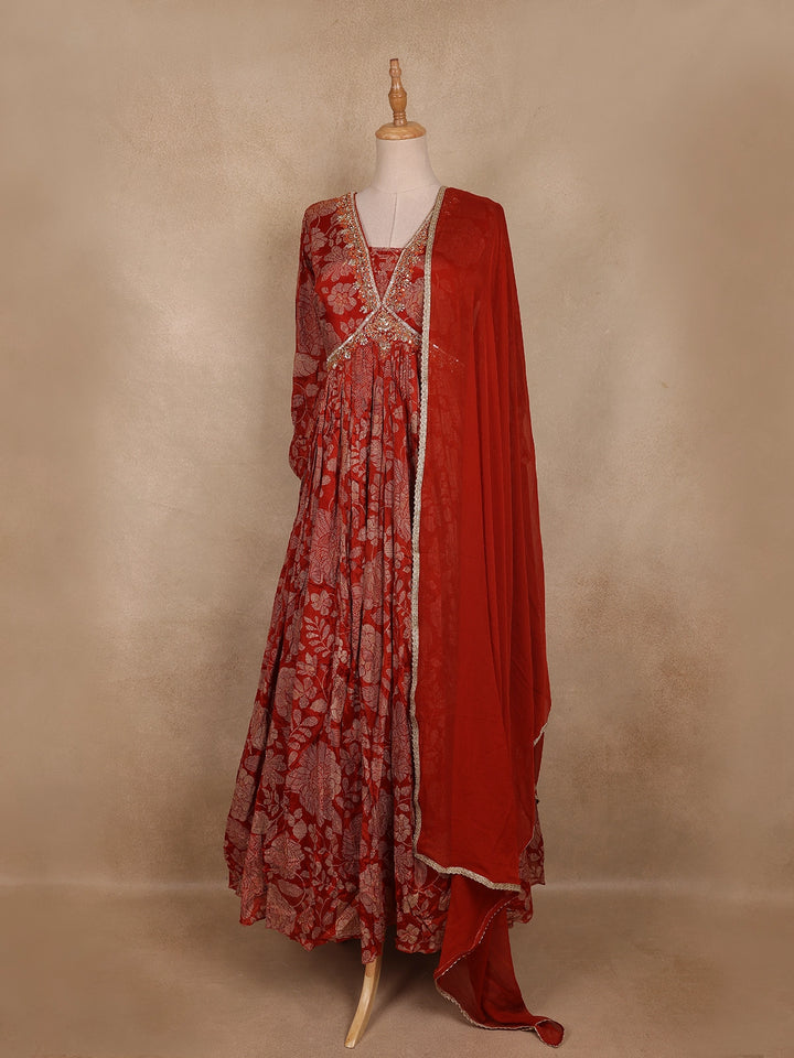 Radiate elegance and charm with this Maroon Floral Embroidered Design Georgette Gown with Dupatta, a perfect ensemble for festive and celebratory occasions. Crafted from flowy georgette fabric, this gown drapes beautifully, offering a regal and flattering silhouette. The vibrant red hue is adorned with intricate floral woven embroidery that adds a touch of luxury and sophistication.