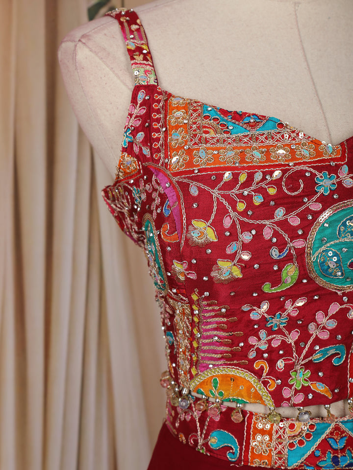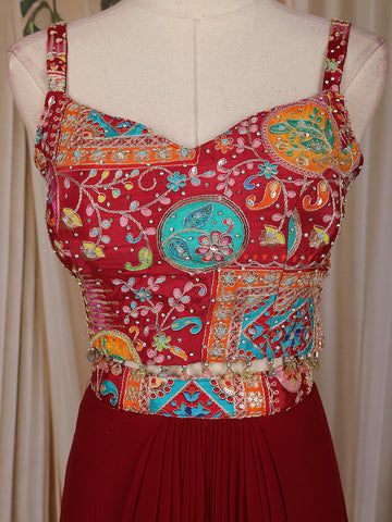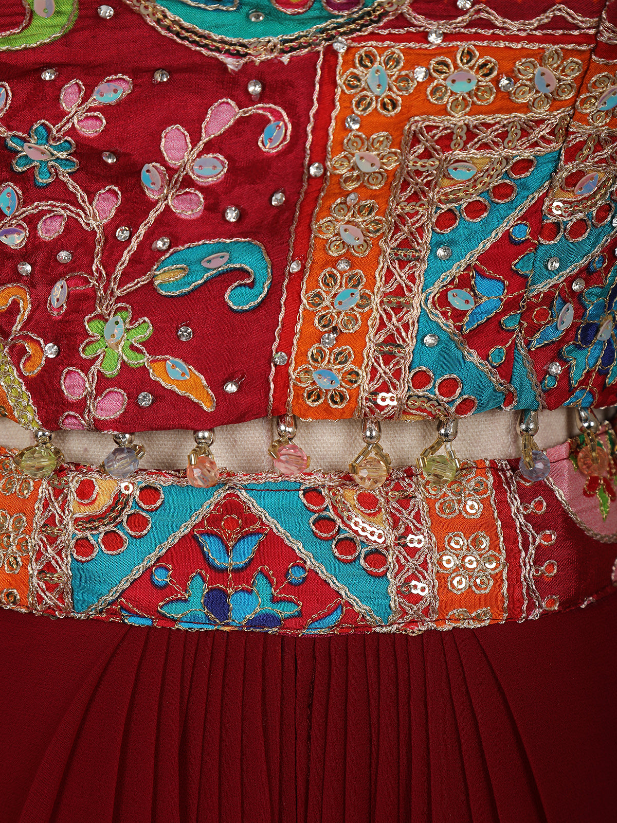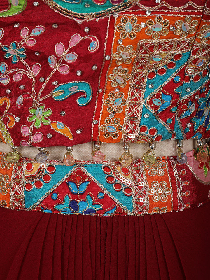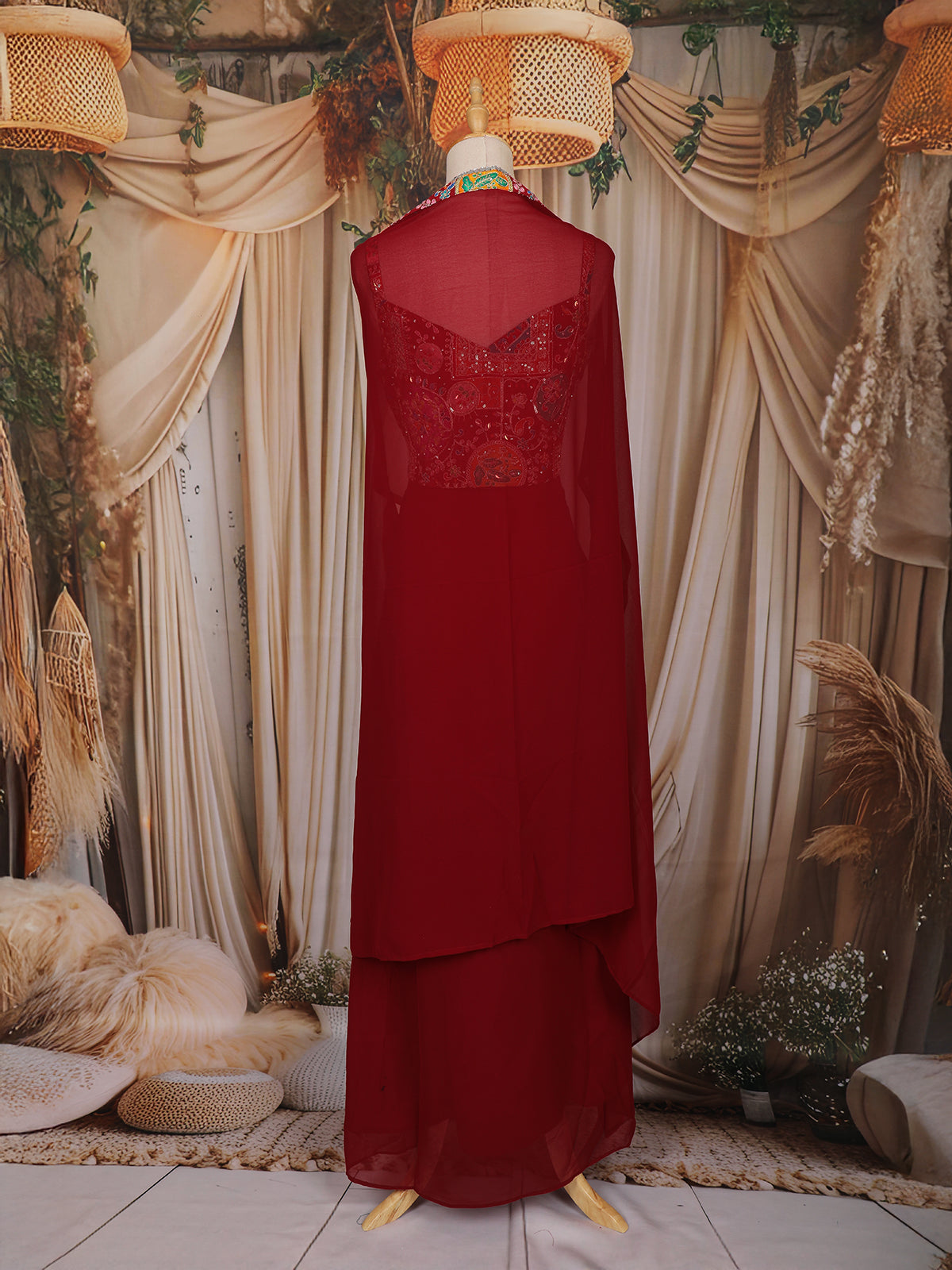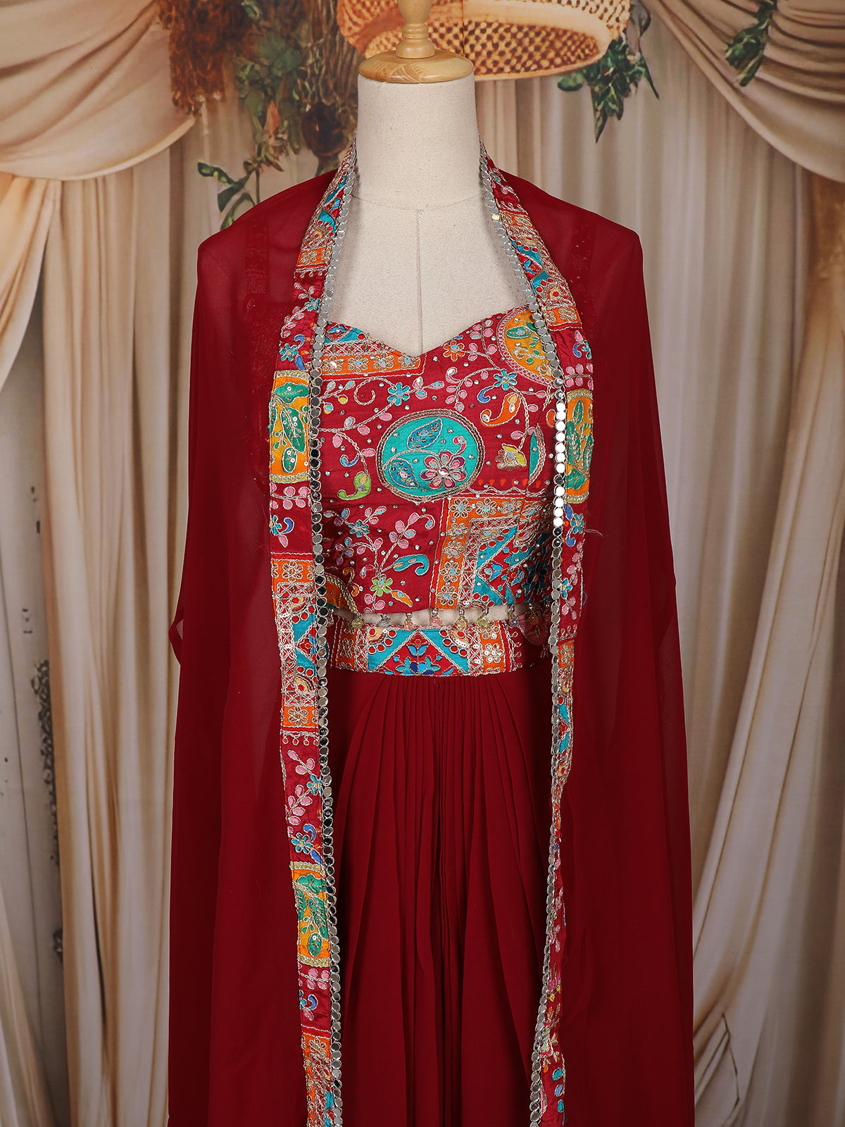 Bring vibrance and charm to any occasion with this Maroon Multicolor Embroidered Georgette Skirt Top with Cape Jacket, a perfect blend of ethnic elegance and contemporary appeal. The sleeveless sweetheart-neck blouse features exquisite multicolored embroidery inspired by traditional motifs, highlighted with mirror accents for a radiant festive finish.