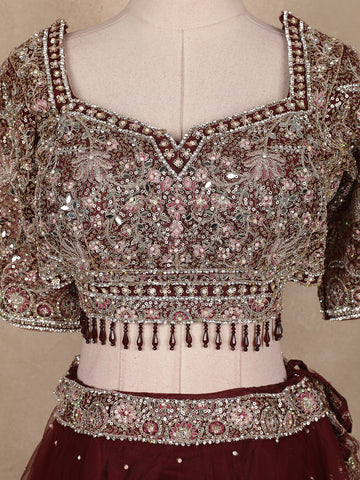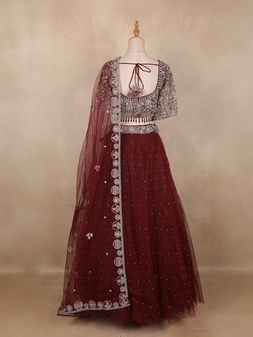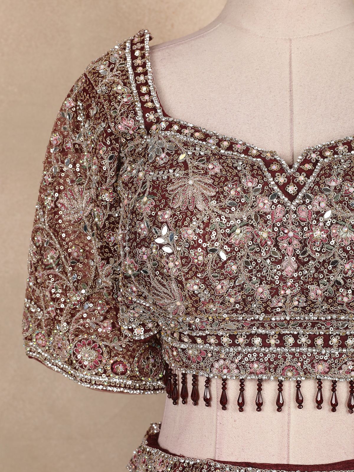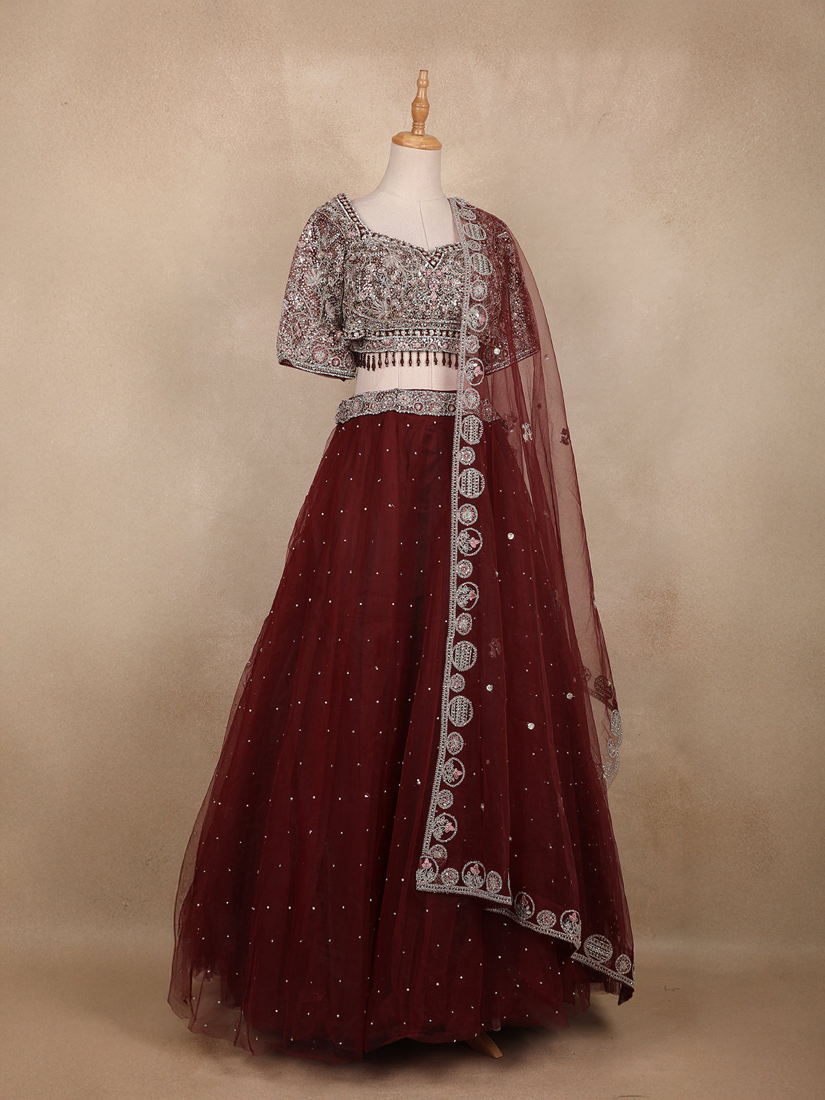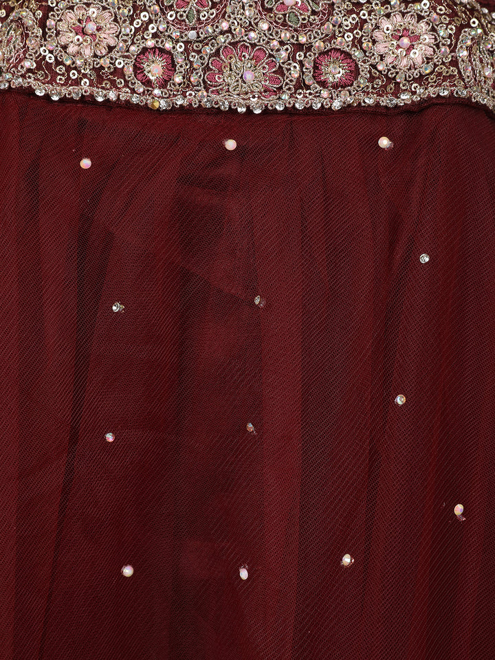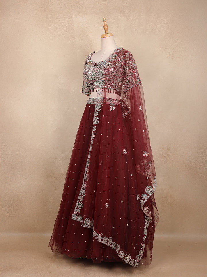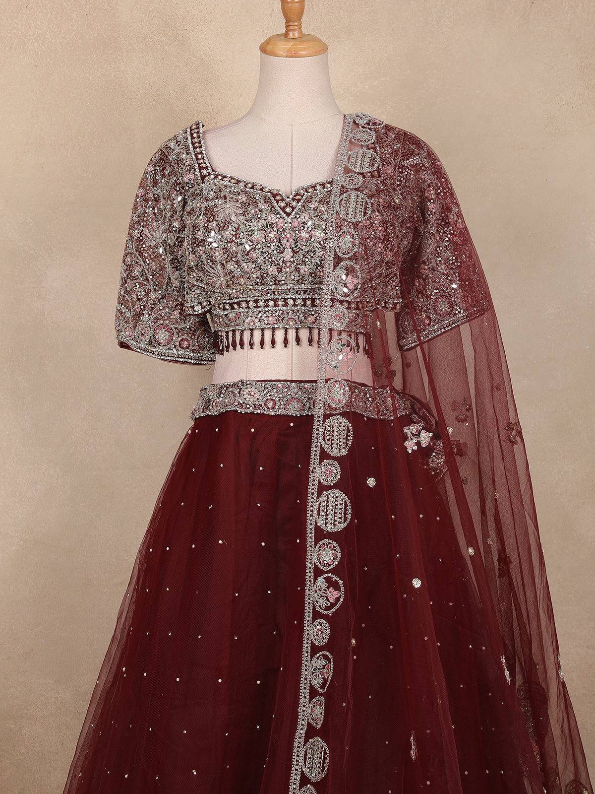 Exude timeless elegance with this Maroon Floral Embroidered Net Lehenga, a true statement piece that embodies festive grandeur and feminine charm. Crafted from premium net fabric, this ensemble is adorned with intricate floral embroidery, sequins, and bead embellishments, adding just the right touch of shimmer and sophistication.