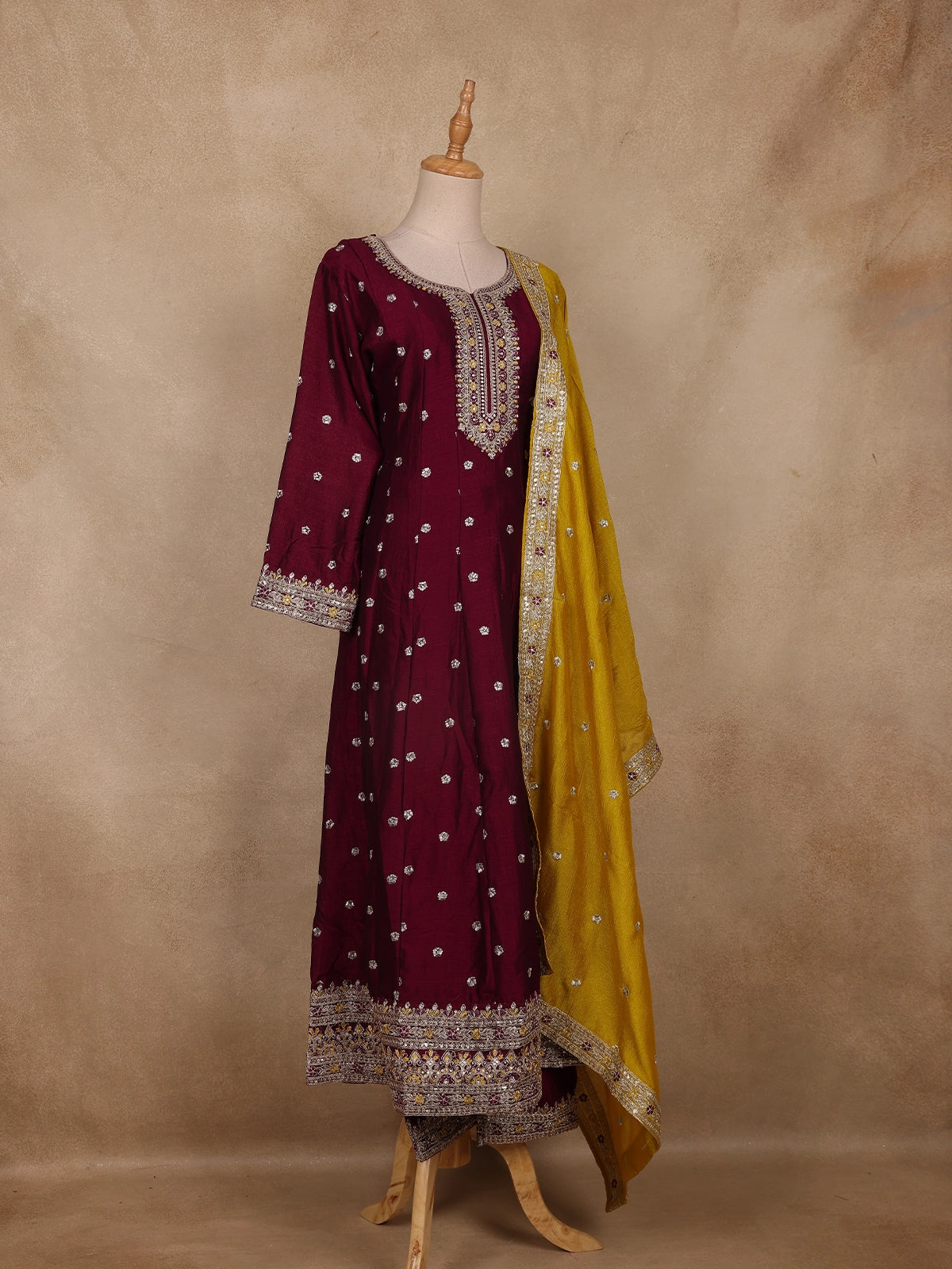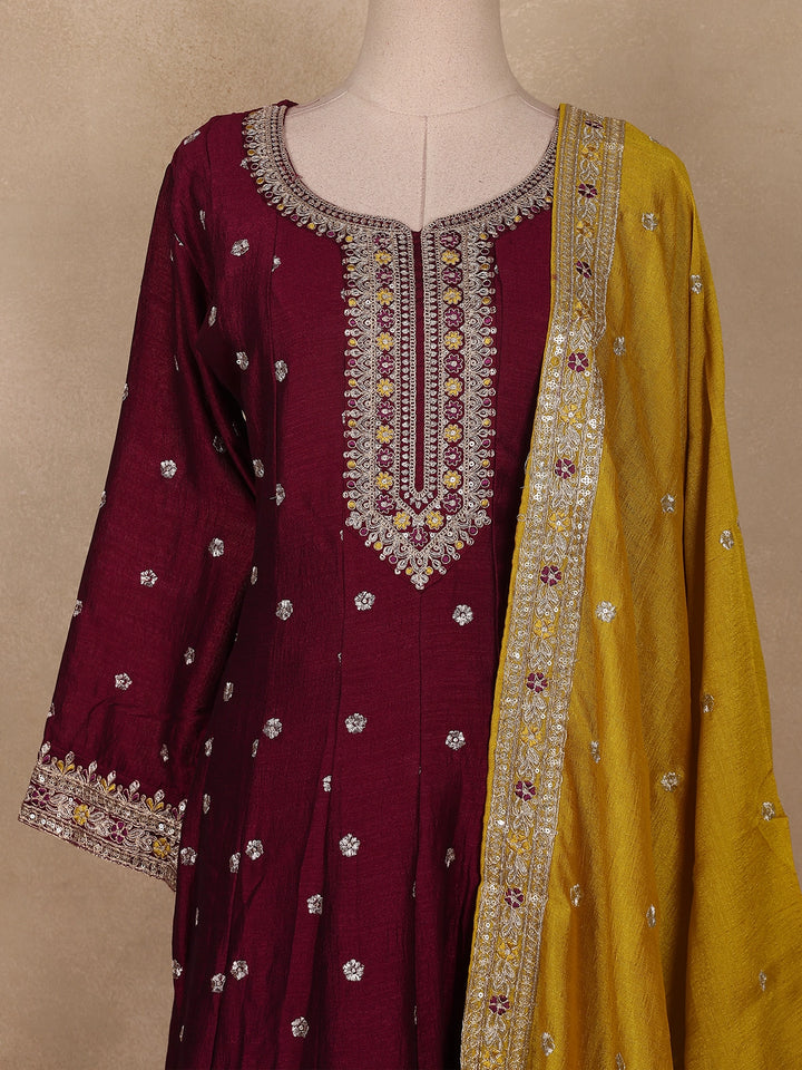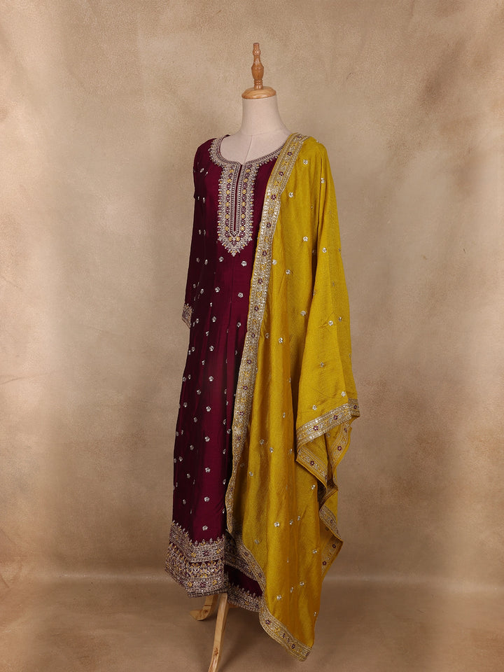 Maroon Floral Embroidered Silk Anarkali Suit with Mustard Dupatta