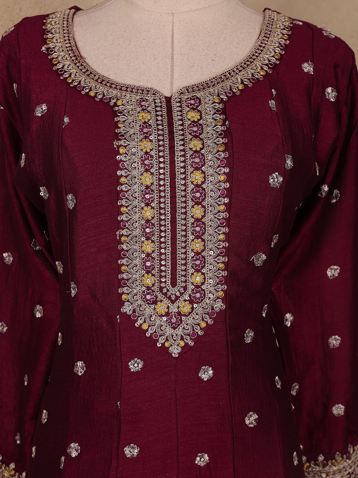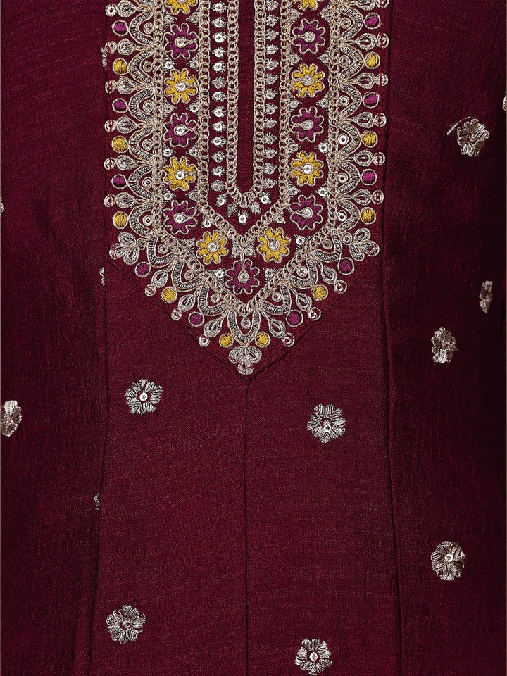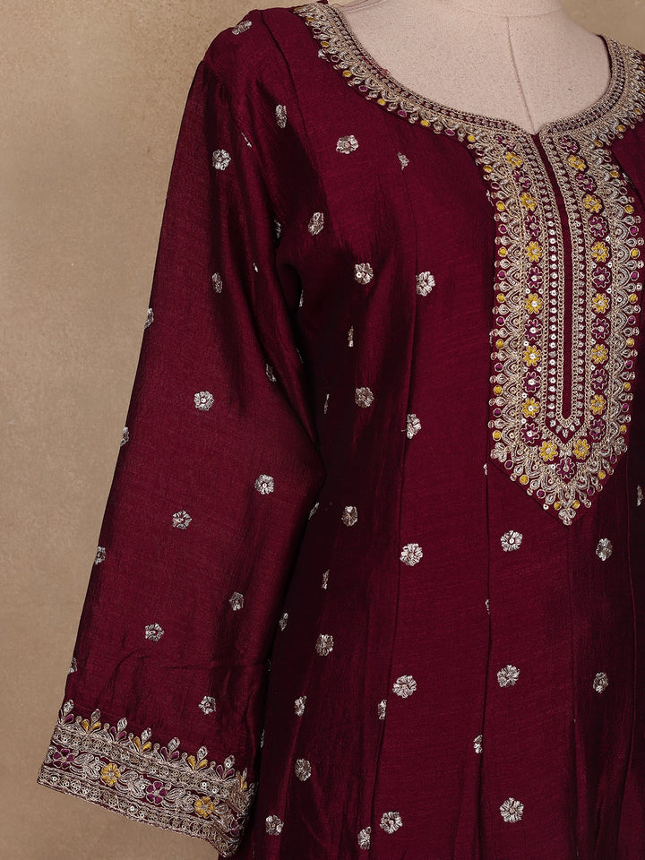 Exude royal charm in this exquisite Maroon Silk Anarkali Suit, intricately adorned with silver thread and mirror embroidery that sparkles with every move. The yoke and neckline feature beautifully detailed floral motifs in gold and maroon, accentuated by delicate zari and sequins work. The three-quarter sleeves and flared hemline are bordered with ornate embroidery, adding a touch of grandeur.