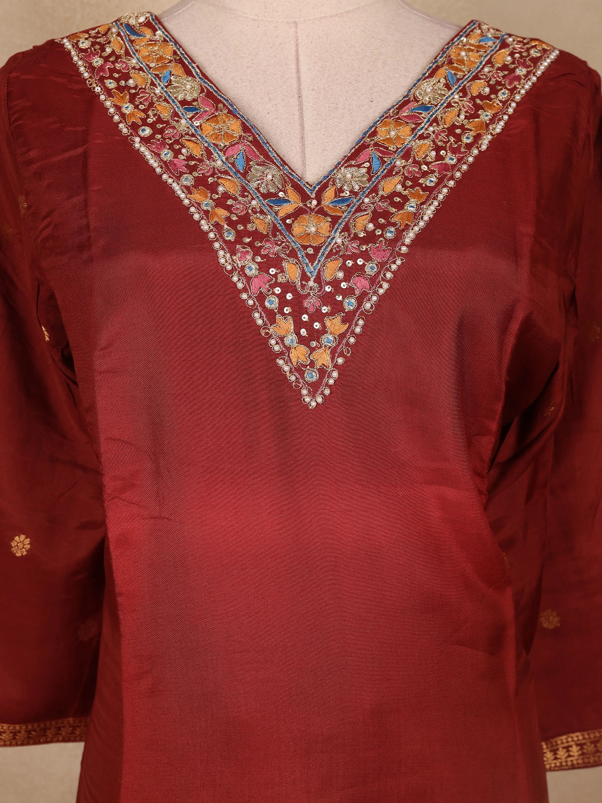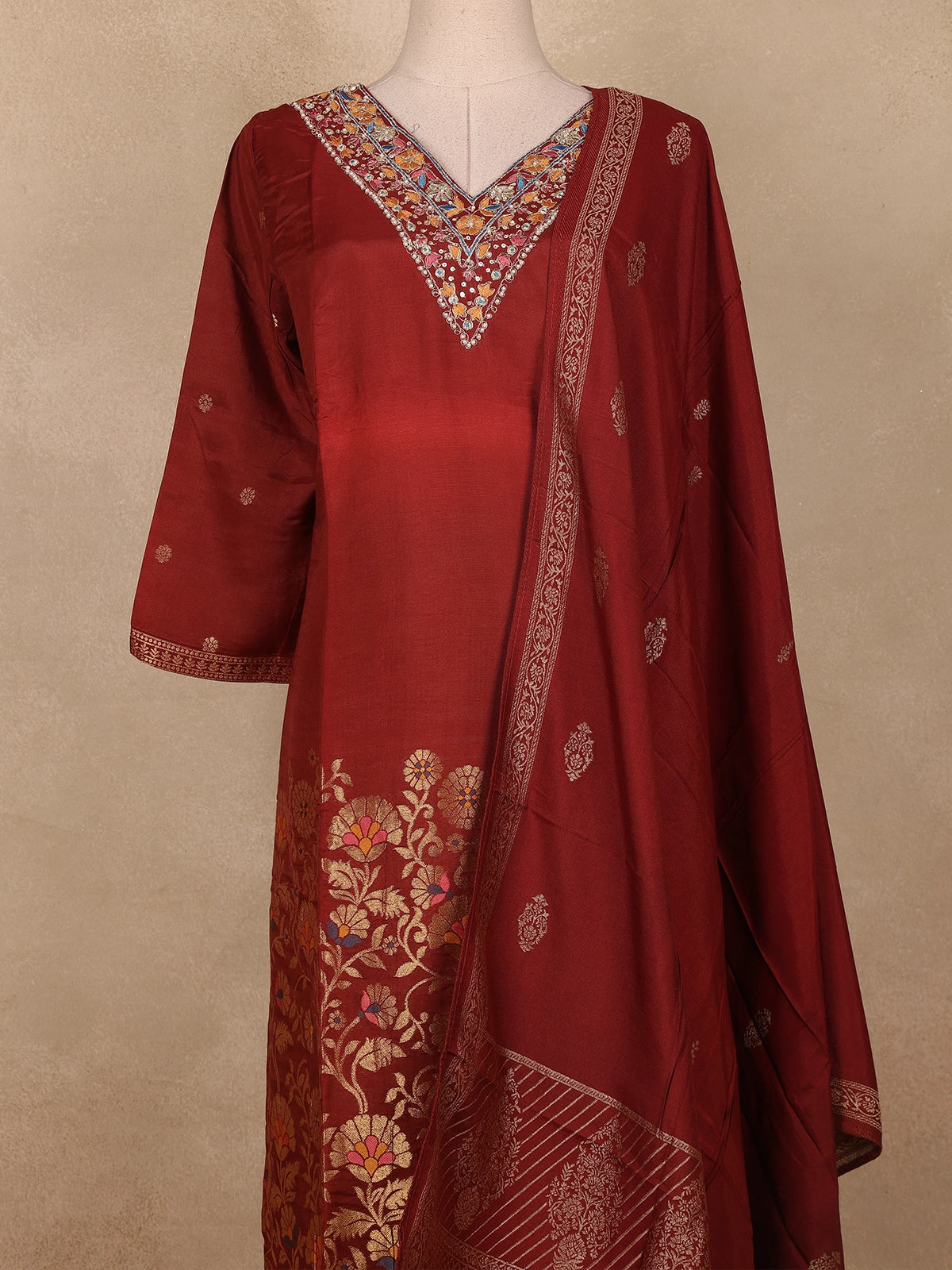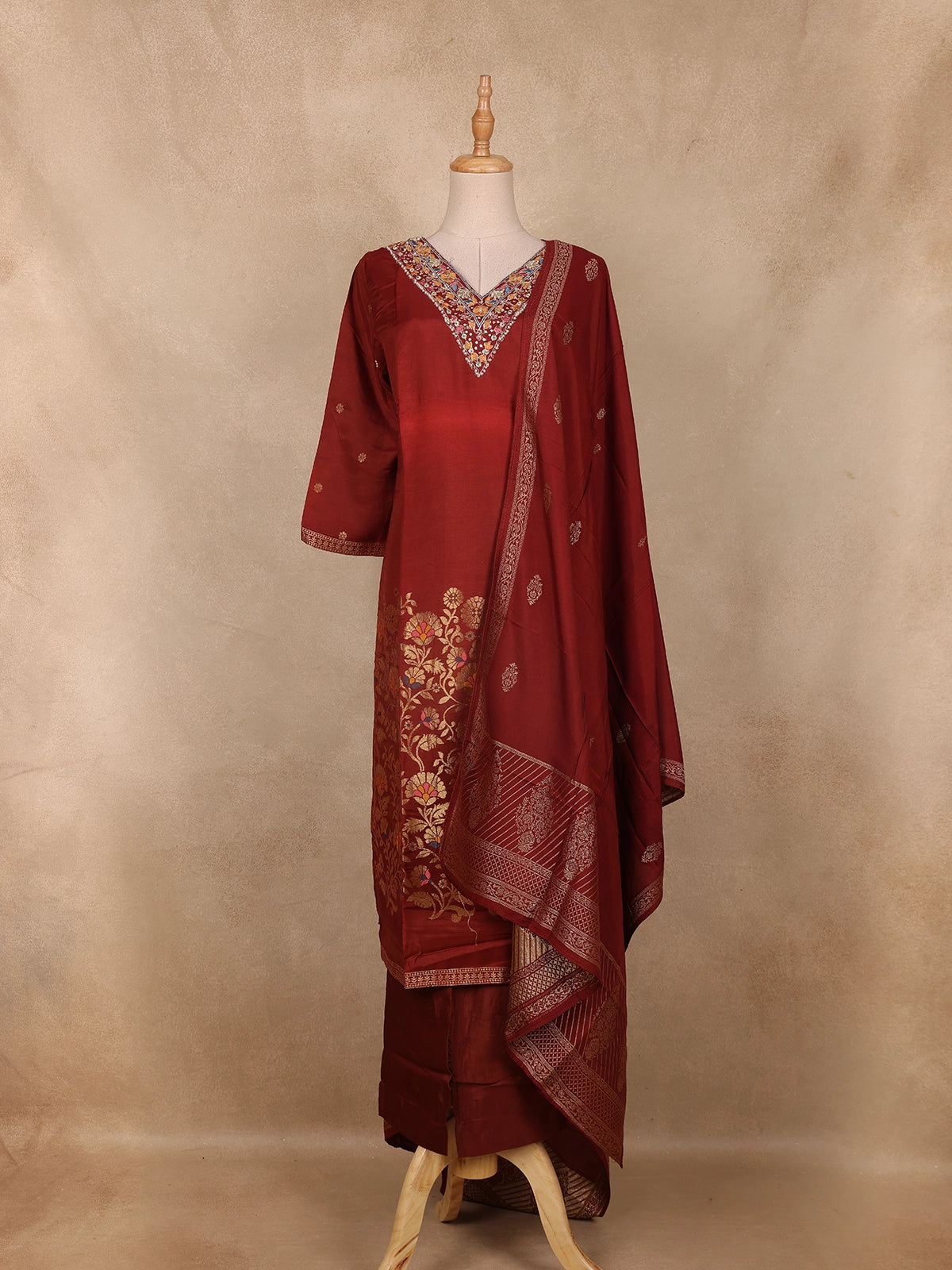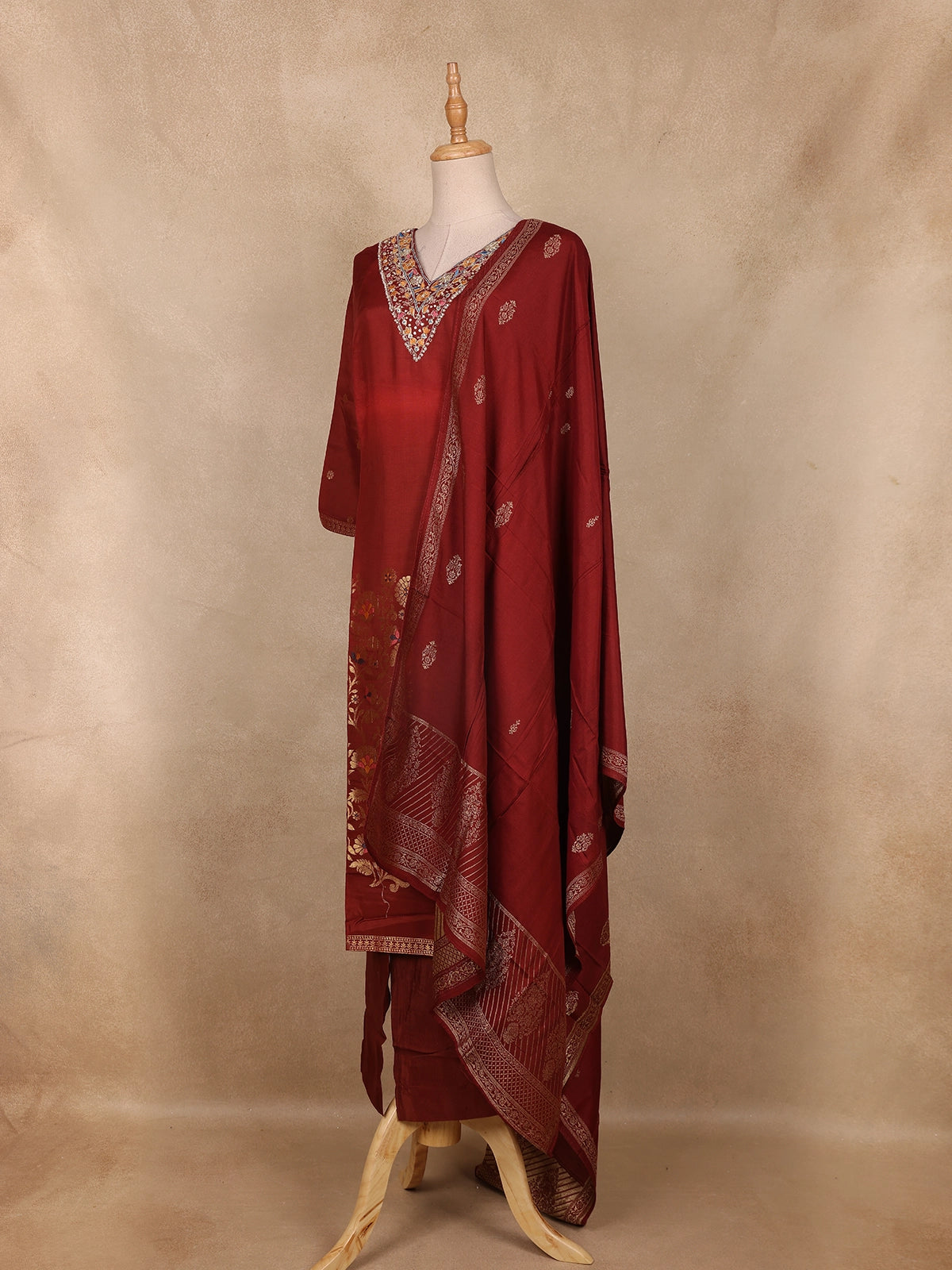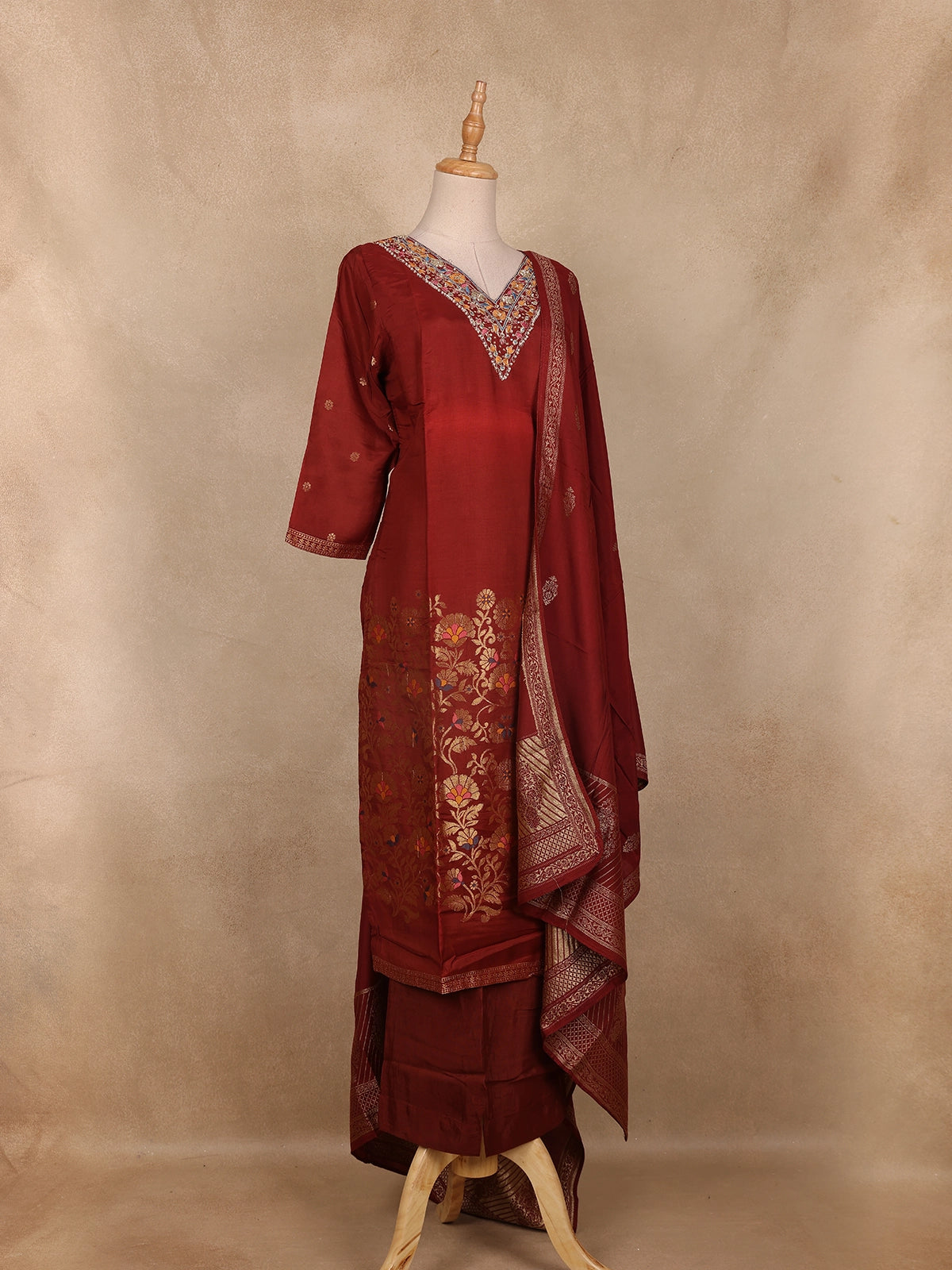 Maroon Floral Embroidered Silk Salwar Suit with Dupatta