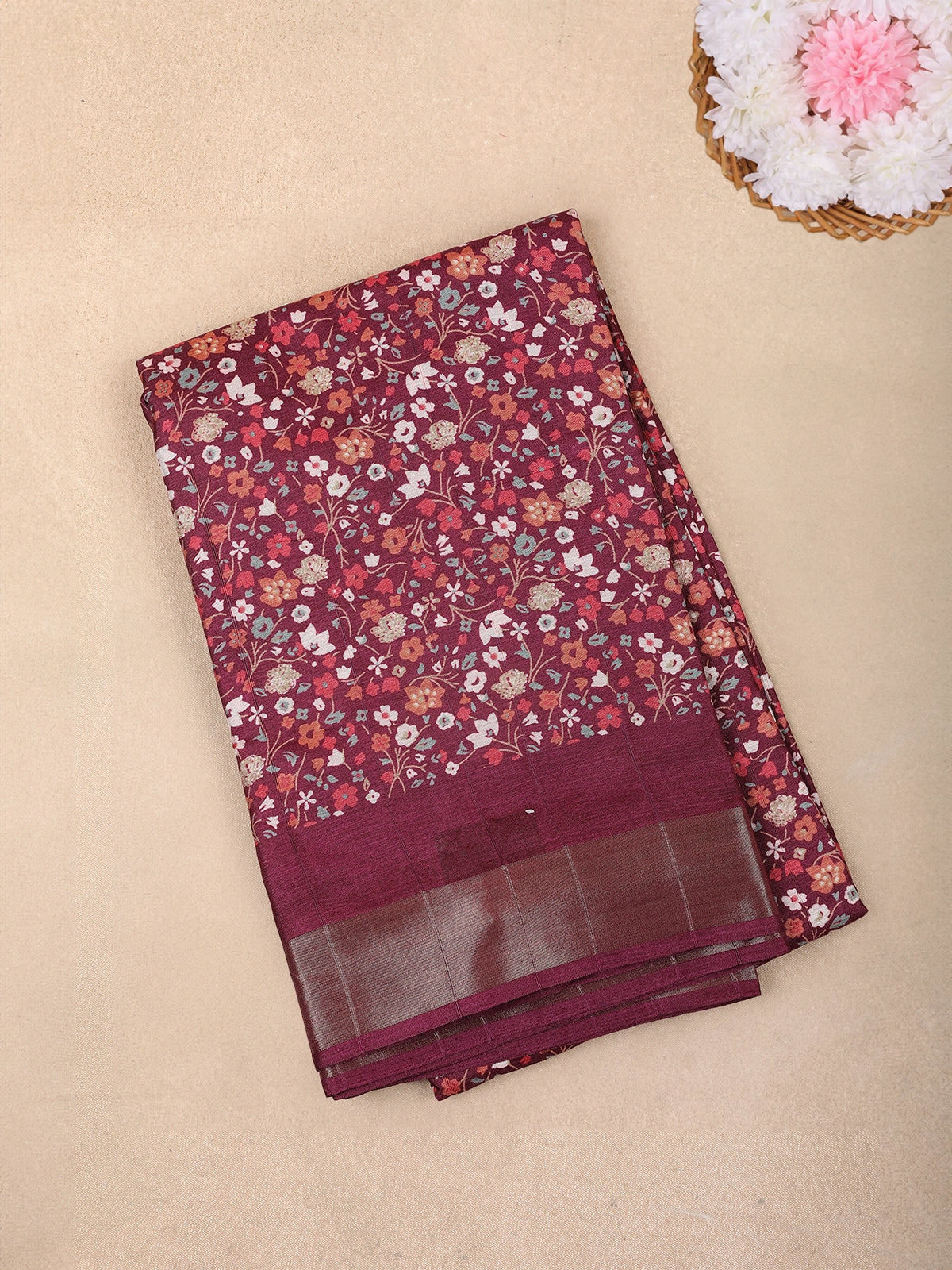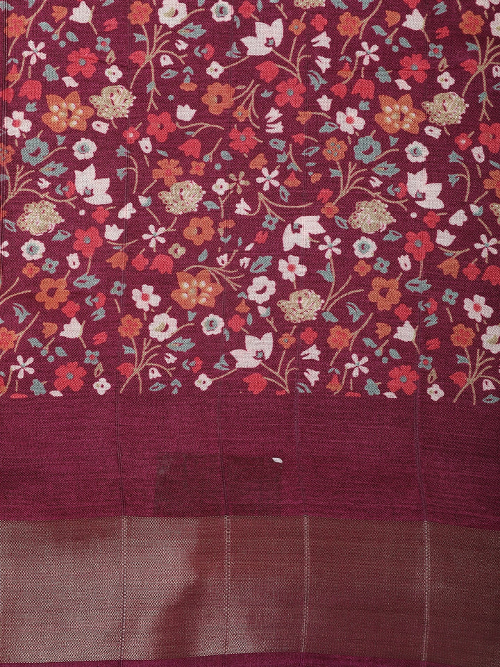 Maroon Floral Printed Chanderi Cotton Saree with Contrast Border