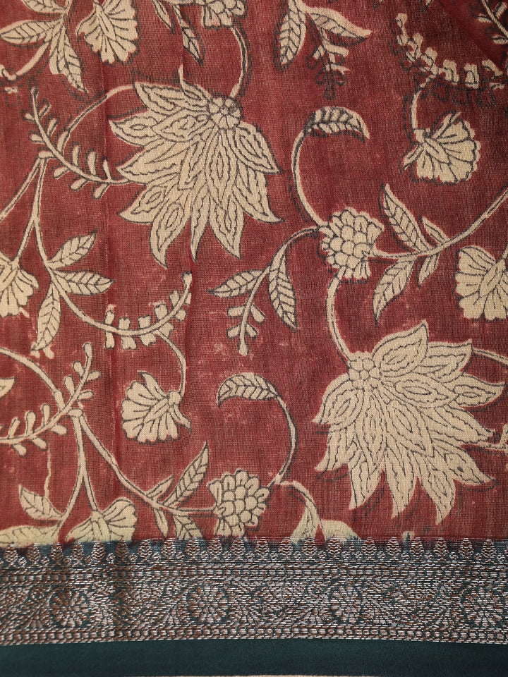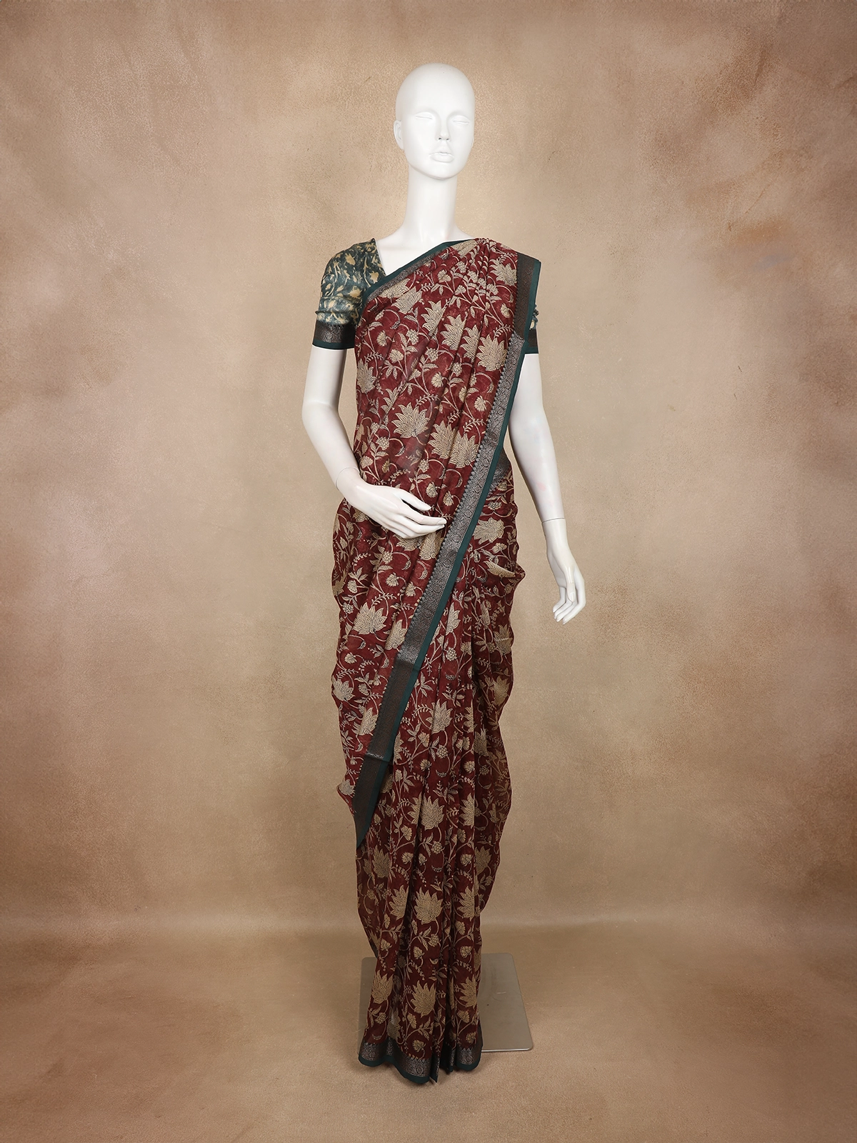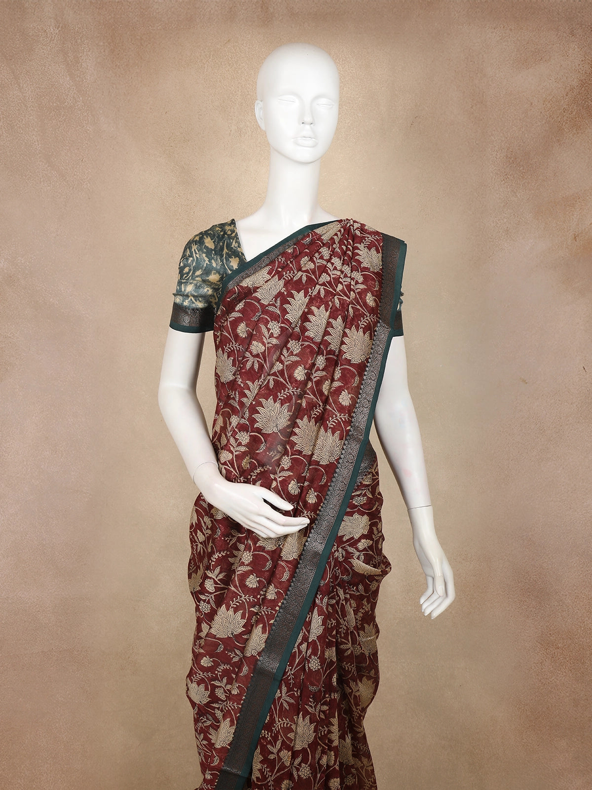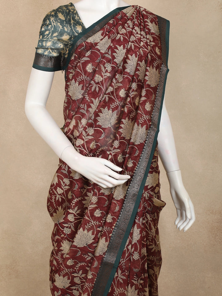 Maroon Floral Printed Chanderi Cotton Saree with Teal Zari Border