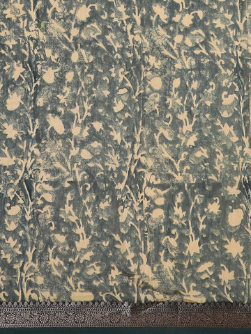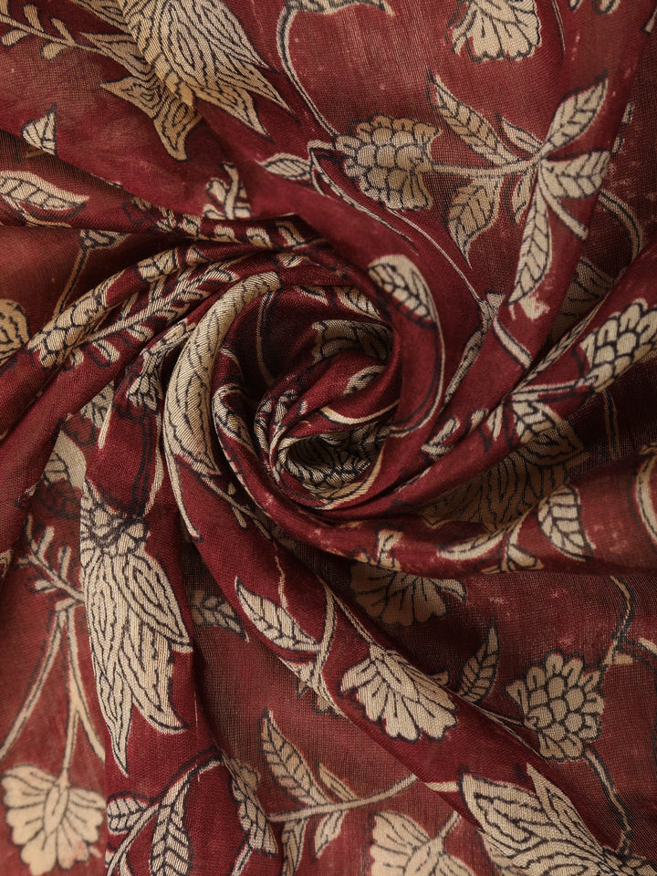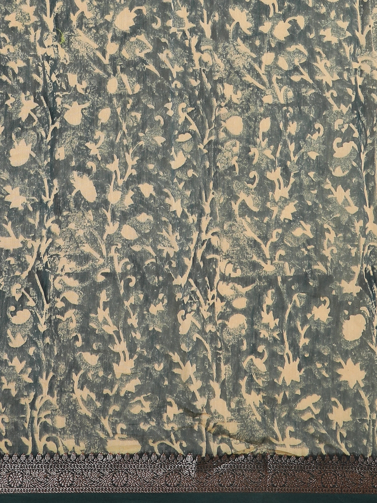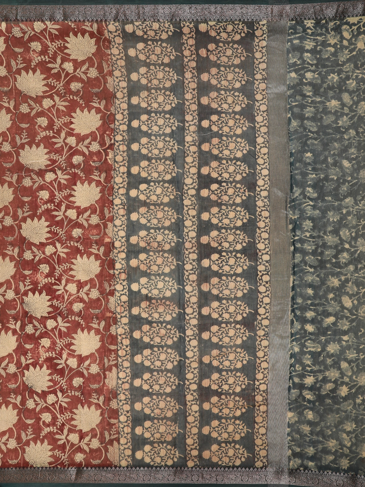 Maroon Floral Printed Chanderi Cotton Saree with Teal Zari Border