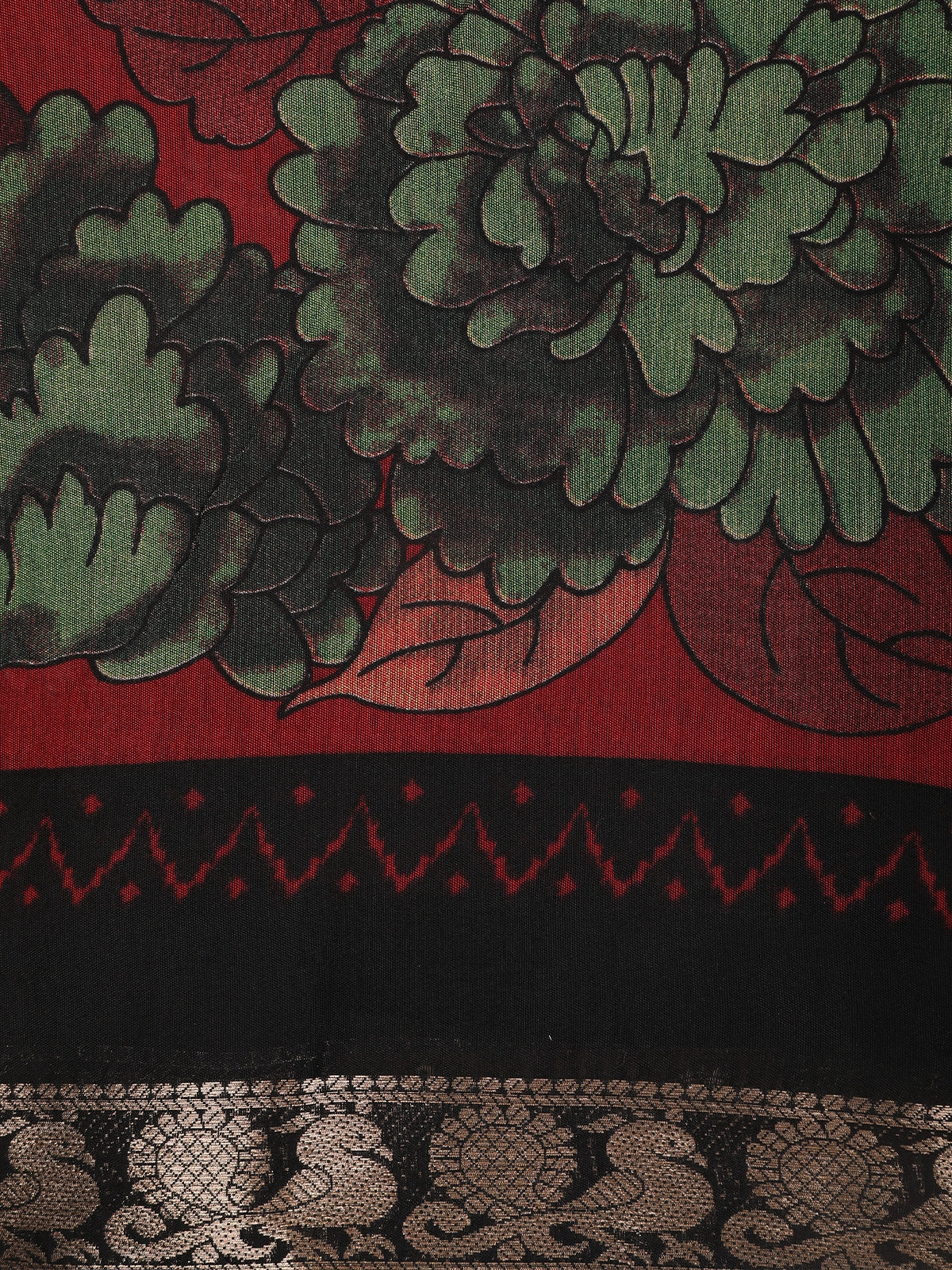 Maroon Floral Printed Design Chanderi Cotton Saree with Contrast Zari Woven Border