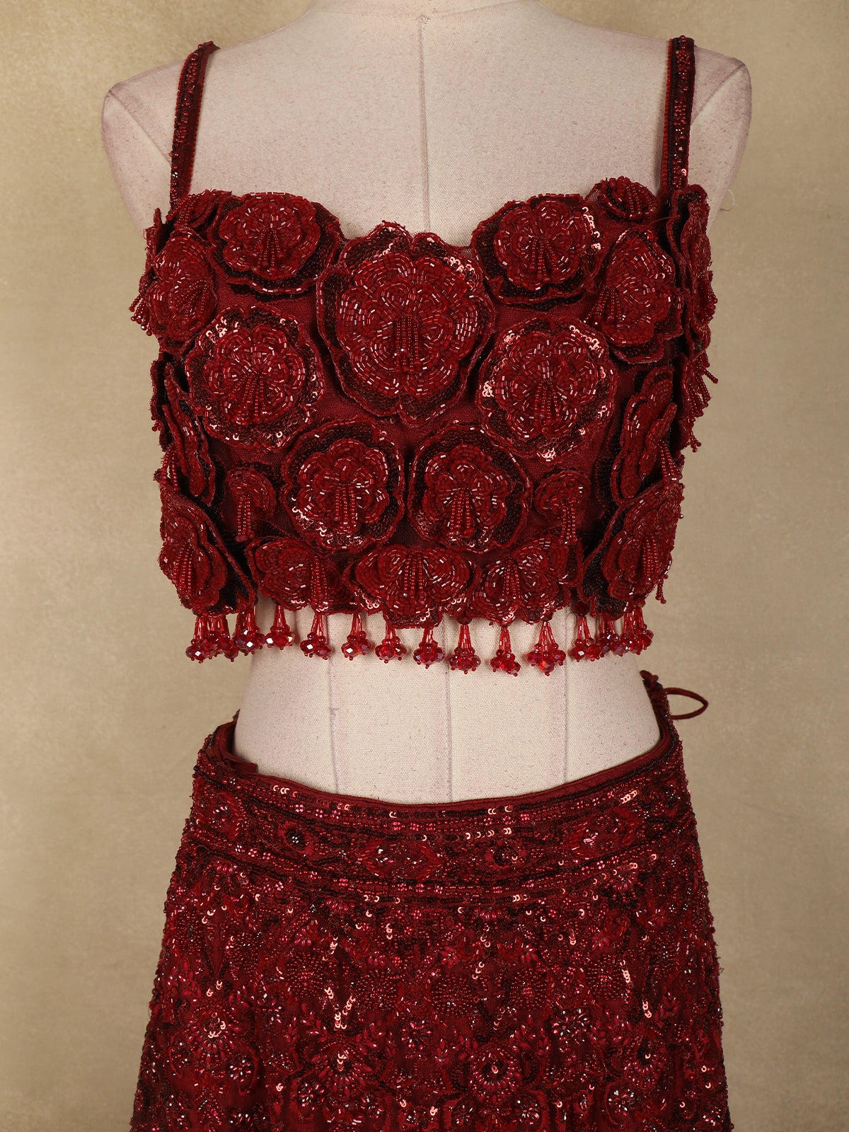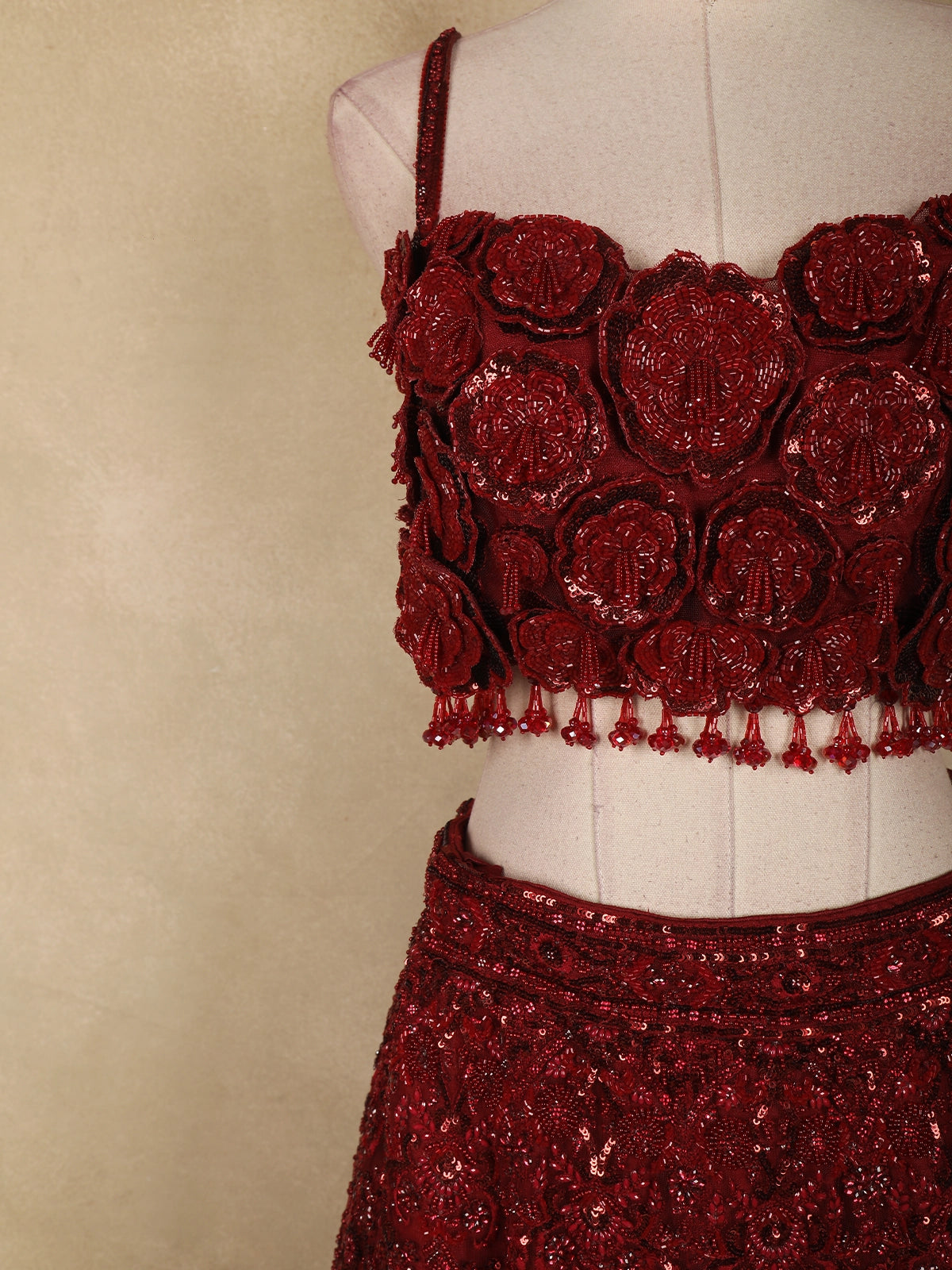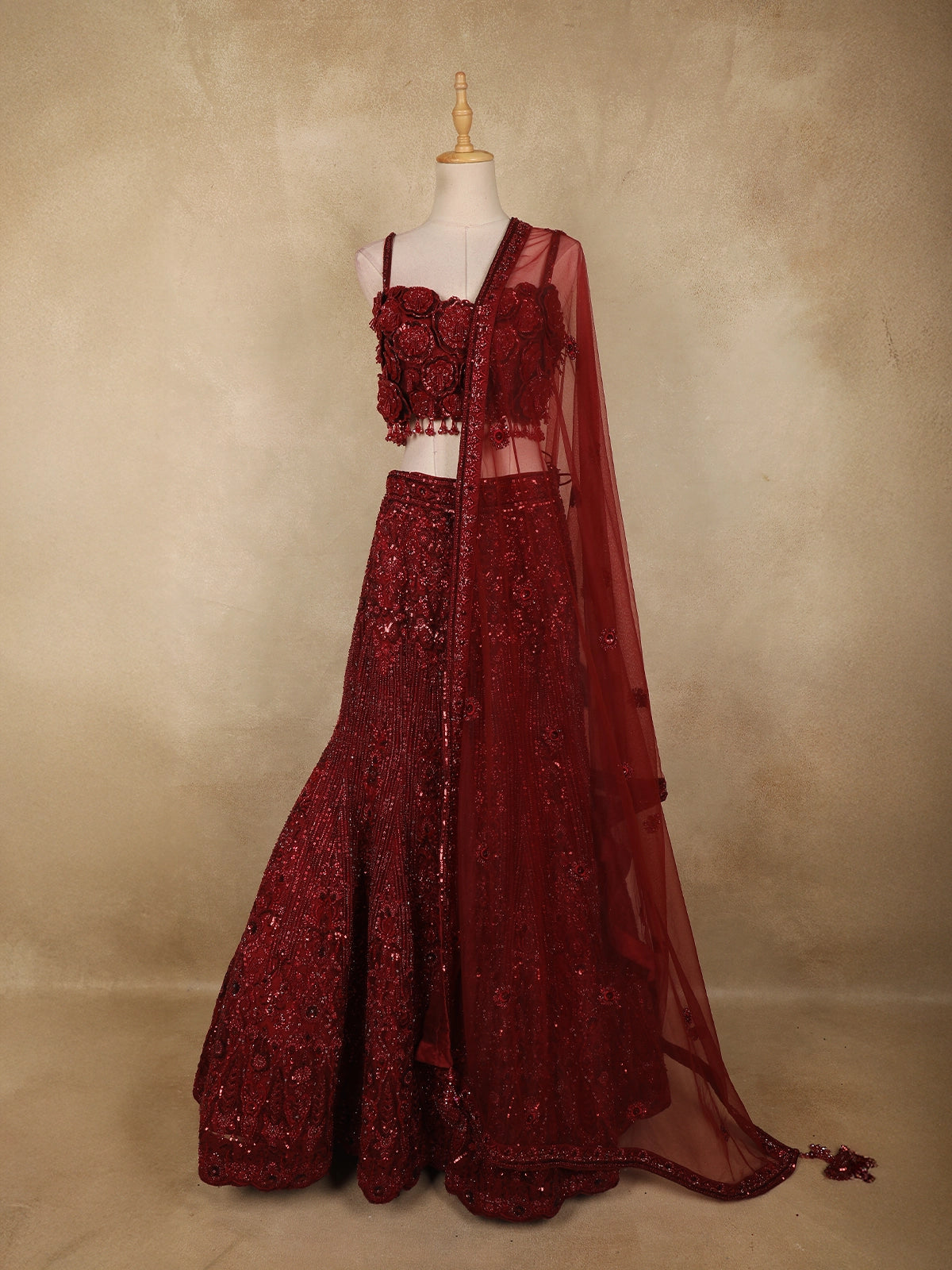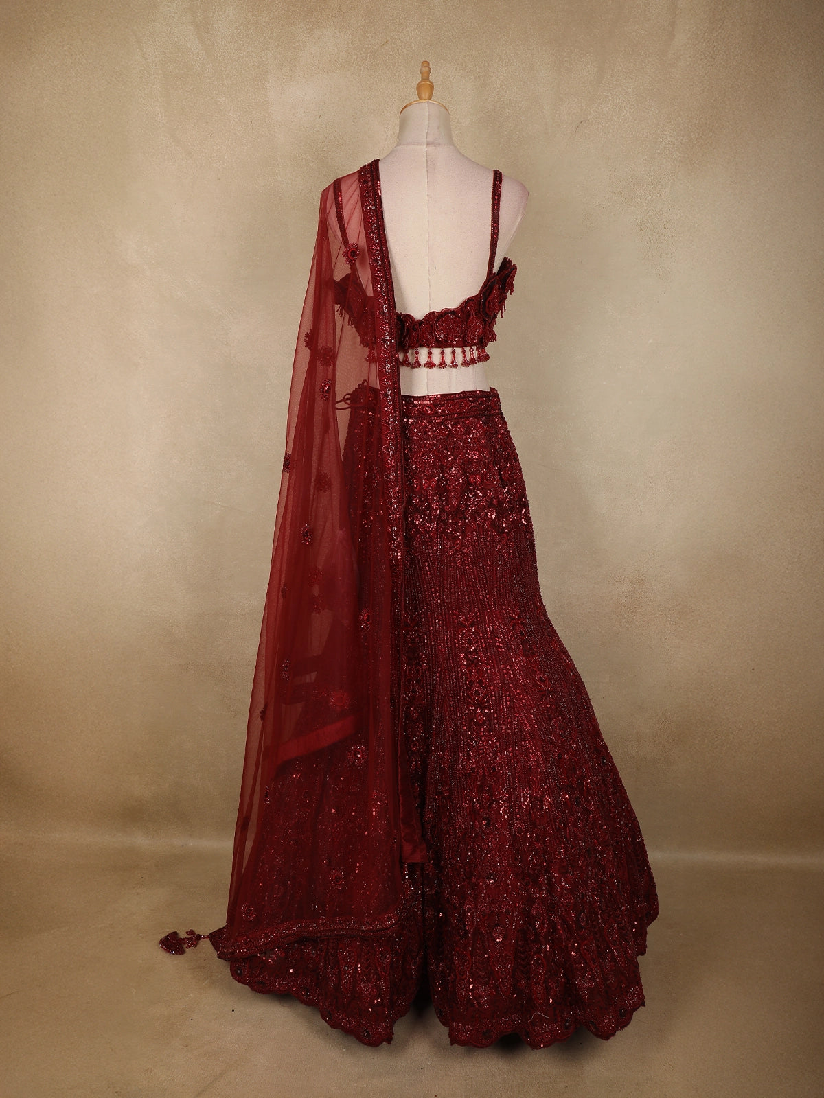 Maroon Floral Sequins and Beads Embroidered Design Net Mermaid Lehenga With Dupatta