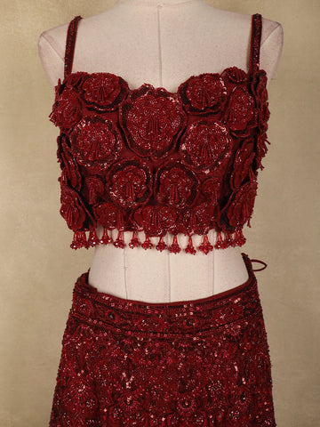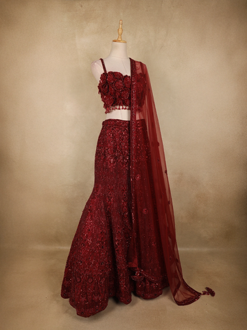 Make a striking statement with this exquisitely crafted maroon net mermaid lehenga set, designed to exude luxury and feminine elegance. The deep maroon hue lends a regal charm, while intricate floral embellishments elevate the ensemble with a couture finish.