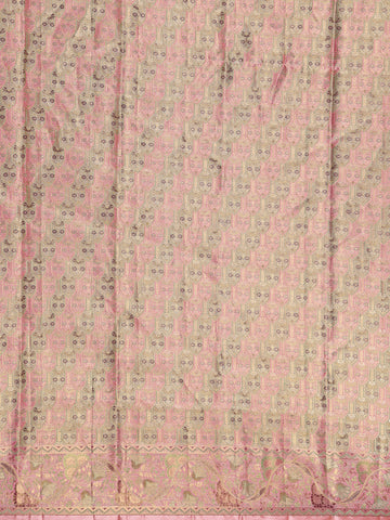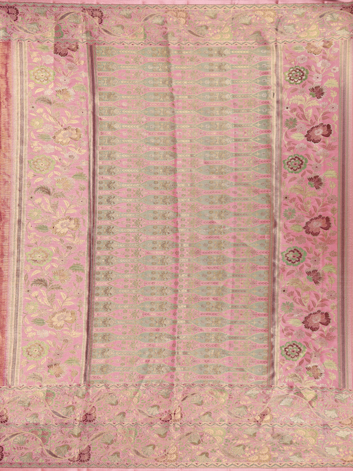 The ensemble is completed with a contrasting pink blouse featuring zari detailing, bringing a refined balance of richness and charm. Perfect for festive gatherings, weddings, and cultural occasions, this saree embodies timeless tradition with a contemporary touch of elegance.