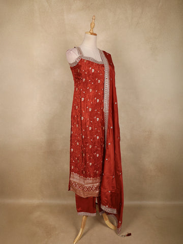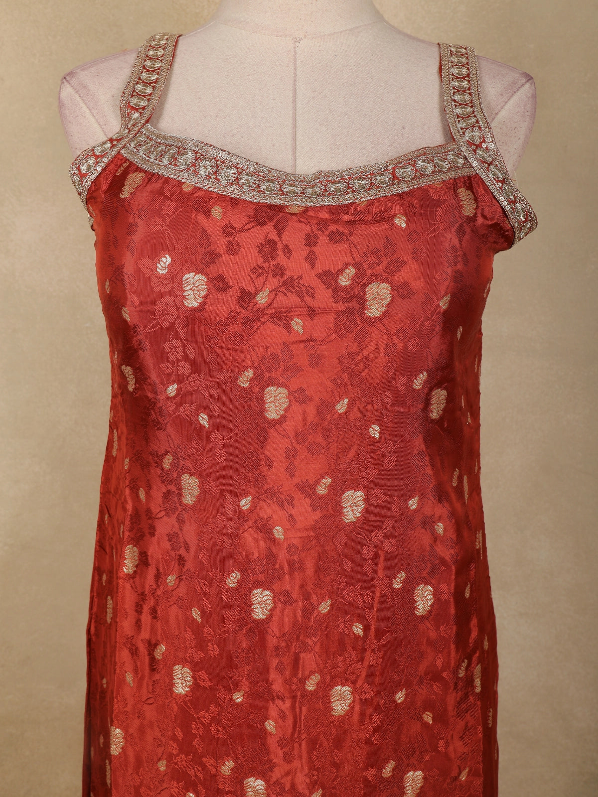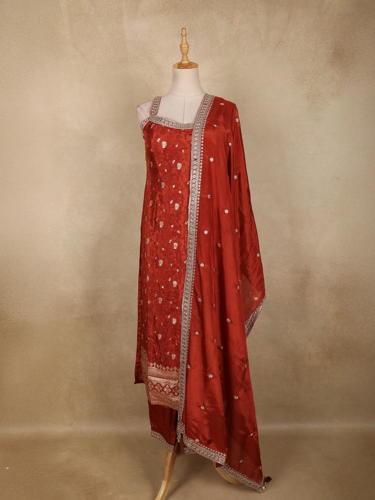 Make a statement of understated luxury with this maroon palazzo suit, crafted in rich tissue silk that offers a graceful sheen and fluid drape. The kurta is adorned with delicate floral woven motifs highlighted with subtle zari accents, lending a timeless festive charm to the ensemble.