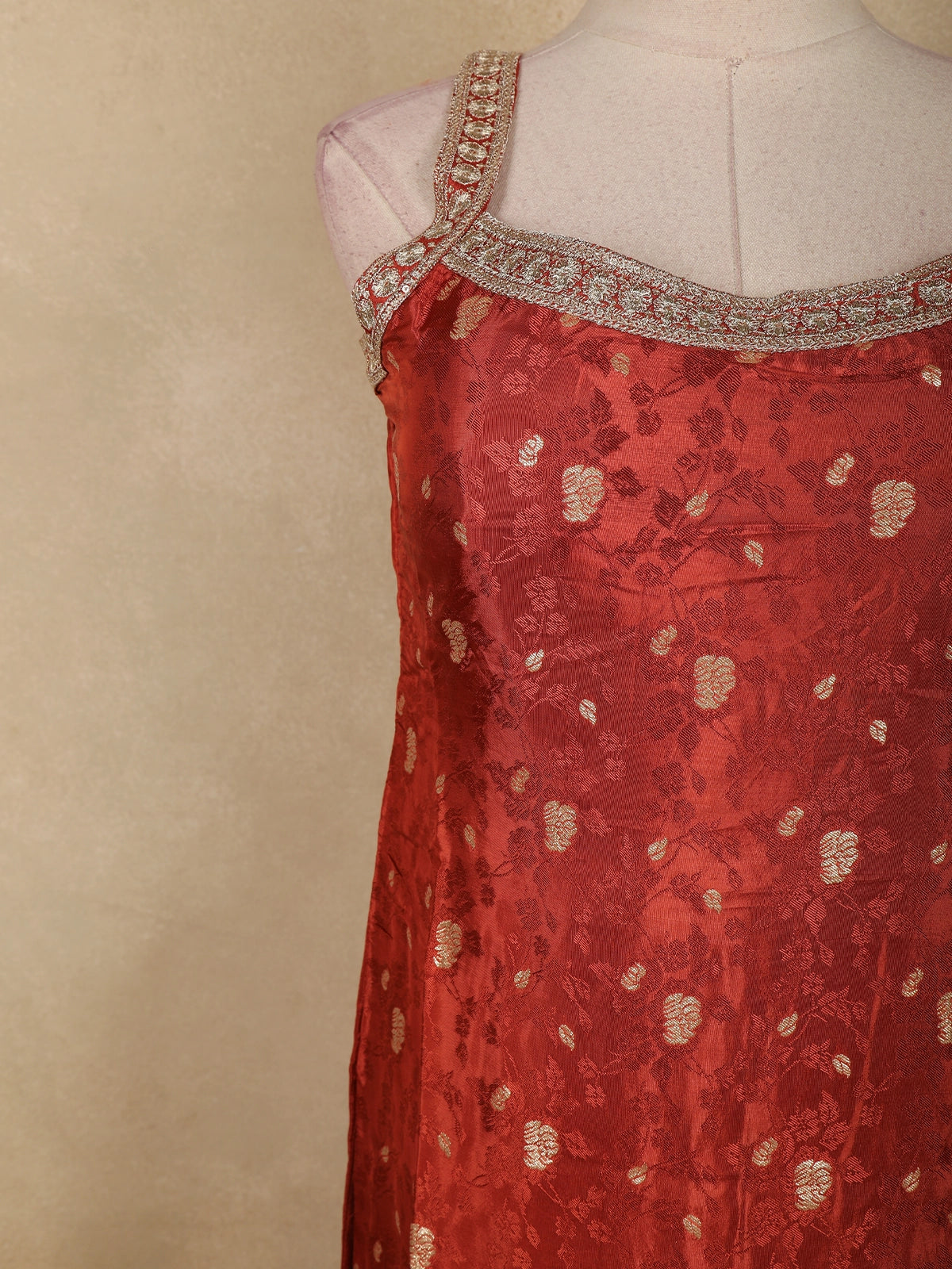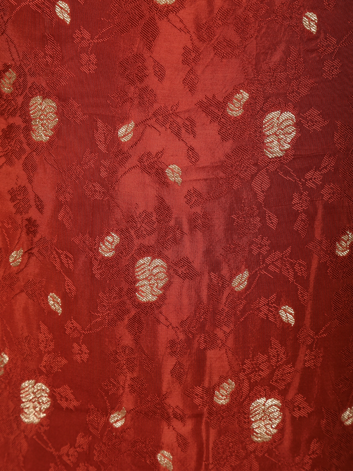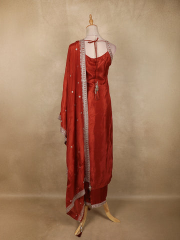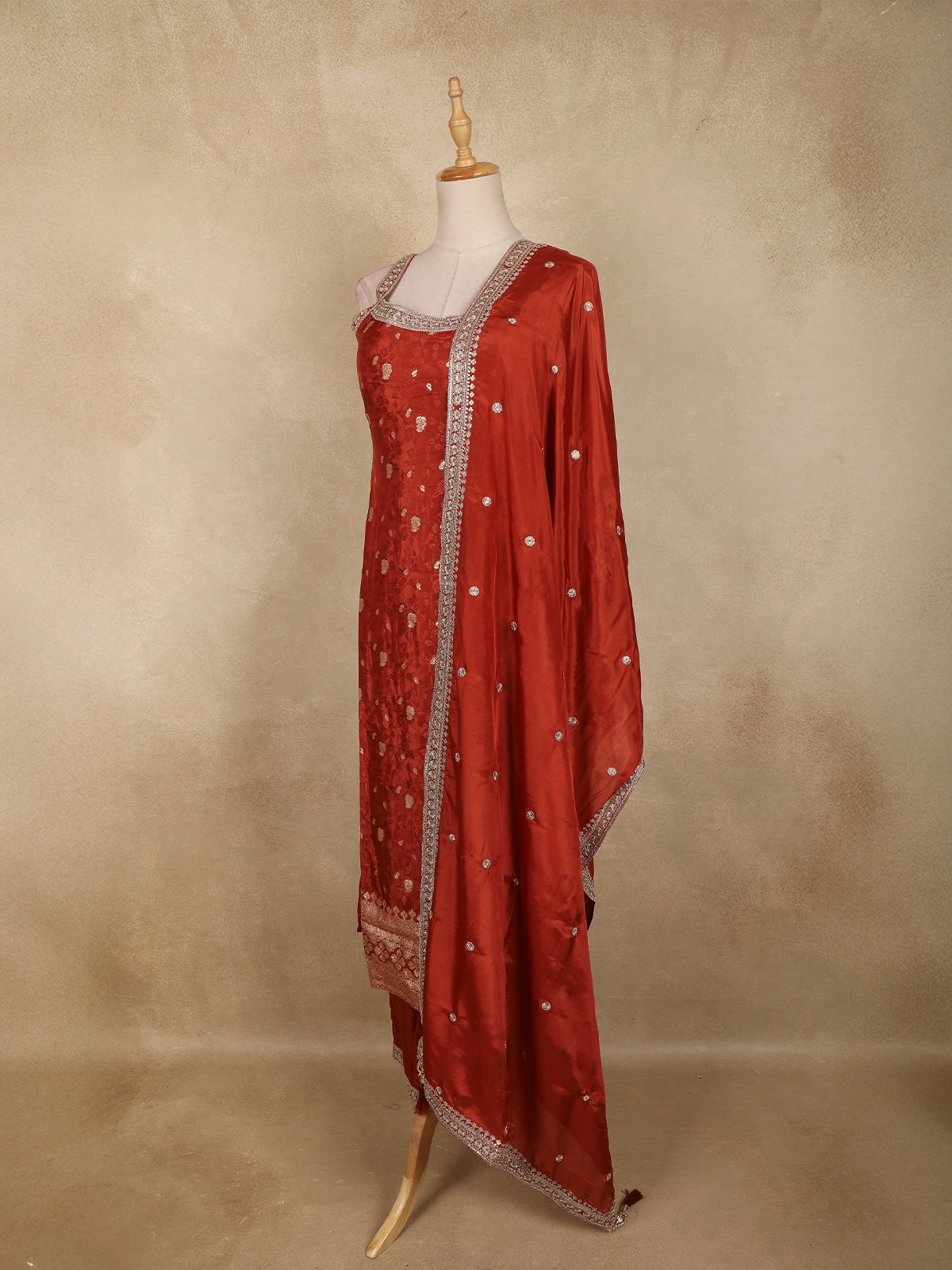 Make a statement of understated luxury with this maroon palazzo suit, crafted in rich tissue silk that offers a graceful sheen and fluid drape. The kurta is adorned with delicate floral woven motifs highlighted with subtle zari accents, lending a timeless festive charm to the ensemble.