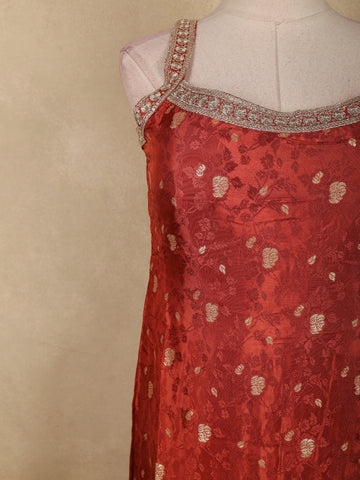The square neckline and shoulder straps are beautifully finished with intricate zari embroidery, enhancing the elegance of the silhouette. Designed in a straight-cut style, the kurta ensures a flattering fit while maintaining all-day comfort. It is paired with a matching tissue silk palazzo featuring coordinated zari detailing at the hem for a polished look.