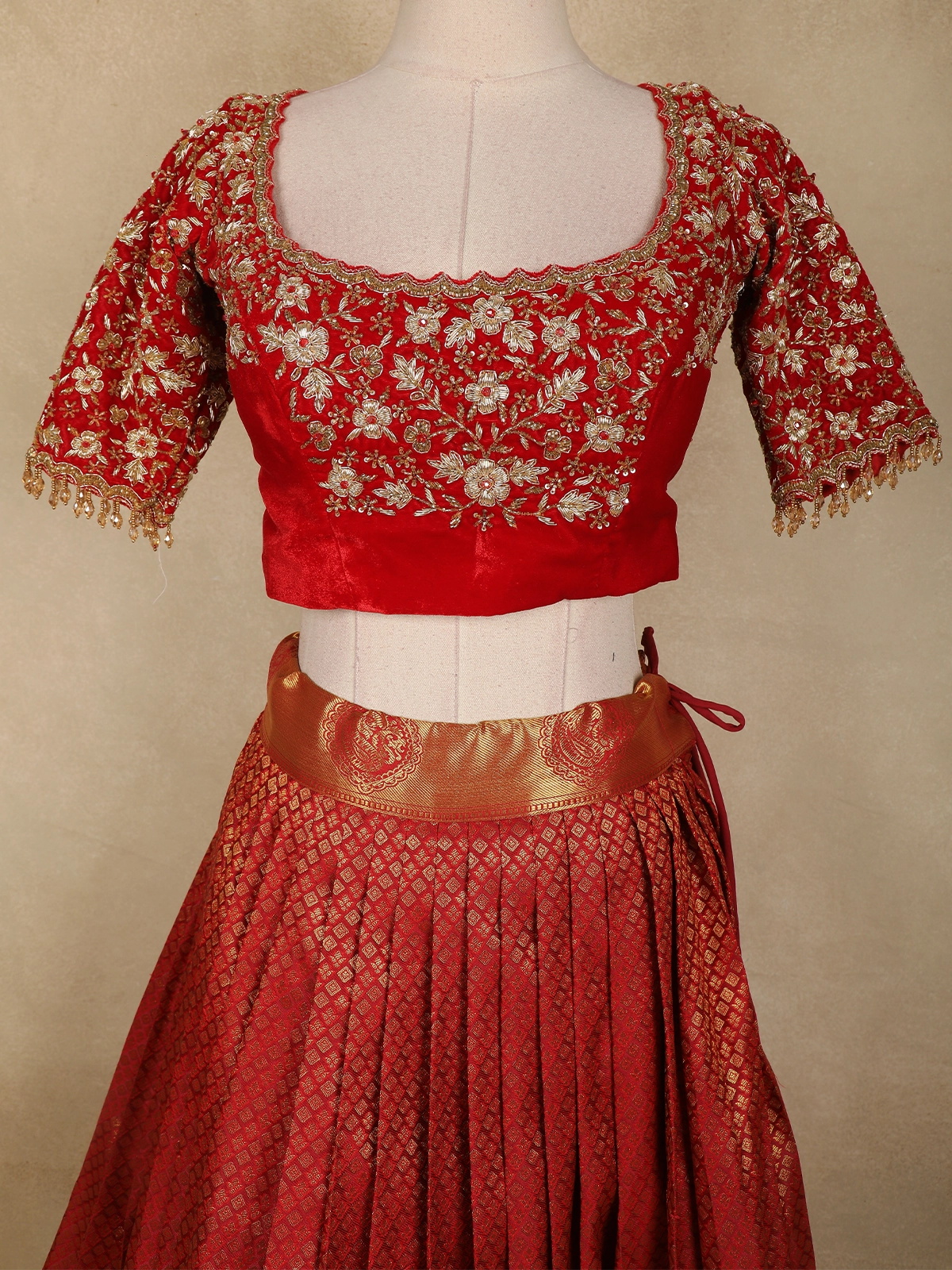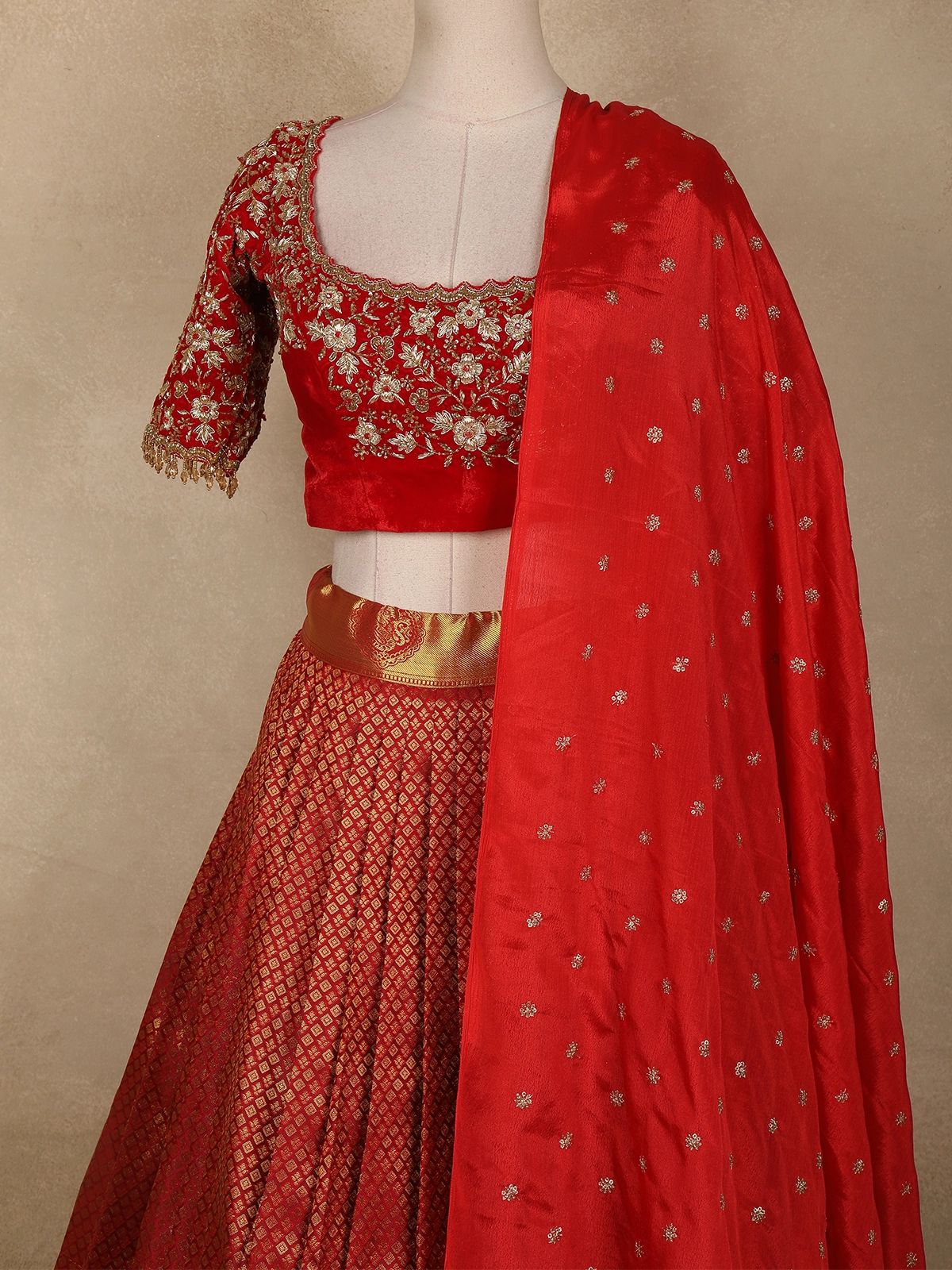 The lehenga skirt features a beautifully structured flare with a rich gold zari temple border, adding grandeur and depth to the silhouette. Paired with a perfectly coordinated embroidered blouse, adorned with delicate zari floral detailing and traditional sleeve finish, this ensemble exudes bridal sophistication.