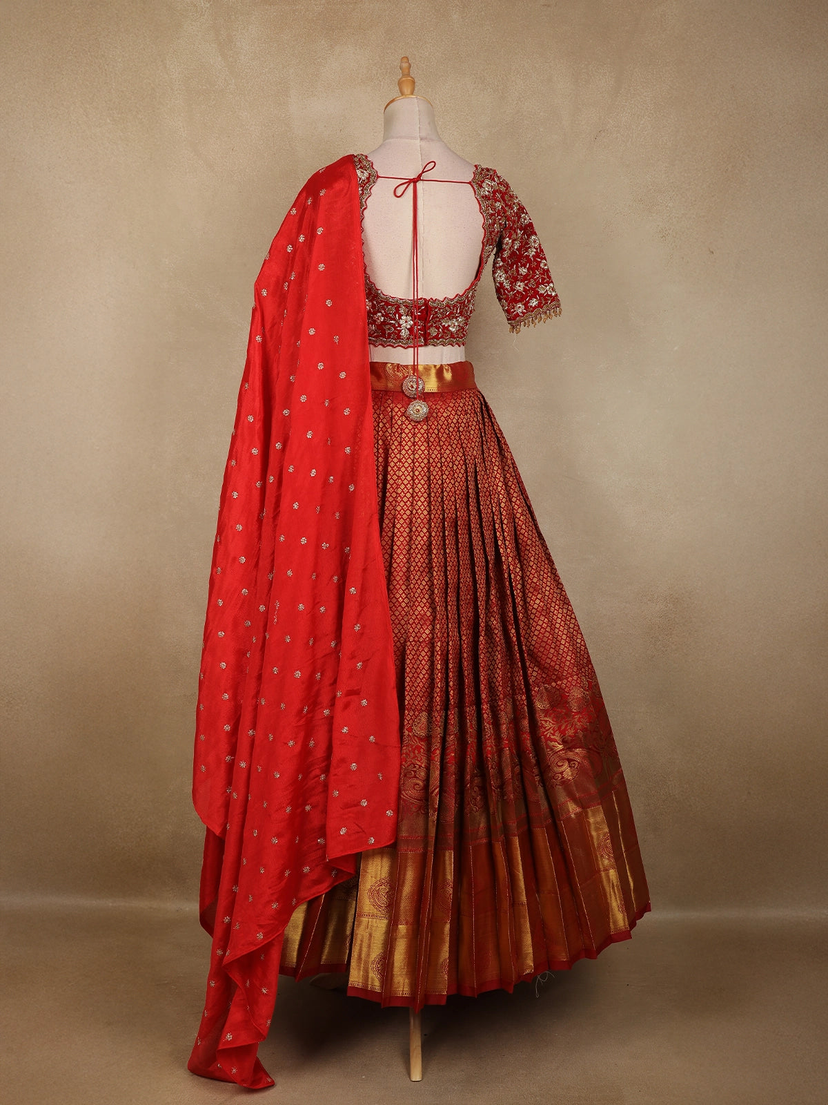 Designed to offer both opulence and comfort, this bridal lehenga is a perfect heirloom piece that captures the essence of traditional South Indian weddings while maintaining a refined contemporary appeal.