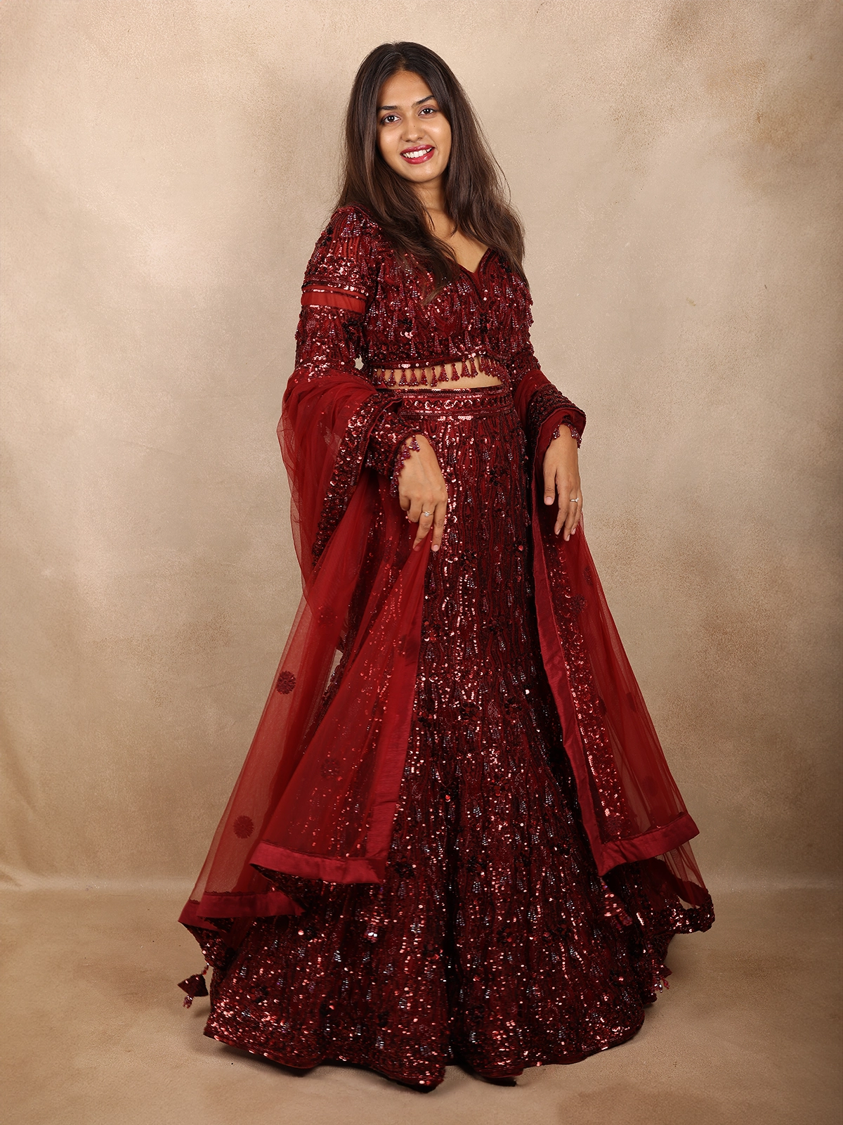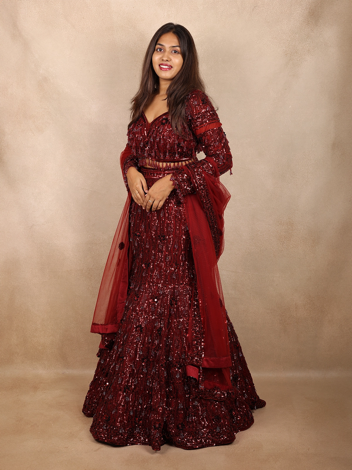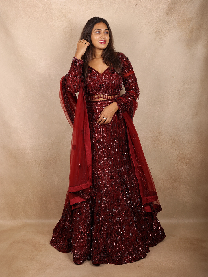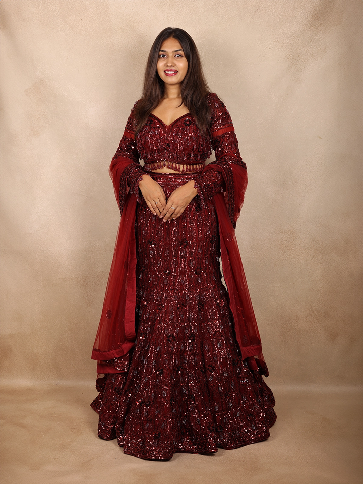 Maroon Heavy Sequins and Beads Embroidered Design Mermaid Net Lehenga With Dupatta
