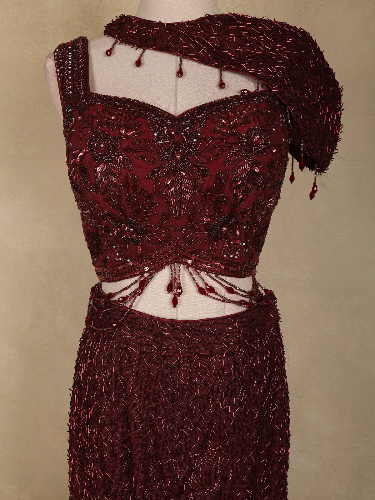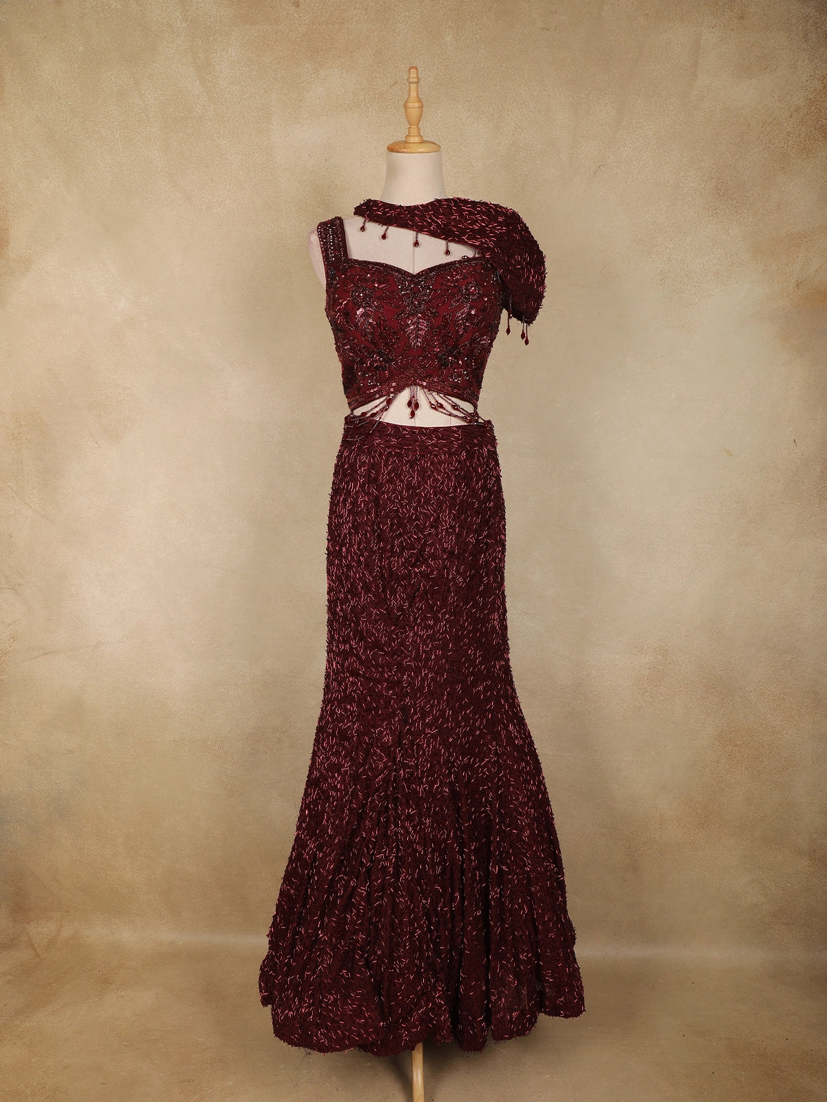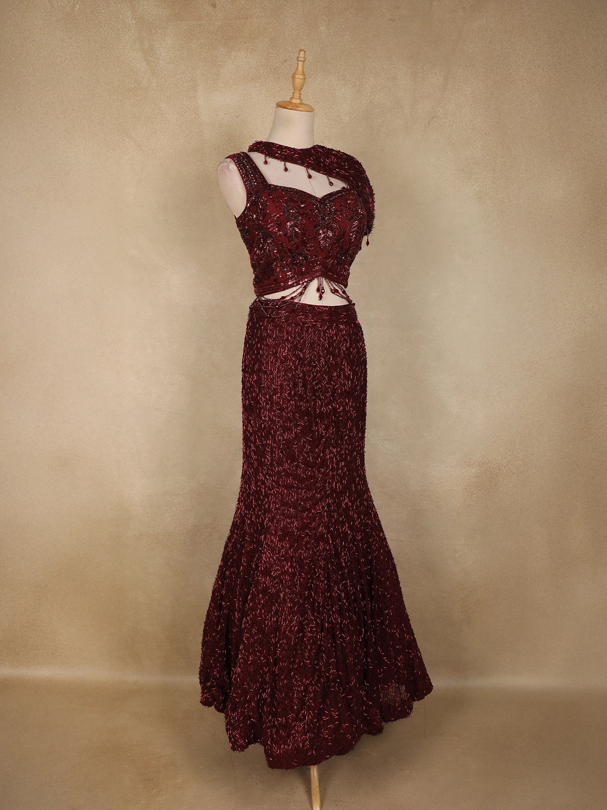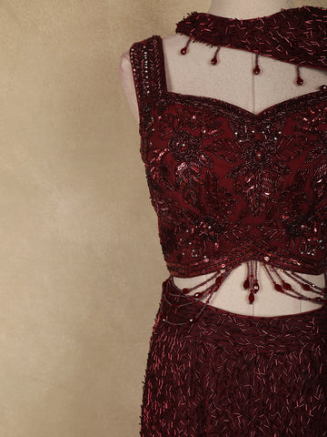 Maroon Heavy Sequins and Beads Embroidered Design Net Mermaid Lehenga