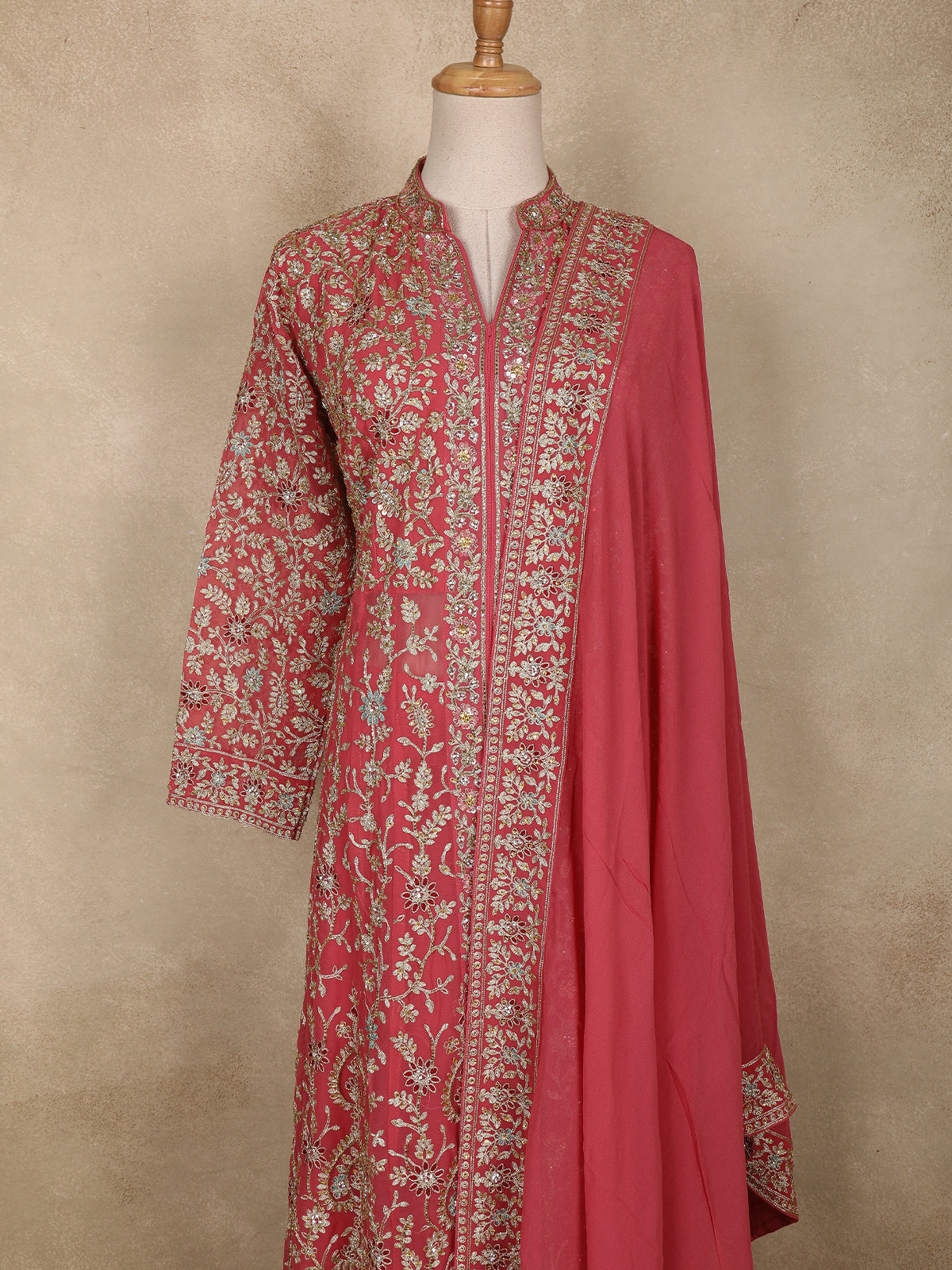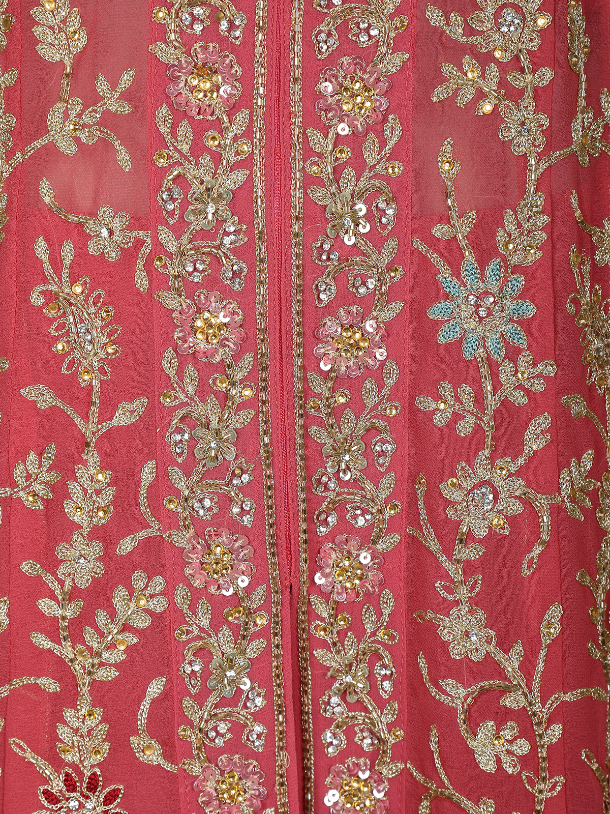 The matching lehenga beneath offers graceful volume while complementing the richly embellished top. A soft georgette dupatta with an embroidered border completes the ensemble, adding a perfect balance of tradition and contemporary finesse. Designed for bridesmaids, wedding guests, and women who adore regal fashion — this outfit is a true celebration of luxury.