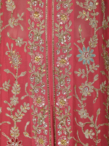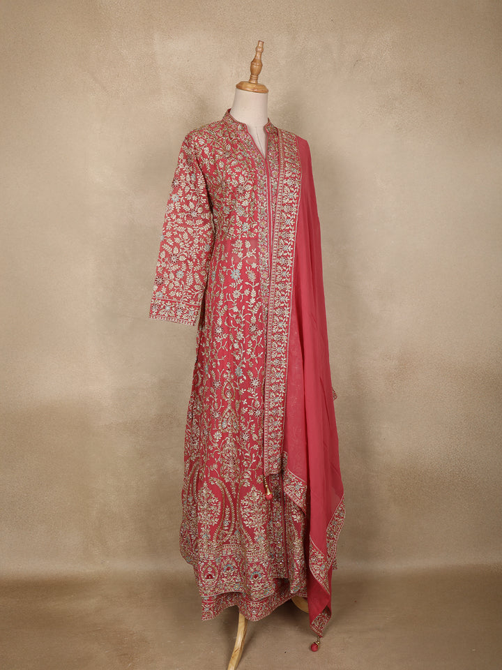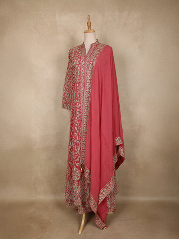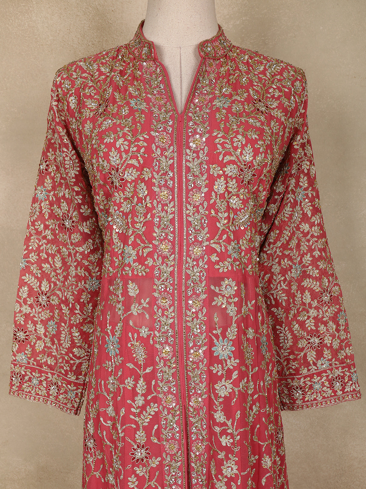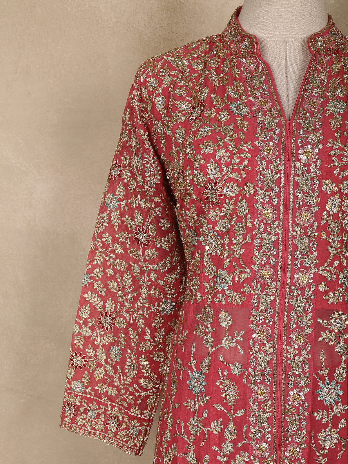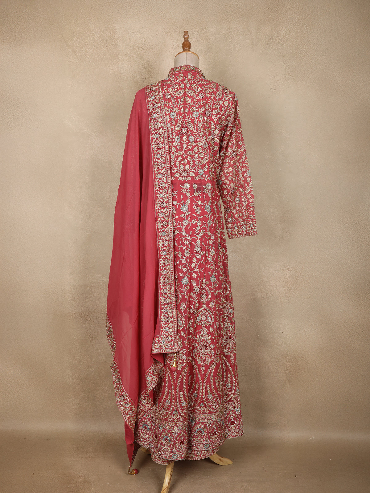 Elevate your ethnic elegance with this stunning Maroon Lehenga Set, handcrafted with exquisite artistry and royal charm. The ensemble features a beautifully embroidered long jacket-style top adorned with intricate thread and zari floral motifs that shimmer with every movement. The detailed craftsmanship extends from the neckline to the hem, creating a majestic and sophisticated appeal.