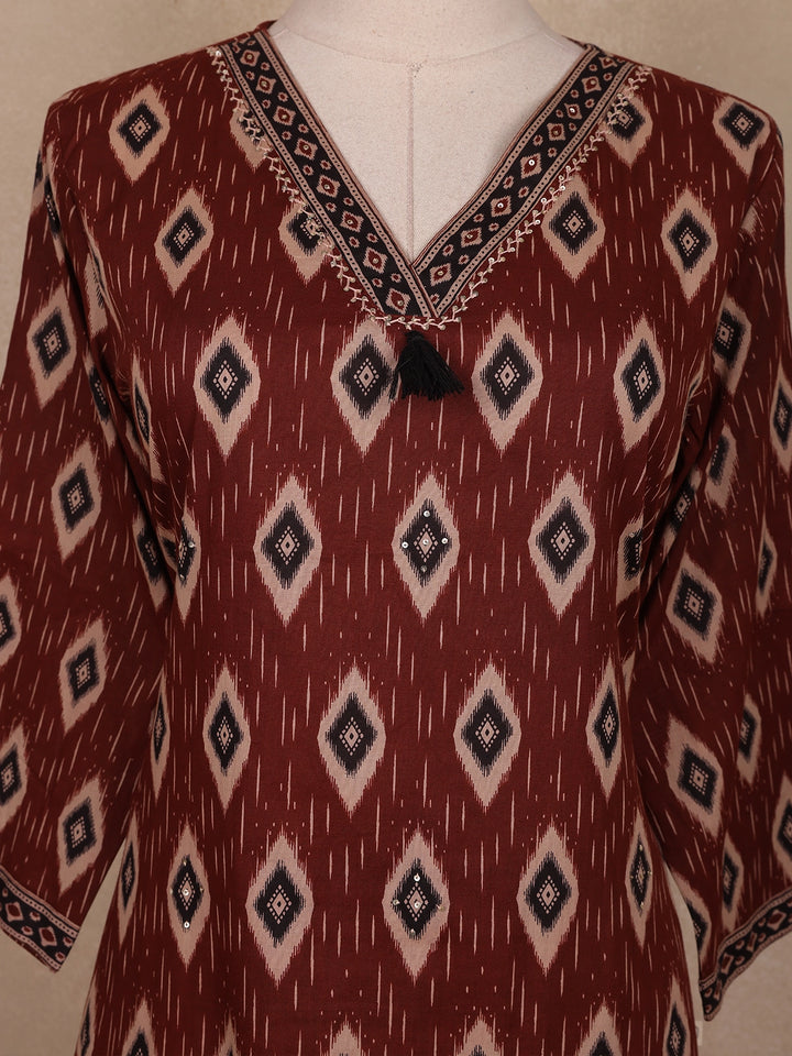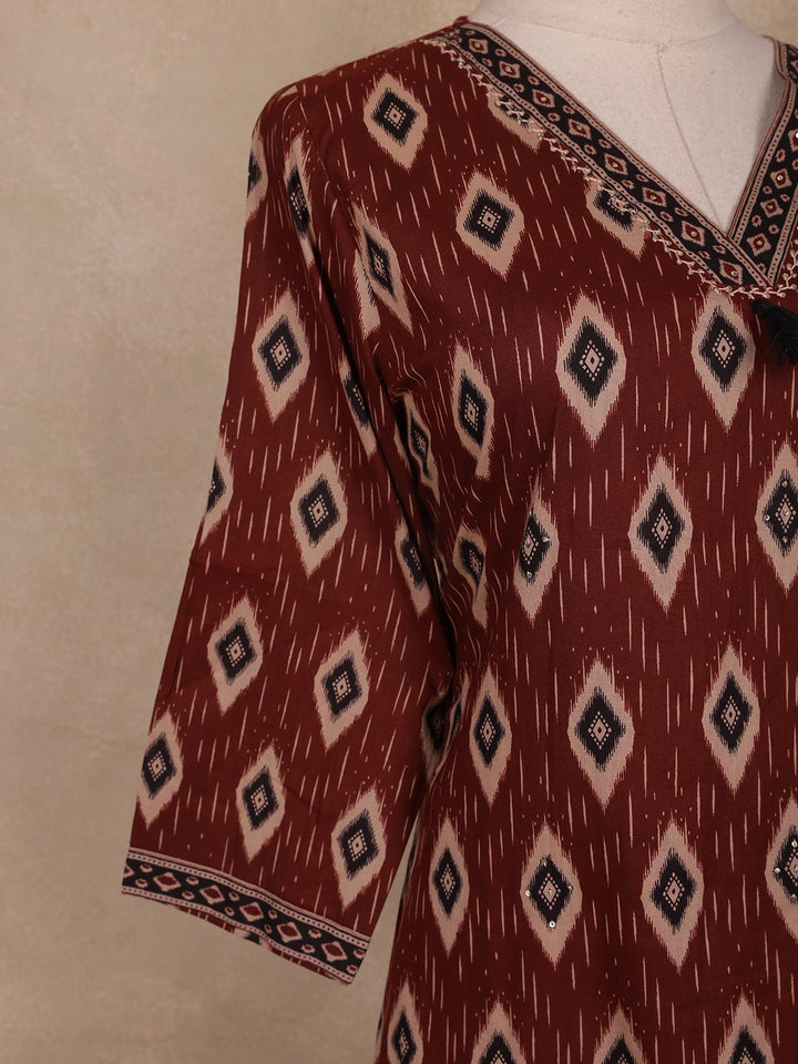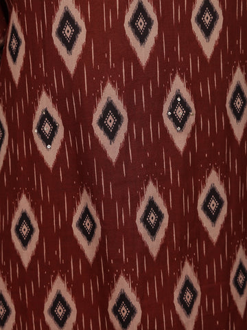 Step into effortless ethnic elegance with this Maroon Ikat Printed Cotton Salwar Suit. The straight-cut kurta showcases a mesmerizing Ikat-inspired pattern in earthy maroon and beige tones, enhanced by a finely detailed embroidered V-neckline adorned with a subtle tassel. The 3/4 sleeves carry a matching border for a touch of refinement.