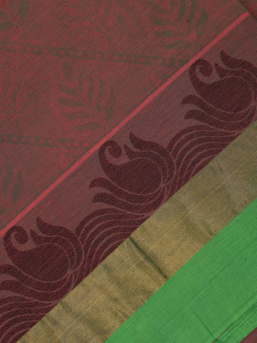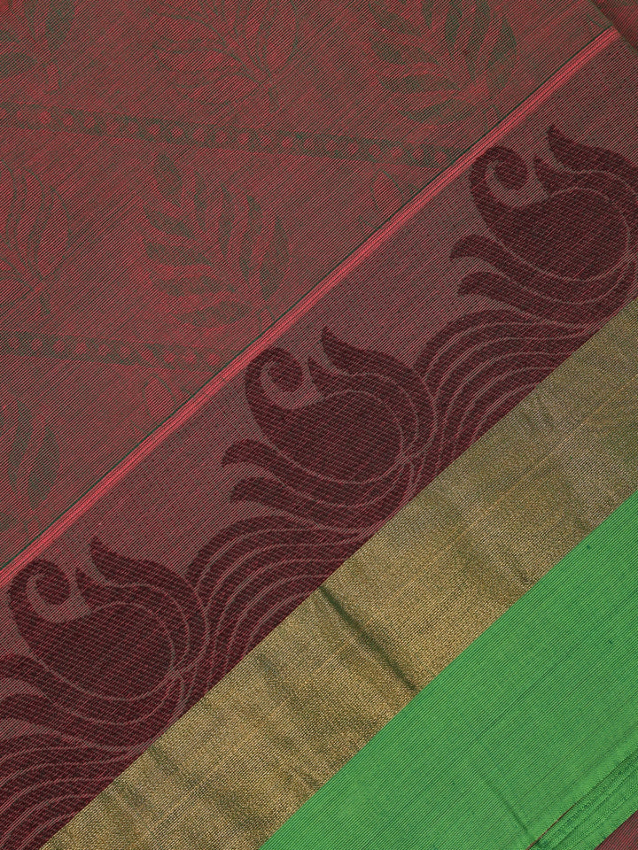 The saree features an exquisite leaf-patterned woven design across its rich maroon body, creating a refined texture that enhances its ethnic appeal. A stunning contrast green zari border lends a pop of color and a hint of shimmer, beautifully framing the saree with traditional finesse. The matching green pallu and blouse piece complement the border, completing this harmonious combination of earthy elegance and vibrant charm.