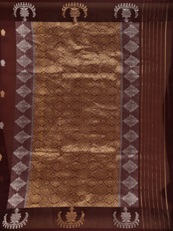 The matching blouse and pallu maintain a harmonious tone, enhanced by an elegant zari border that adds a traditional touch of opulence. Perfect for weddings, festive celebrations, and evening gatherings, this saree captures the timeless artistry of Banaras while offering a contemporary silhouette that never goes out of style.