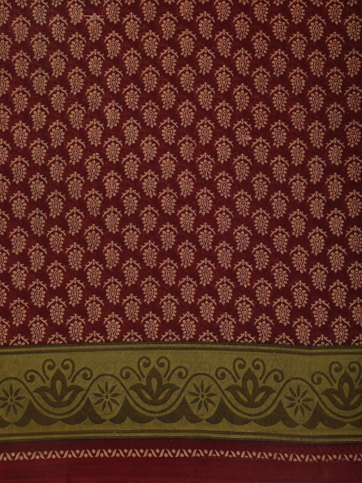 Maroon Paisley Printed karishma Cotton Saree with Olive Green Ornamental Border