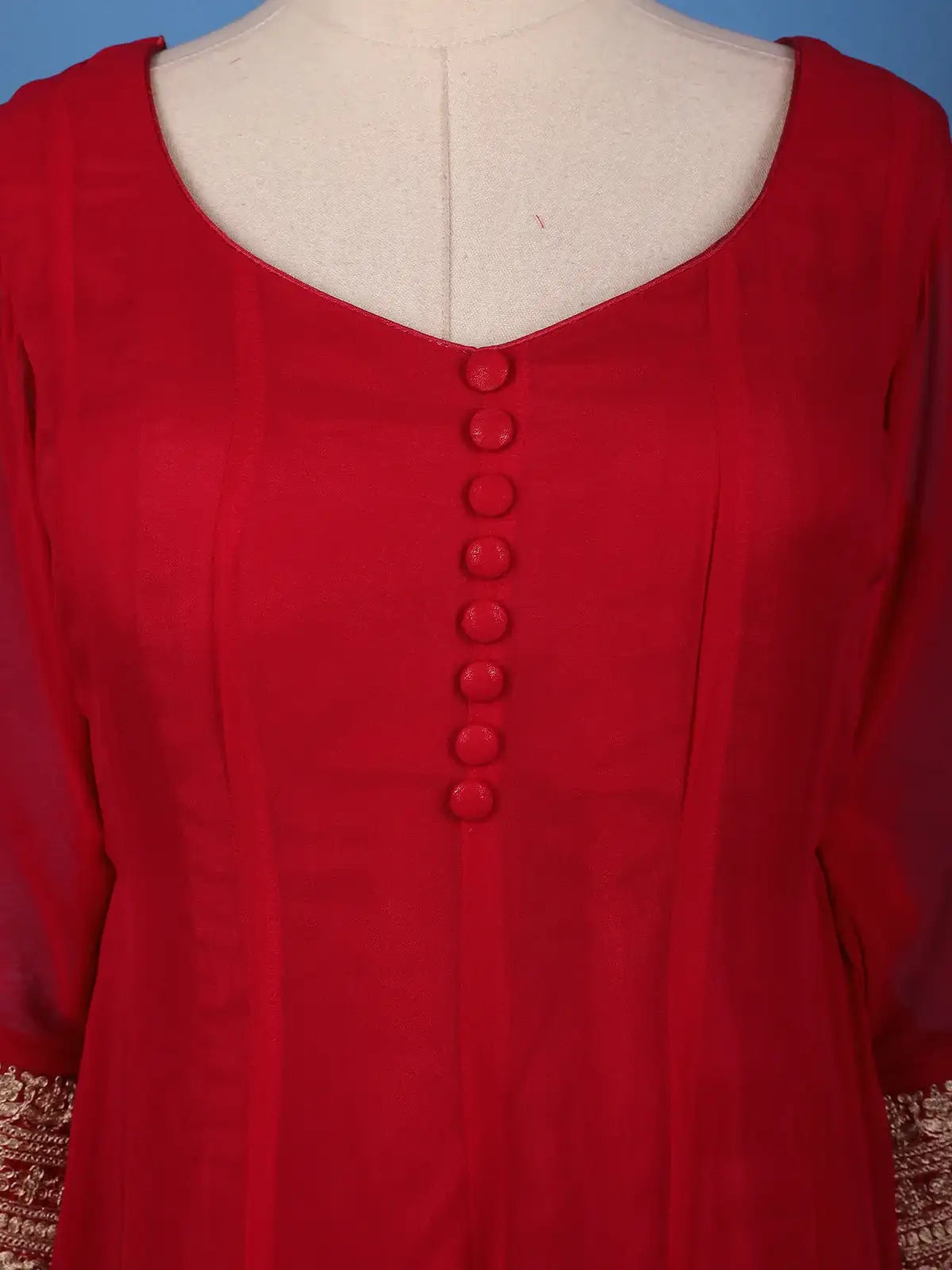 Drape yourself in regal splendor with this Maroon Panel Designed Anarkali Georgette Gown, a perfect fusion of grace and grandeur. Tailored in flowing georgette fabric, this gown offers a flattering fall and a lightweight feel, making it ideal for long hours of celebration and movement.