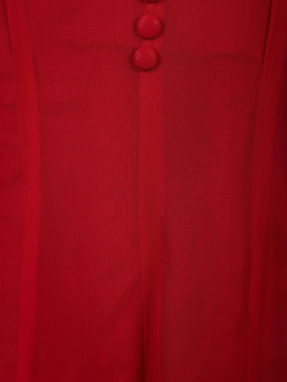 The gown features a deep maroon hue, lending it a rich and timeless appeal. The upper body boasts clean, minimalist solid paneling, enhanced with a row of fabric buttons for added detail. The standout features lie in the elaborately crafted zari and sequin embroidery on the sleeve cuffs and the flared hemline, which reflect traditional craftsmanship with modern sophistication.