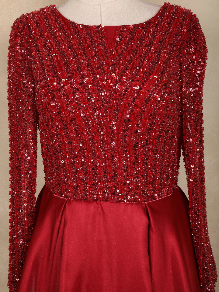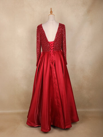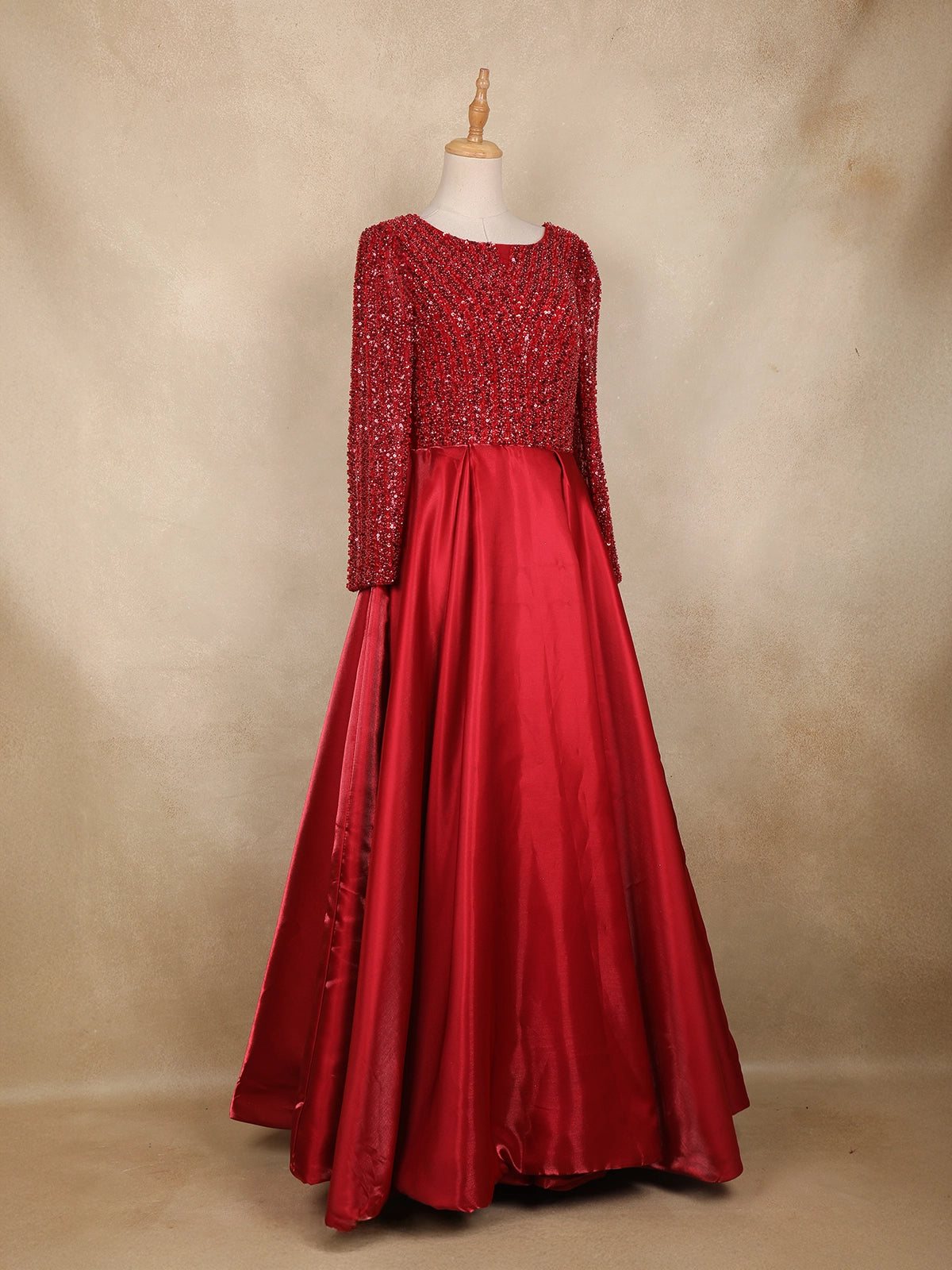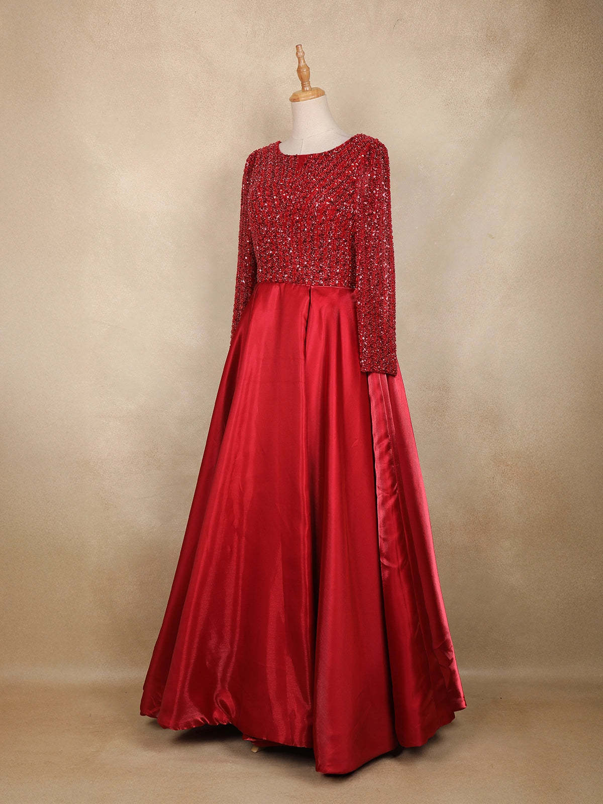 Step into the spotlight with this stunning red partywear gown that blends glamour with elegance. The bodice is fully adorned with shimmering sequins arranged in intricate patterns, creating a dazzling and luxurious appeal. Full sleeves add a refined touch, making it perfect for evening celebrations and grand occasions.