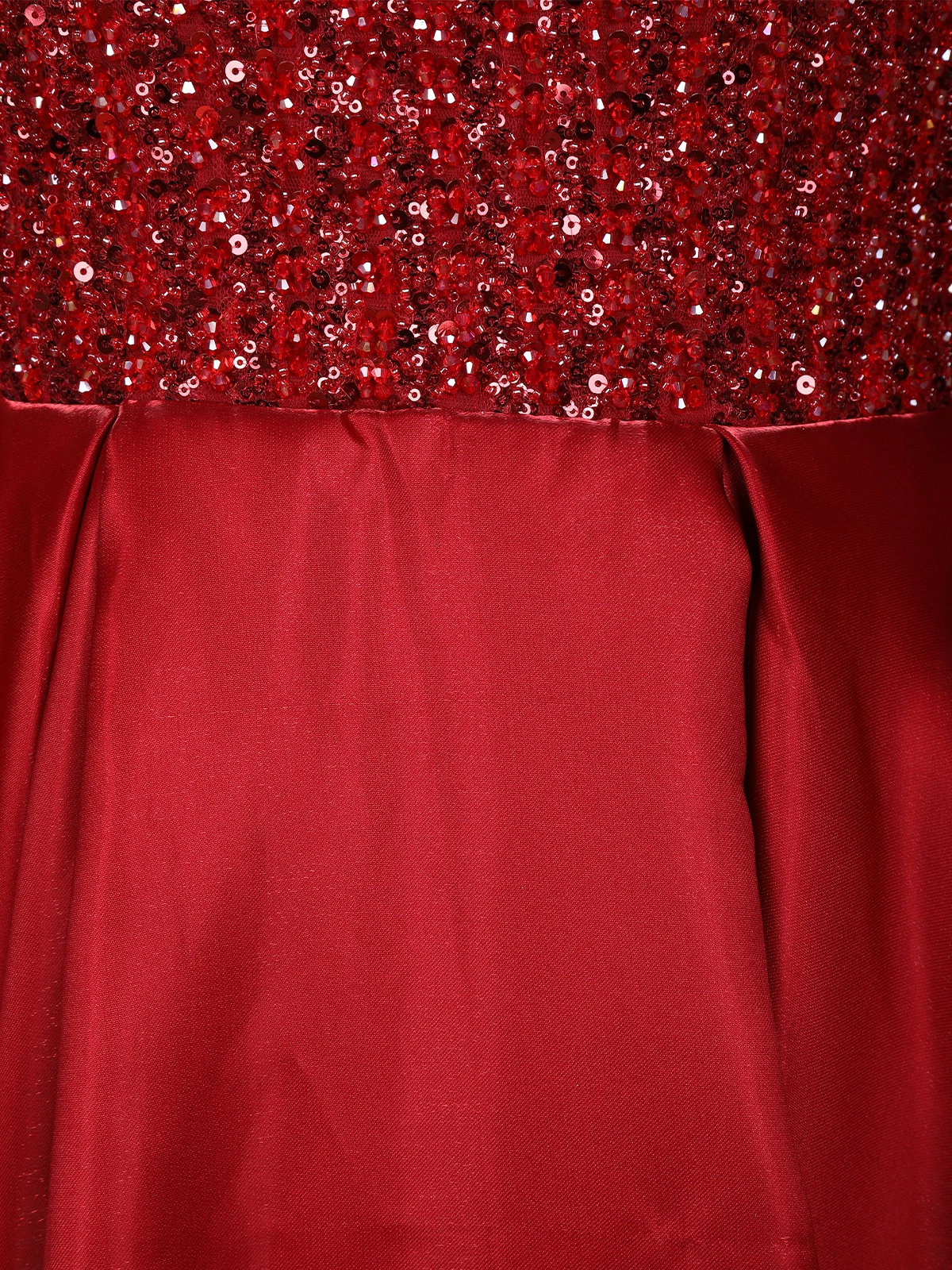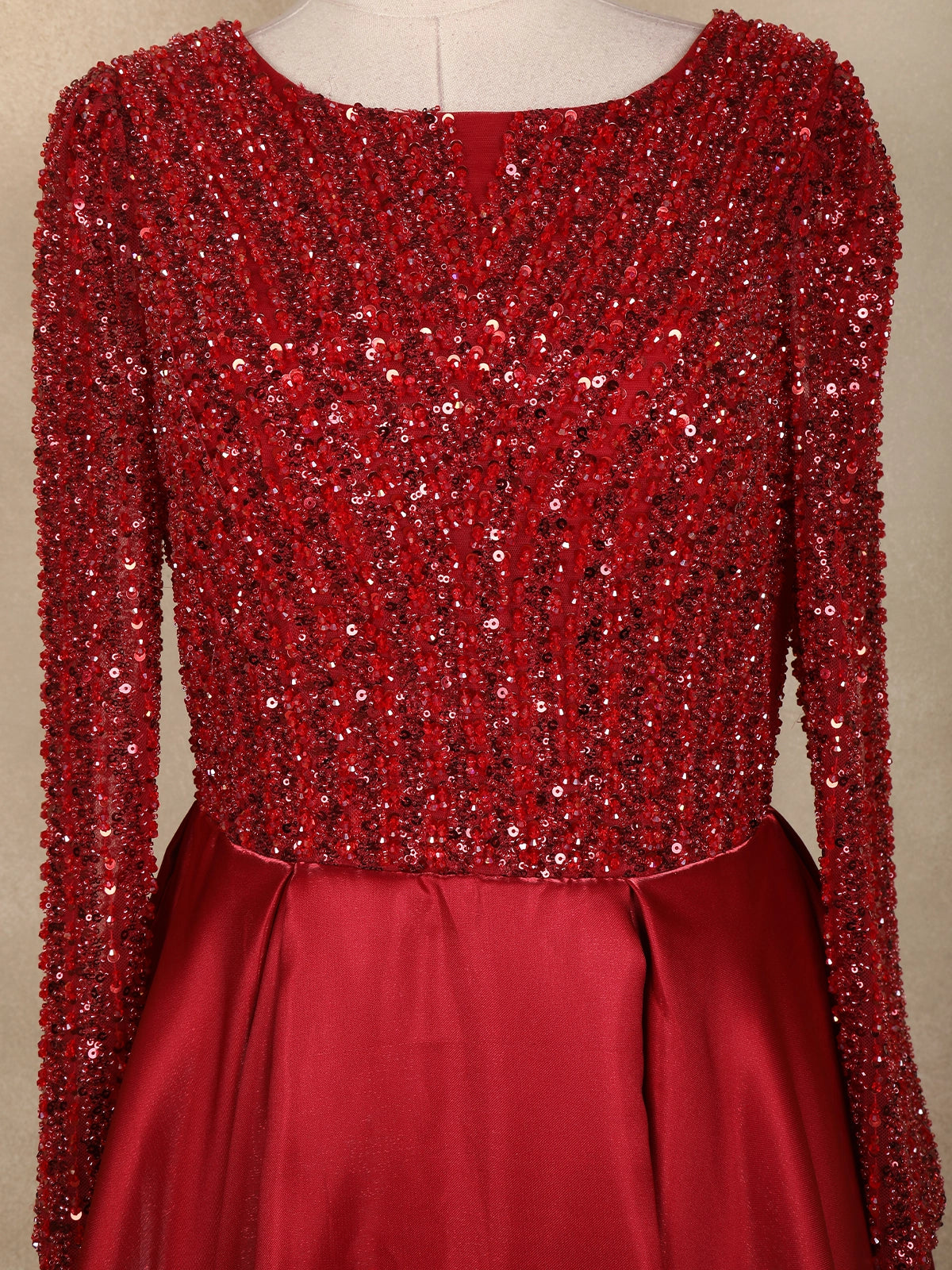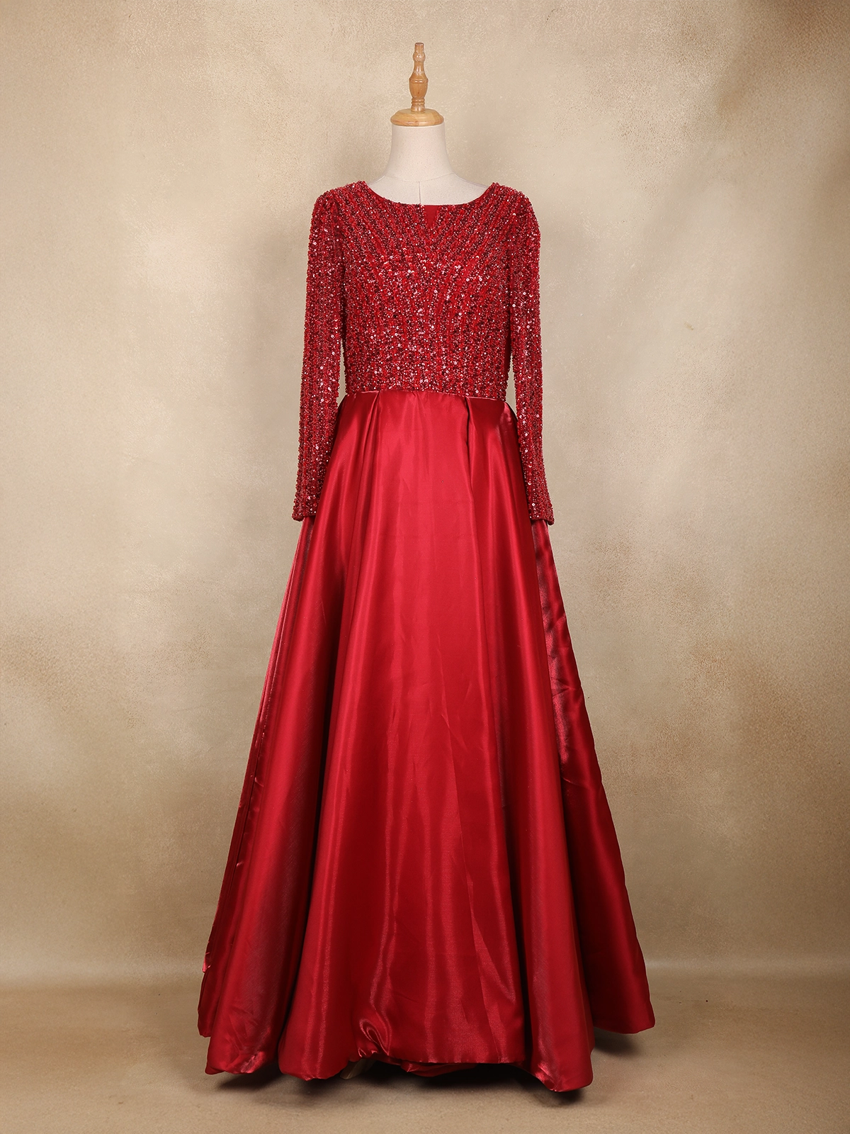 Step into the spotlight with this stunning red partywear gown that blends glamour with elegance. The bodice is fully adorned with shimmering sequins arranged in intricate patterns, creating a dazzling and luxurious appeal. Full sleeves add a refined touch, making it perfect for evening celebrations and grand occasions.