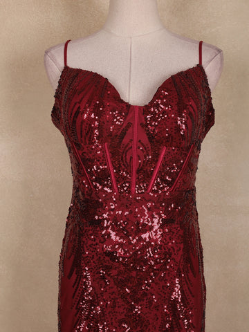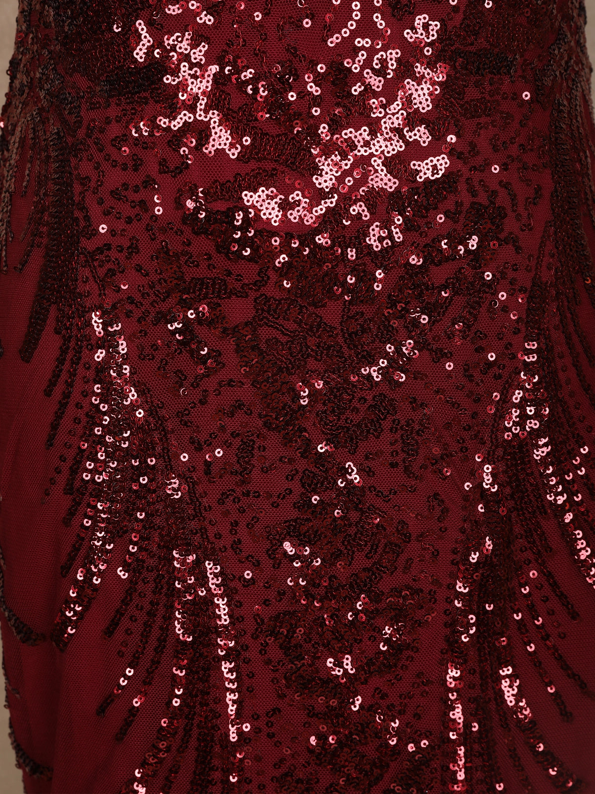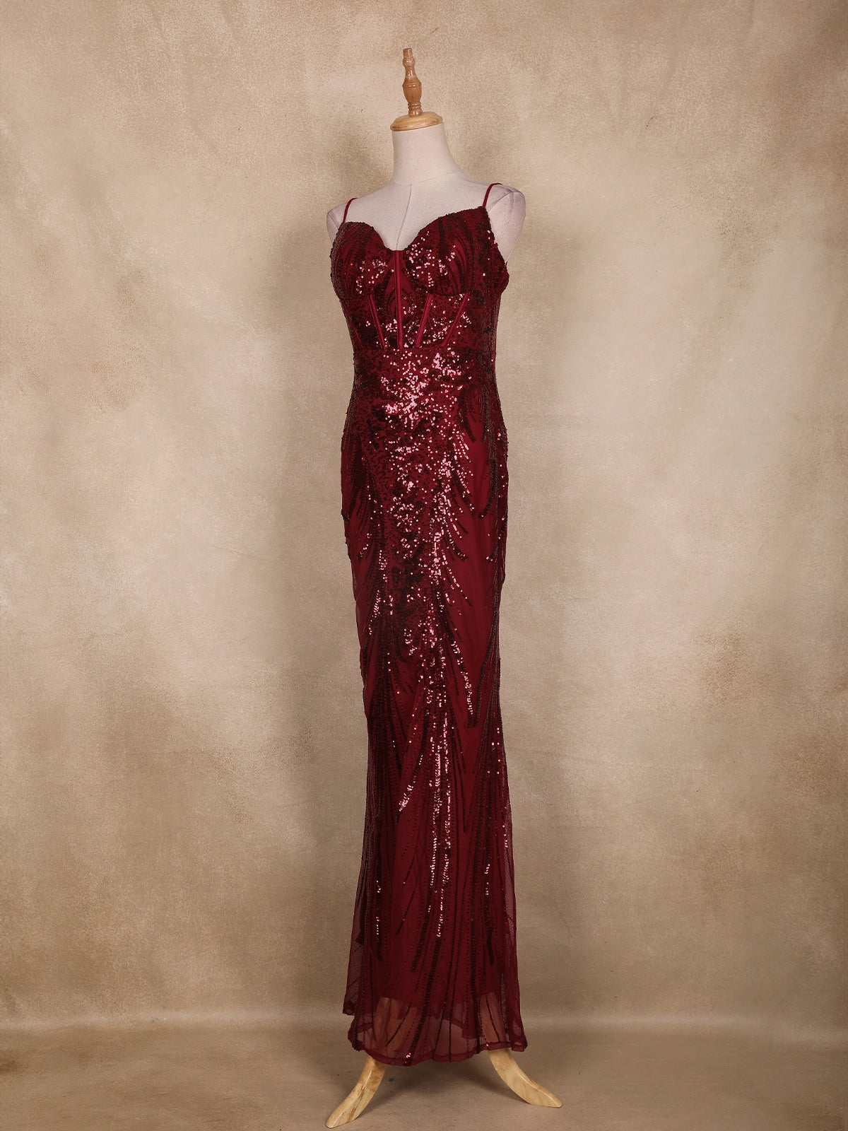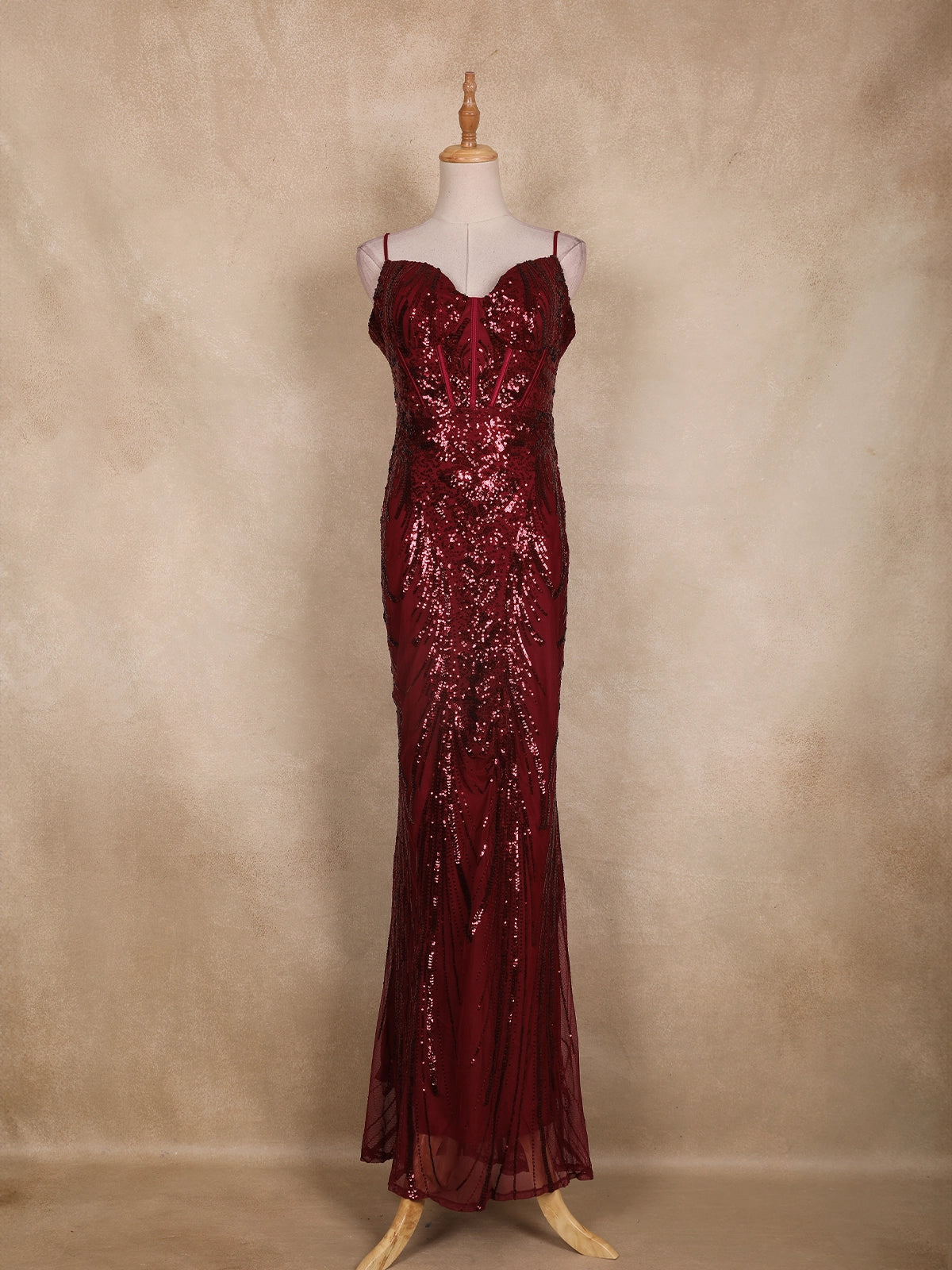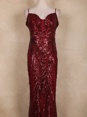 Turn heads with this striking wine red mermaid gown, a perfect blend of allure and sophistication. The gown features intricate sequin embroidery throughout, designed in mesmerizing patterns that highlight the body’s natural curves. Its sweetheart neckline with structured corset detailing adds a hint of boldness, balanced beautifully by slender spaghetti straps that exude feminine grace. The gown’s flowing hemline creates a sculpted yet fluid silhouette, while the deep U-back ensures a captivating finish. Ideal for receptions, cocktail nights, or high-fashion events, this gown captures the essence of timeless evening glamour.