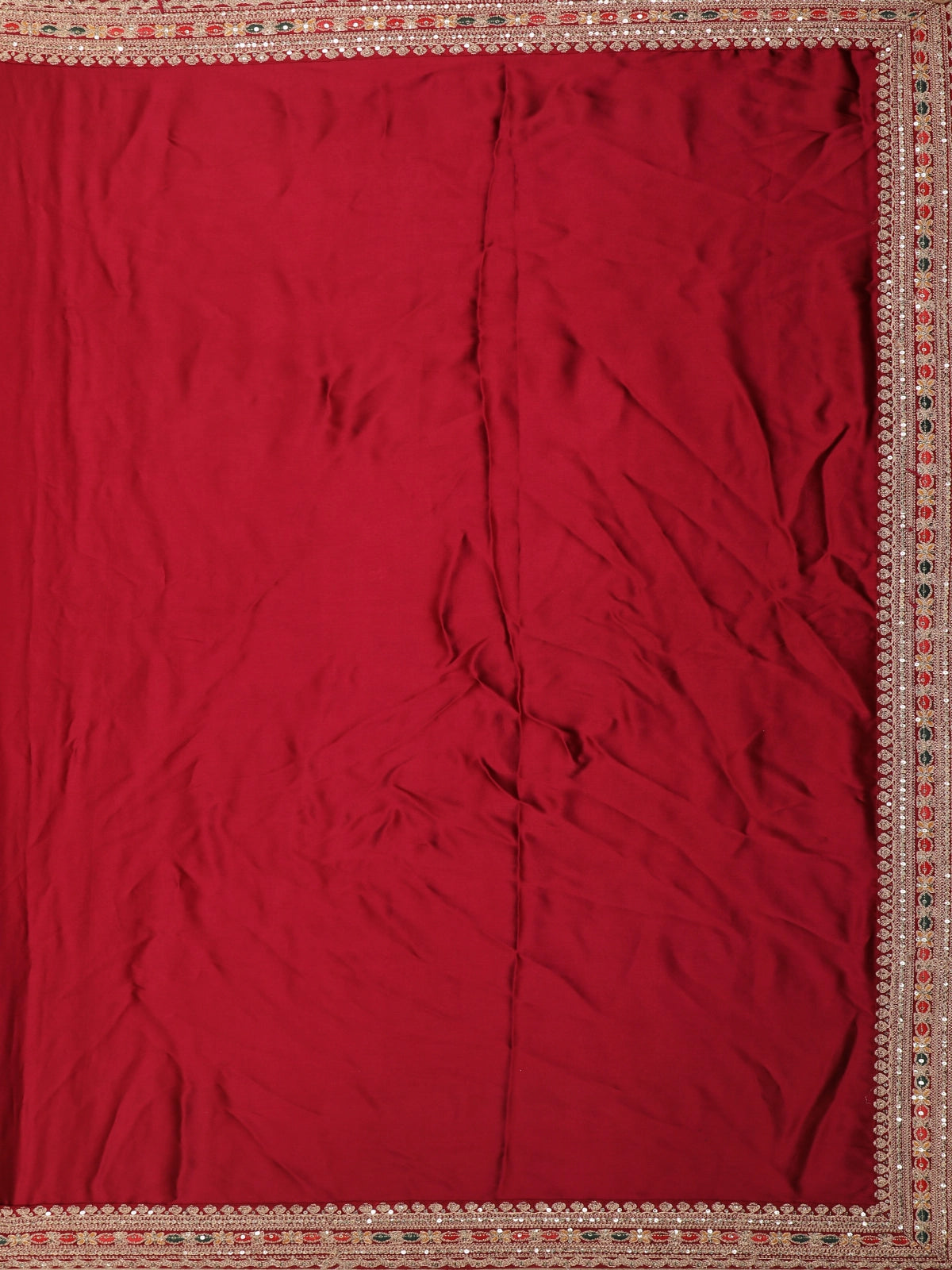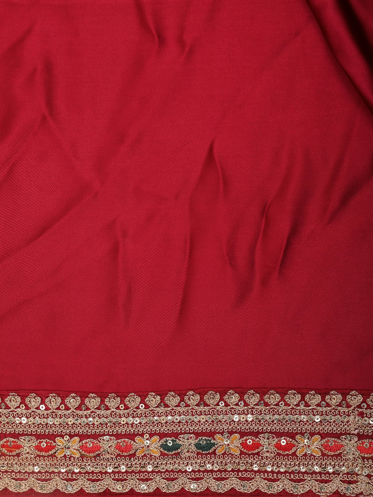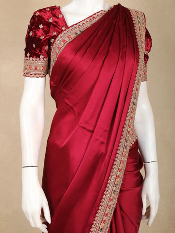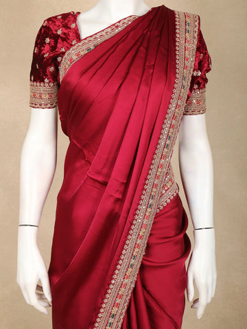 Maroon Solid Design Satin Saree with Embellished Lace Border