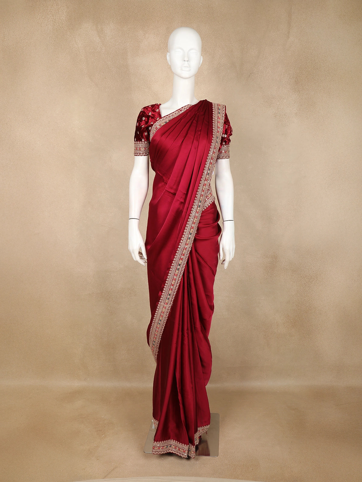 Completed with a matching maroon pallu and blouse, this ensemble is ideal for cocktail parties, festive events, and elegant evening occasions.