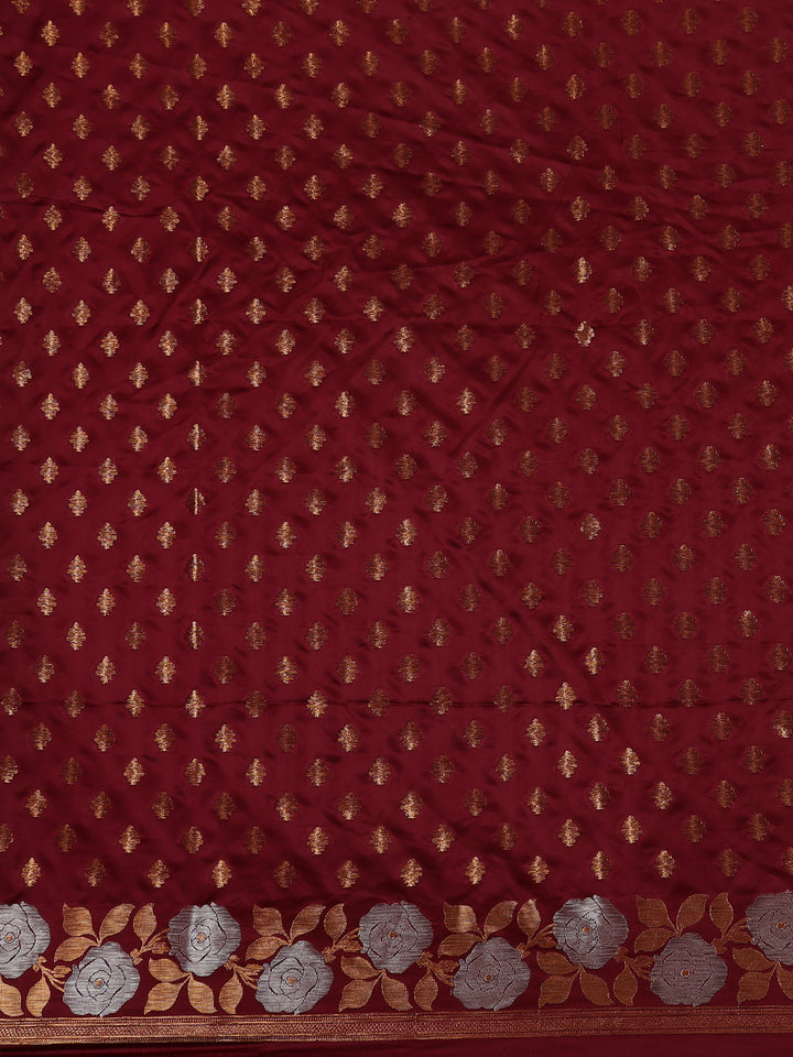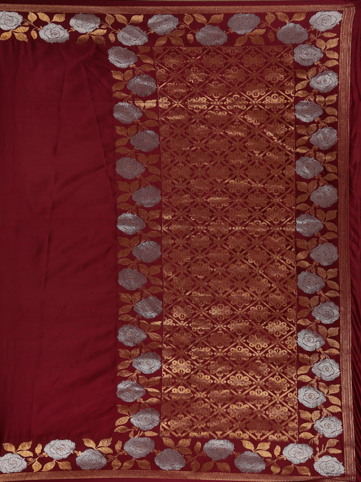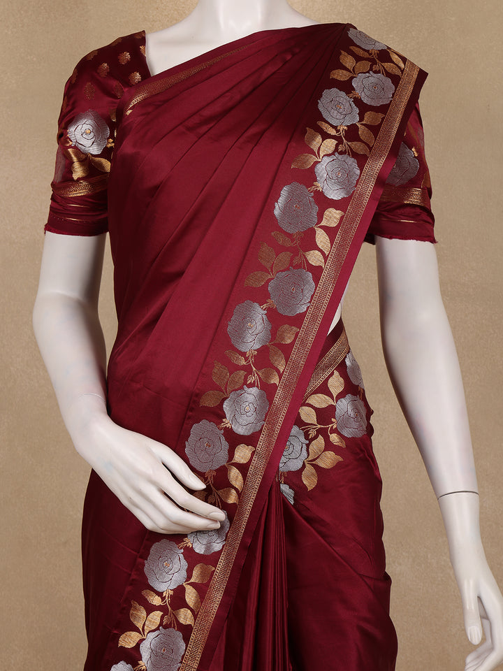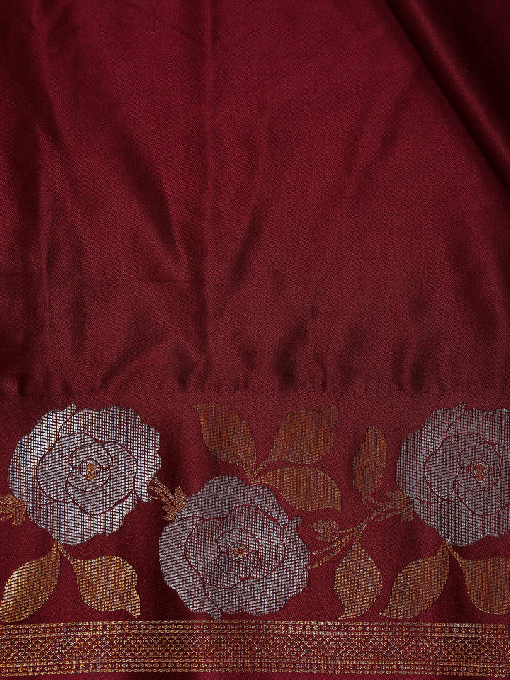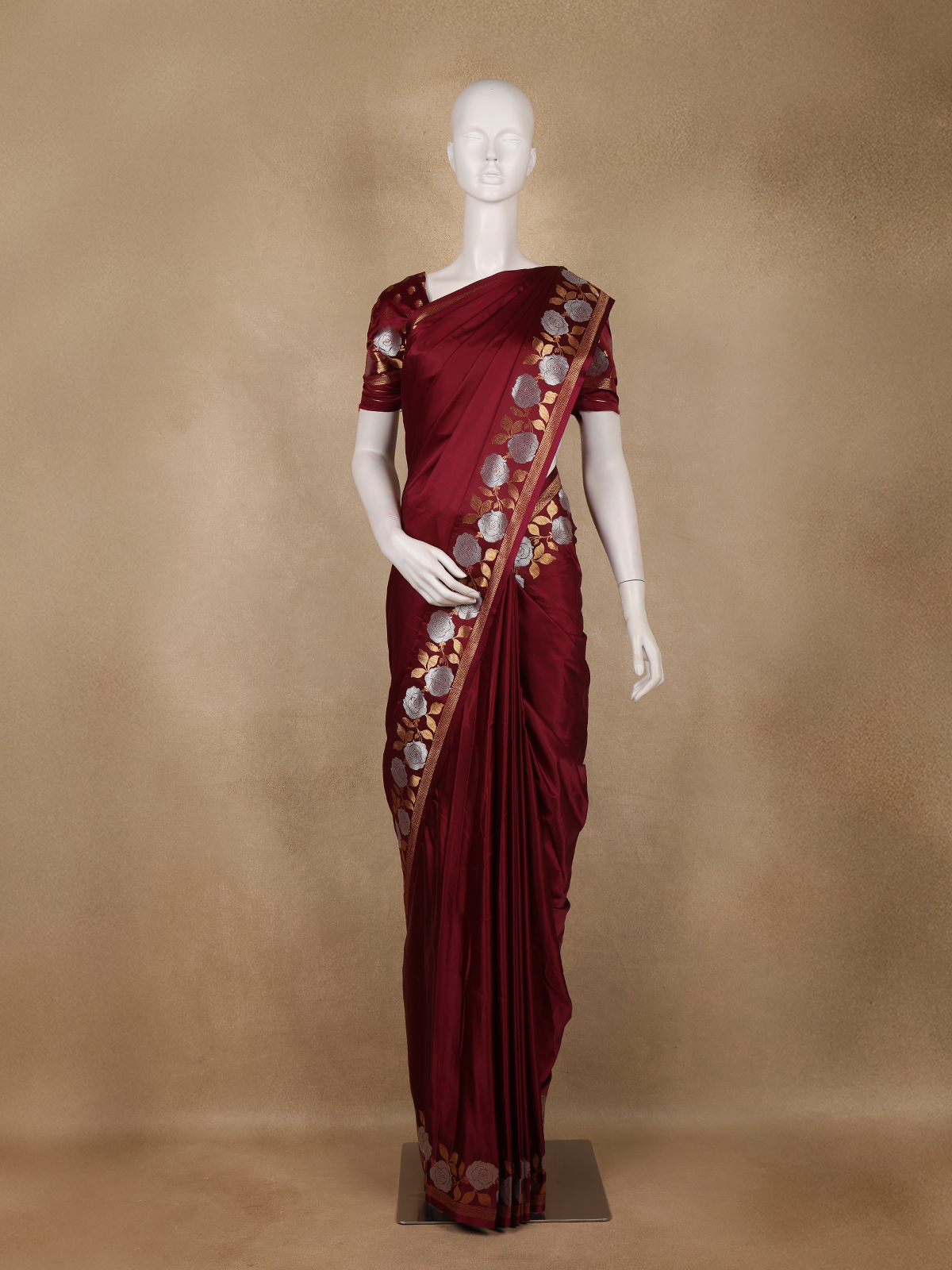 Paired with a matching maroon blouse featuring complementary embroidery accents, this saree is the perfect ensemble for festive occasions, weddings, and cultural celebrations. Its deep maroon tone combined with exquisite embroidery and zari craftsmanship makes it a timeless addition to any ethnic wardrobe.