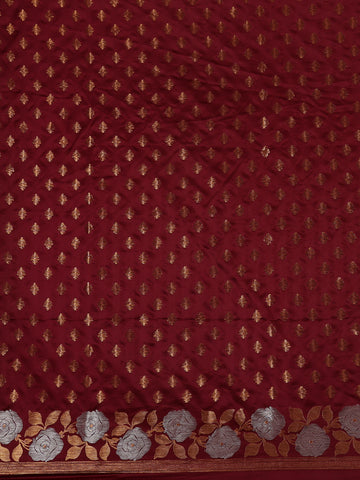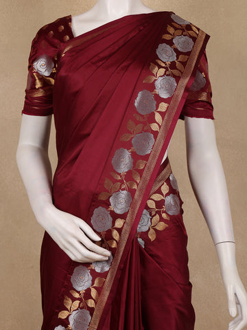 Exude refined elegance with this Maroon Semi Banarasi Silk Saree, designed to bring together traditional charm and modern sophistication. Crafted from semi banarasi silk, the solid maroon body is enriched with delicate embroidery work, adding a graceful dimension to its rich hue. The shimmering zari border frames the drape with a regal finish, while the matching pallu enhances its festive grandeur.