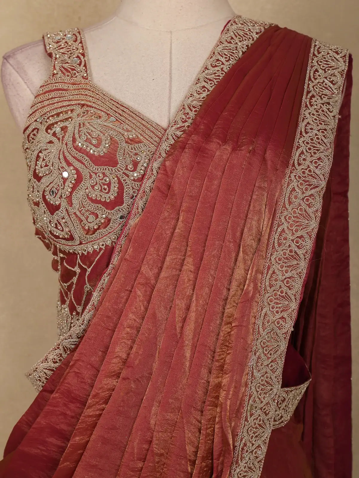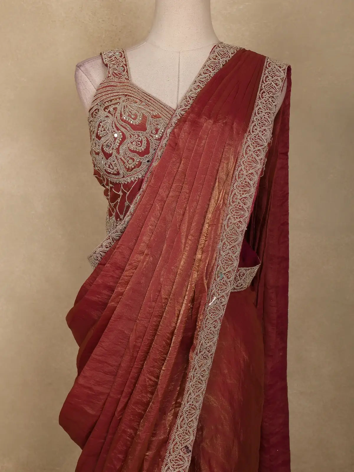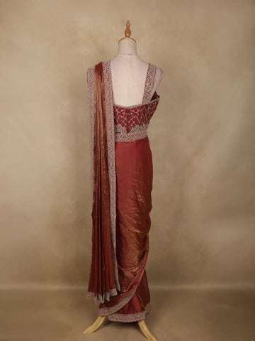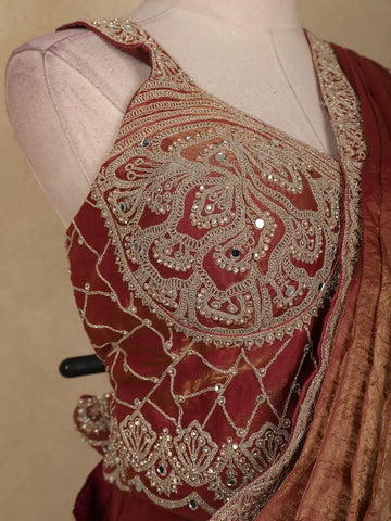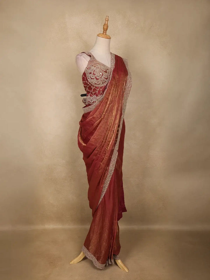 The saree comes with a matching maroon blouse, beautifully detailed with embroidery work, giving it a stylish and festive appeal. With its ready-to-wear format, this saree ensures both comfort and convenience, making it an ideal choice for cocktail parties, festive gatherings, and fancy wear occasions.