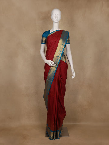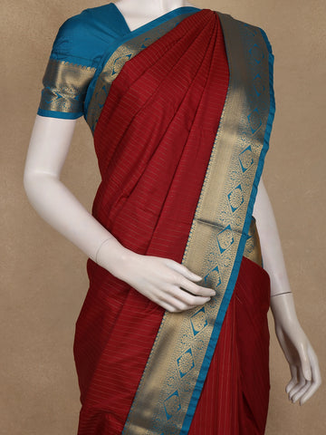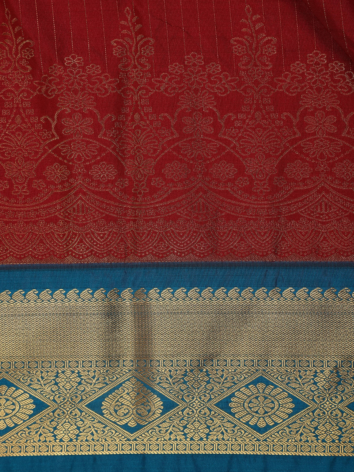 Maroon Striped Design Semi Silk Saree with Contrast Teal Blue Zari Border