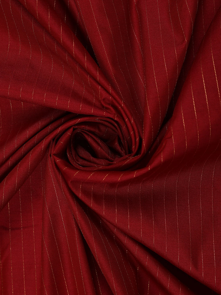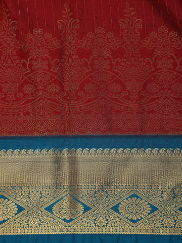 Drape yourself in classic grandeur with this Maroon Striped Design Semi Silk Saree, a perfect harmony of elegance and tradition. The deep maroon body showcases fine woven stripes that enhance its sophisticated texture. Accentuating the saree’s beauty is the contrast teal blue zari border, adorned with intricate motifs and a subtle golden shimmer that elevates the overall look.